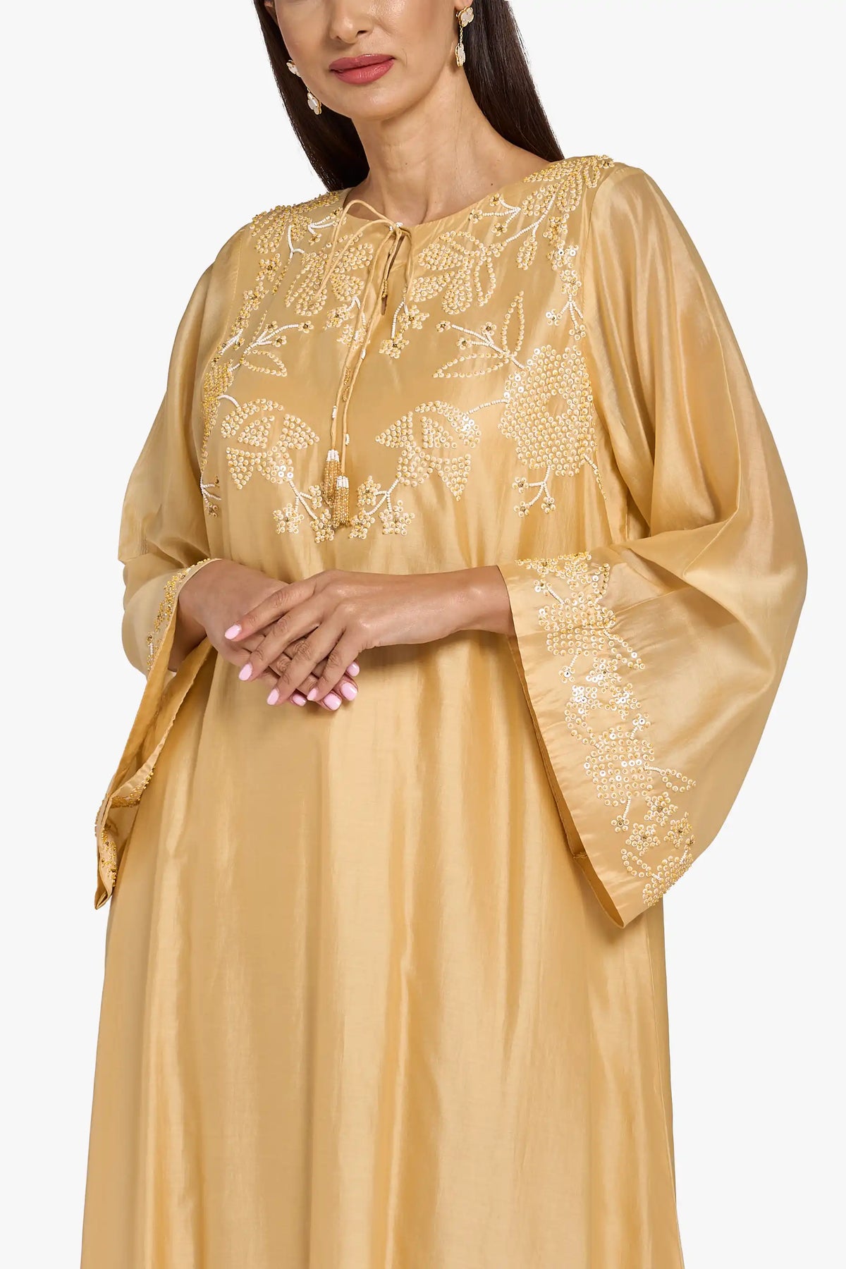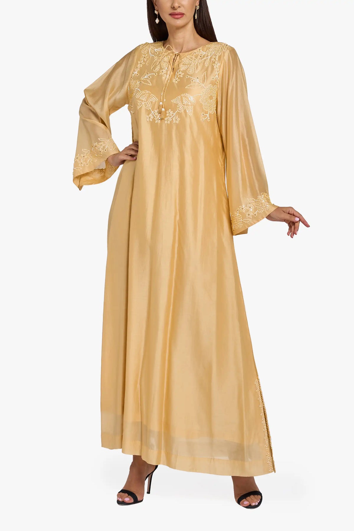 This kaftan comes in a dark mustard yellow color. It has delicate handwork with sequins and beads on the neckline and sleeves. The design includes a side slit and a flowy, elegant look, making it perfect for special occasions.