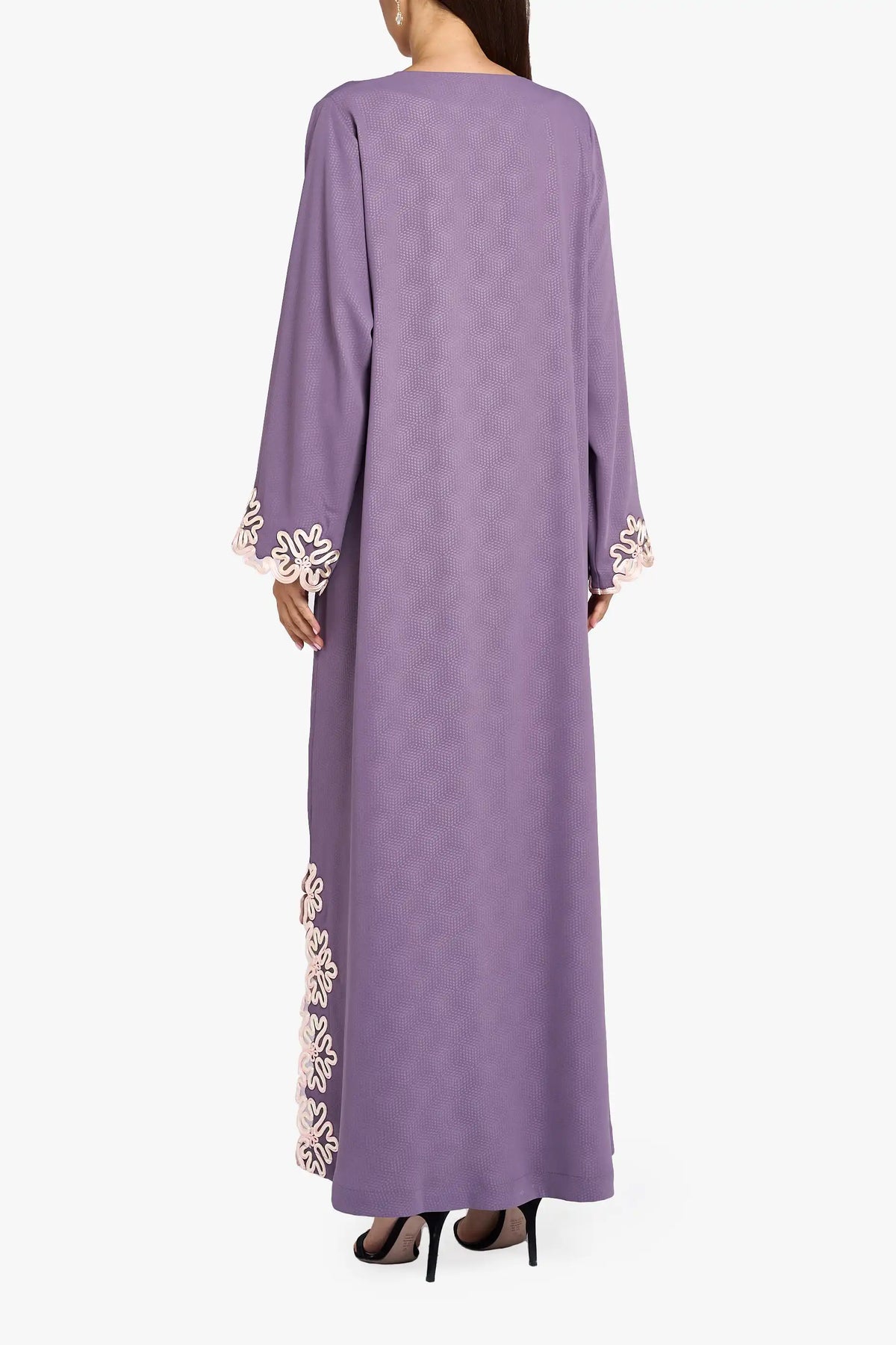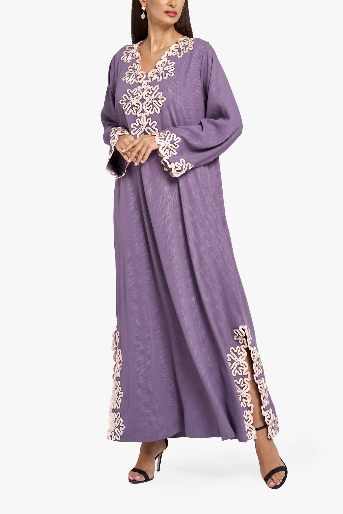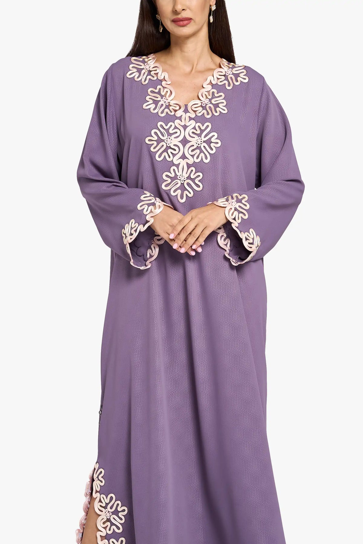 This mkhawar is made from soft crepe fabric in a lavender color. It has embroidery on the neckline, sleeves, and side slit, giving it an elegant and stylish look.