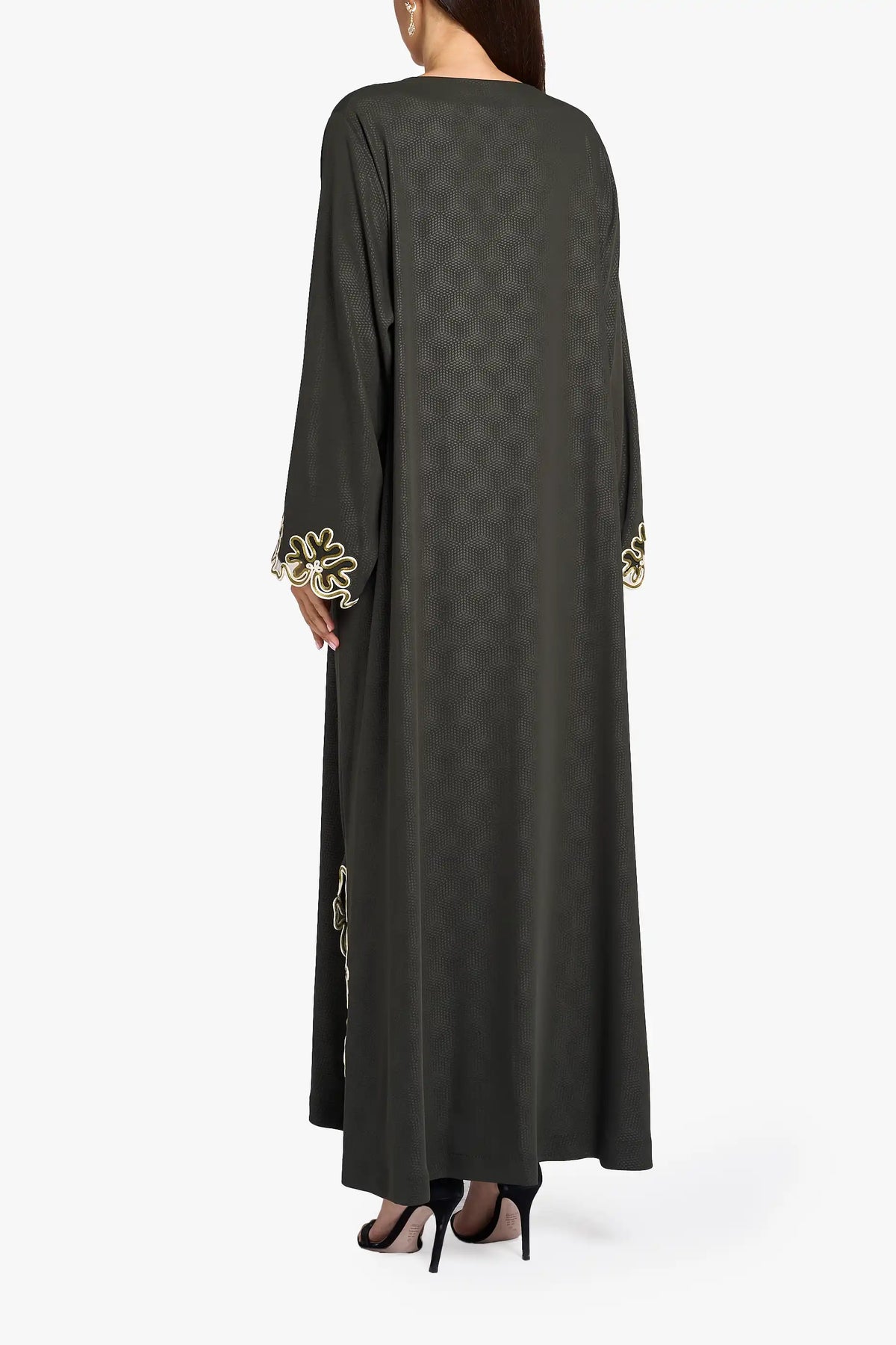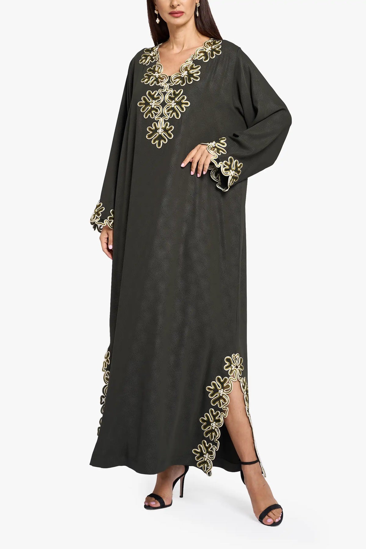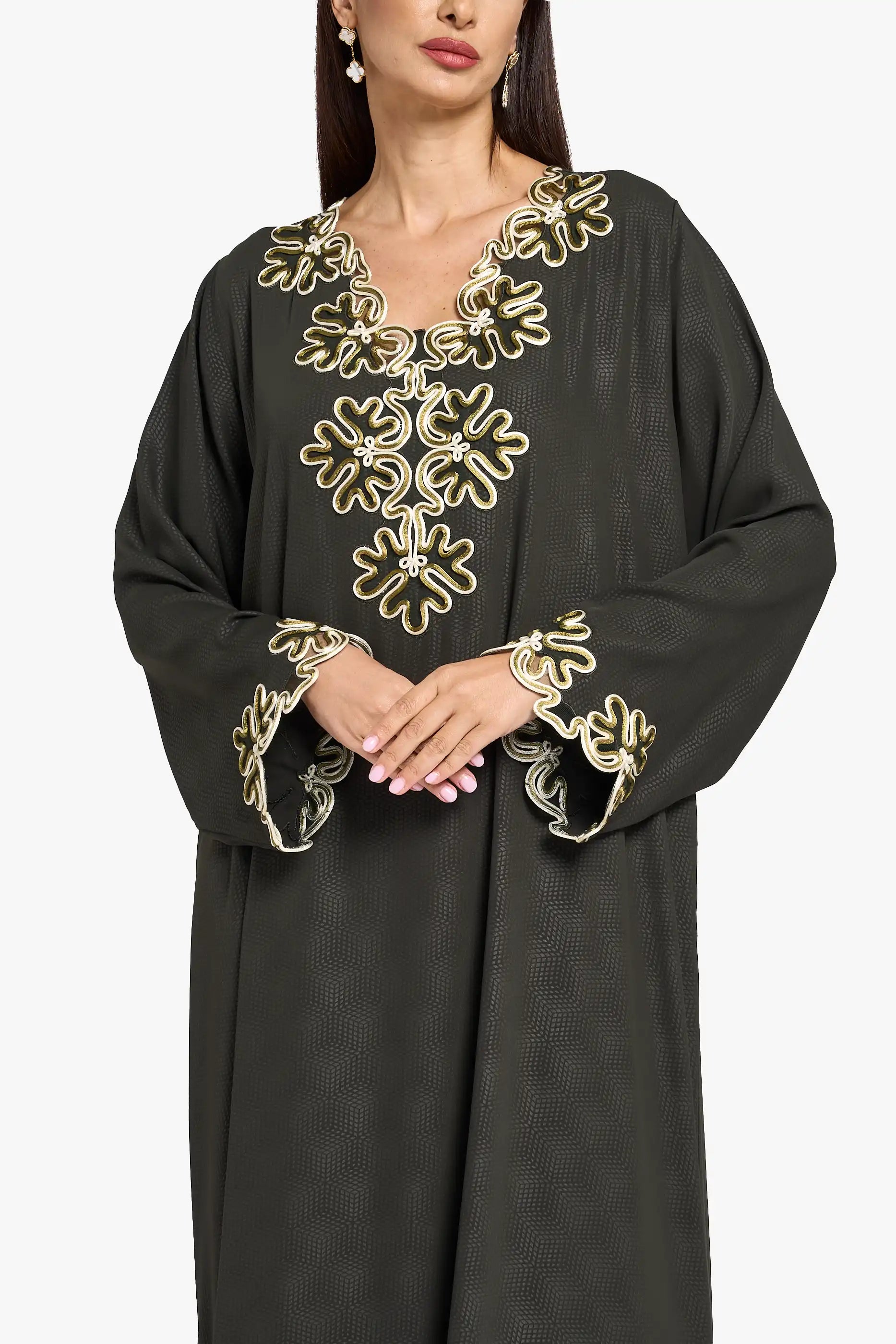 This mkhawar is made from soft crepe fabric in a rich emerald, green color. It has embroidery on the neckline, sleeves, and side slit, giving it an elegant and stylish look.