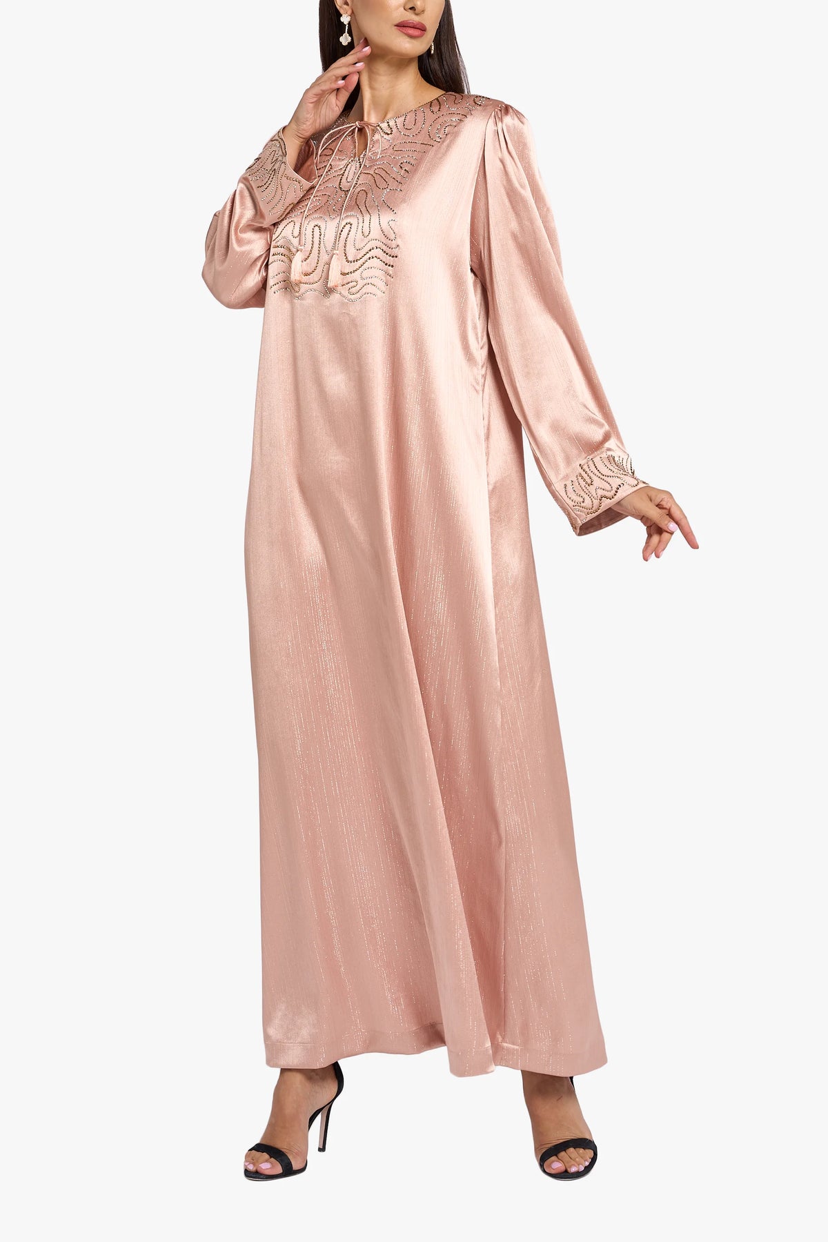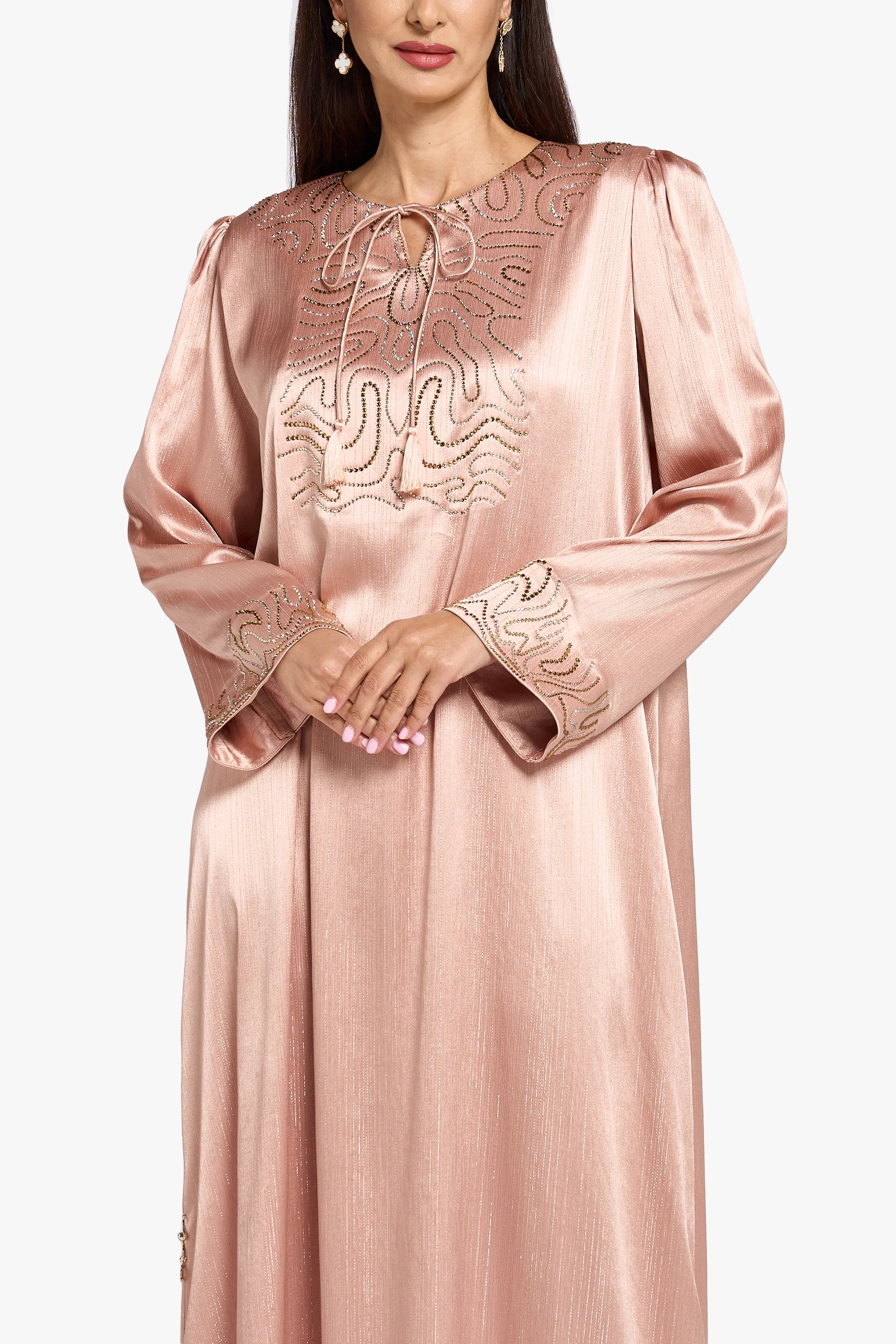 This Mkhawar is made of silky crepe fabric in a soft peach color, with crystal details on the neck and sleeves for a simple and elegant look.