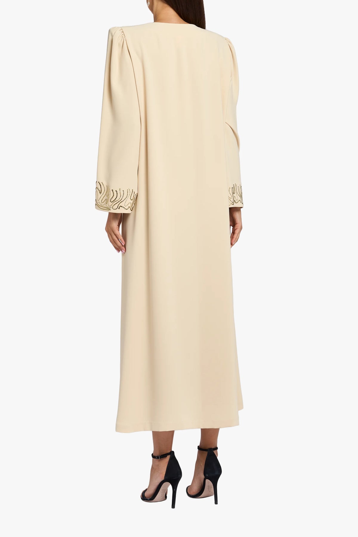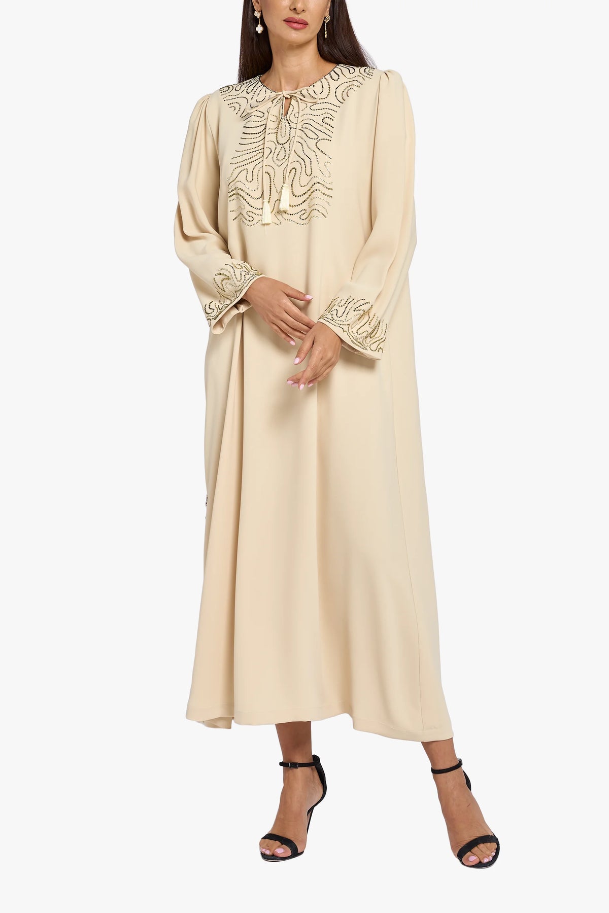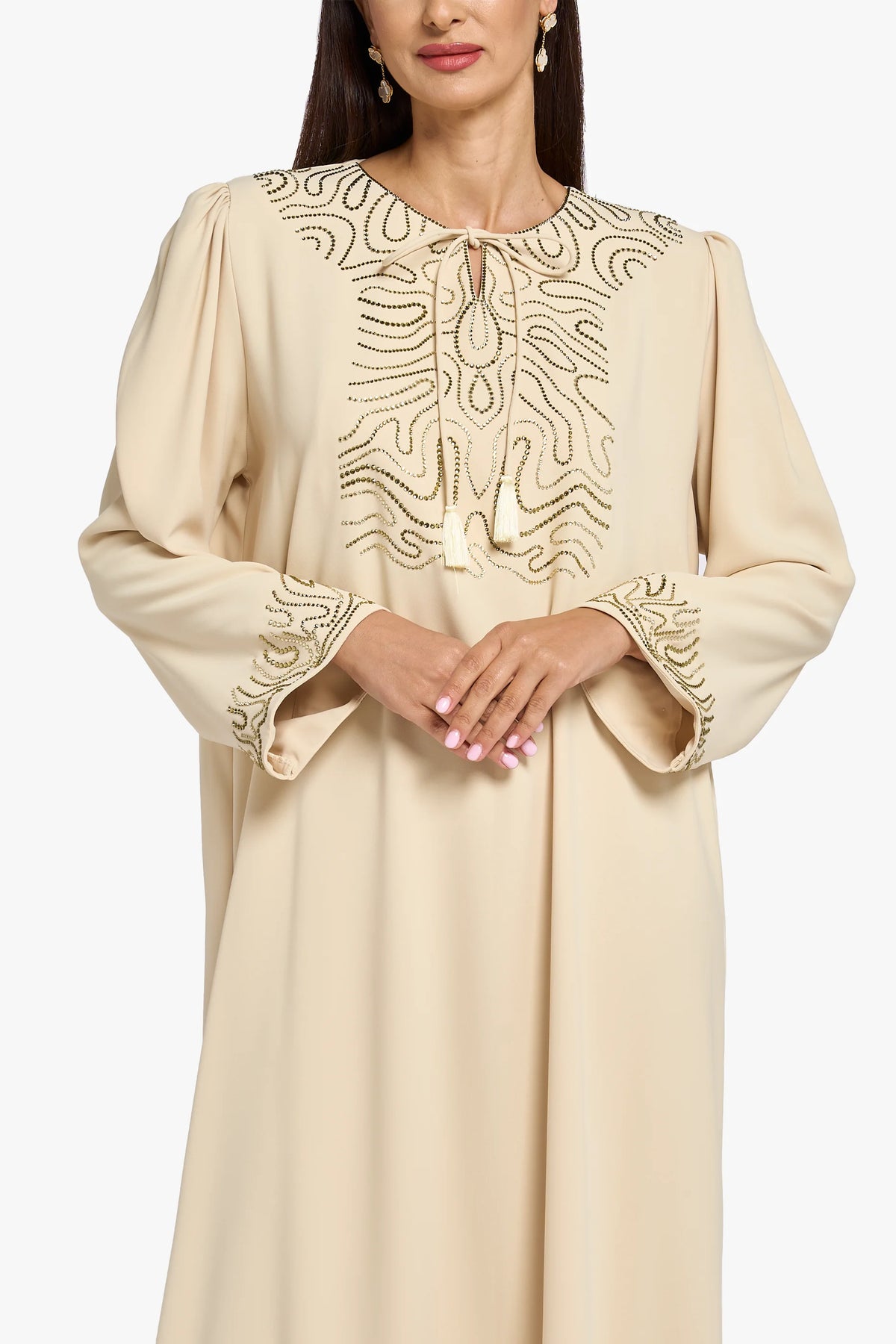 This Mkhawar is made of silky crepe fabric in a soft beige color, with crystal details on the neck and sleeves for a simple and elegant look.
