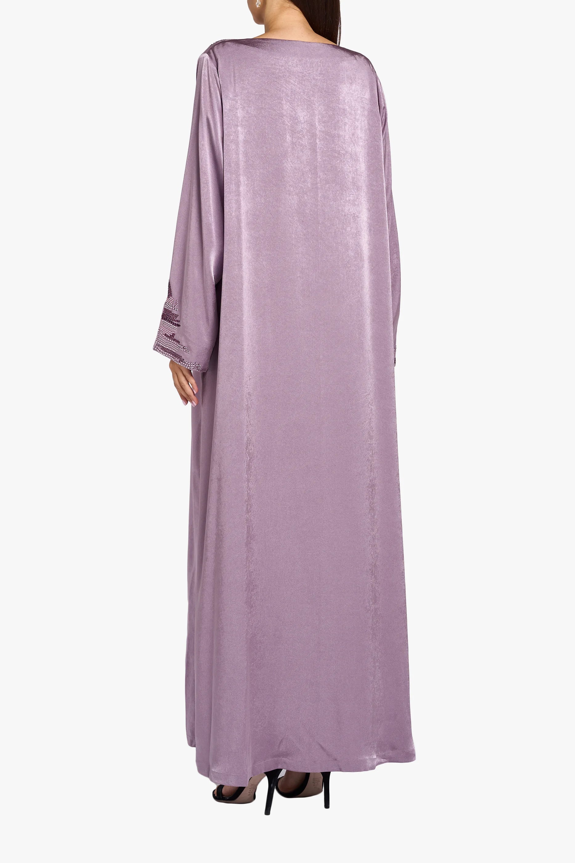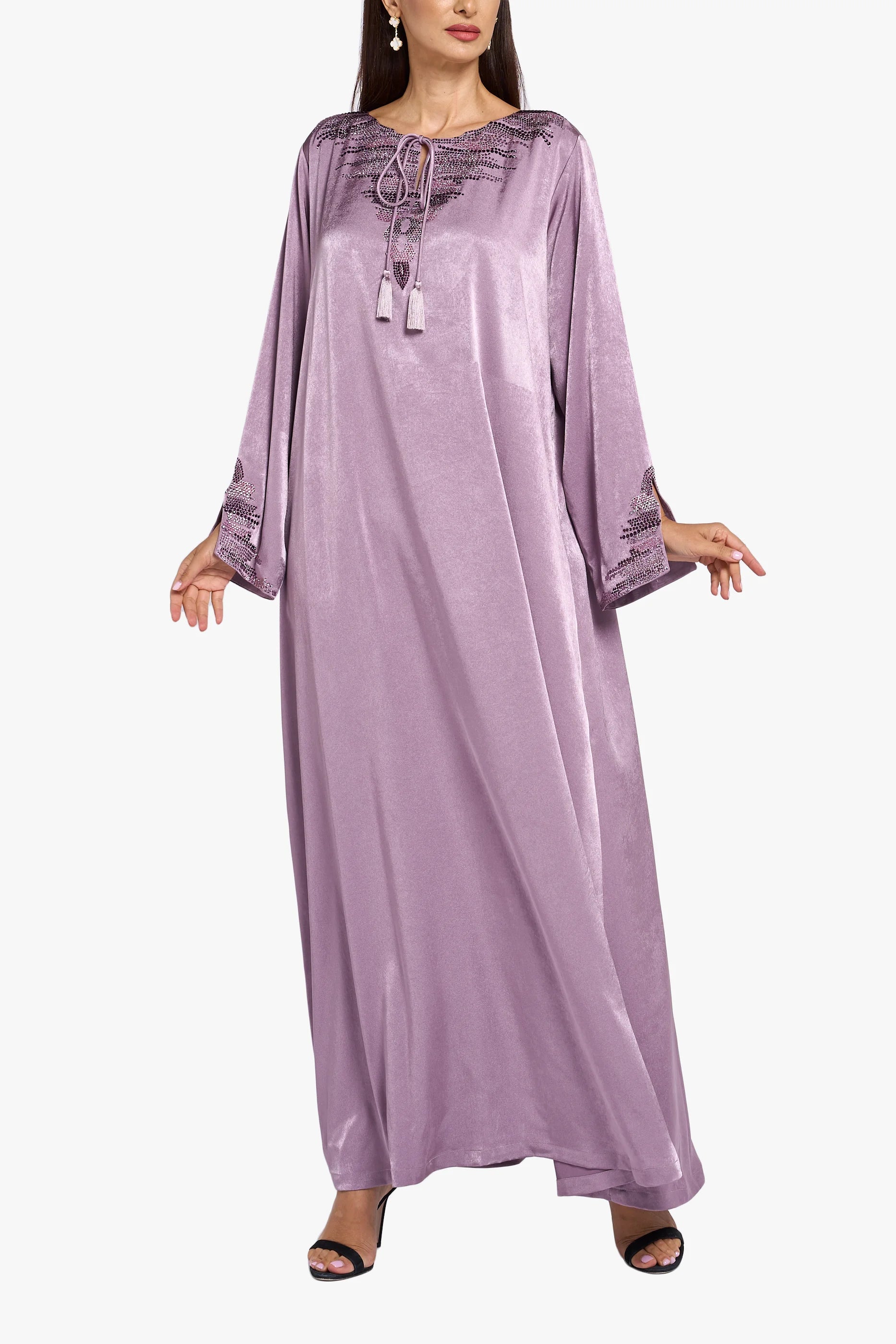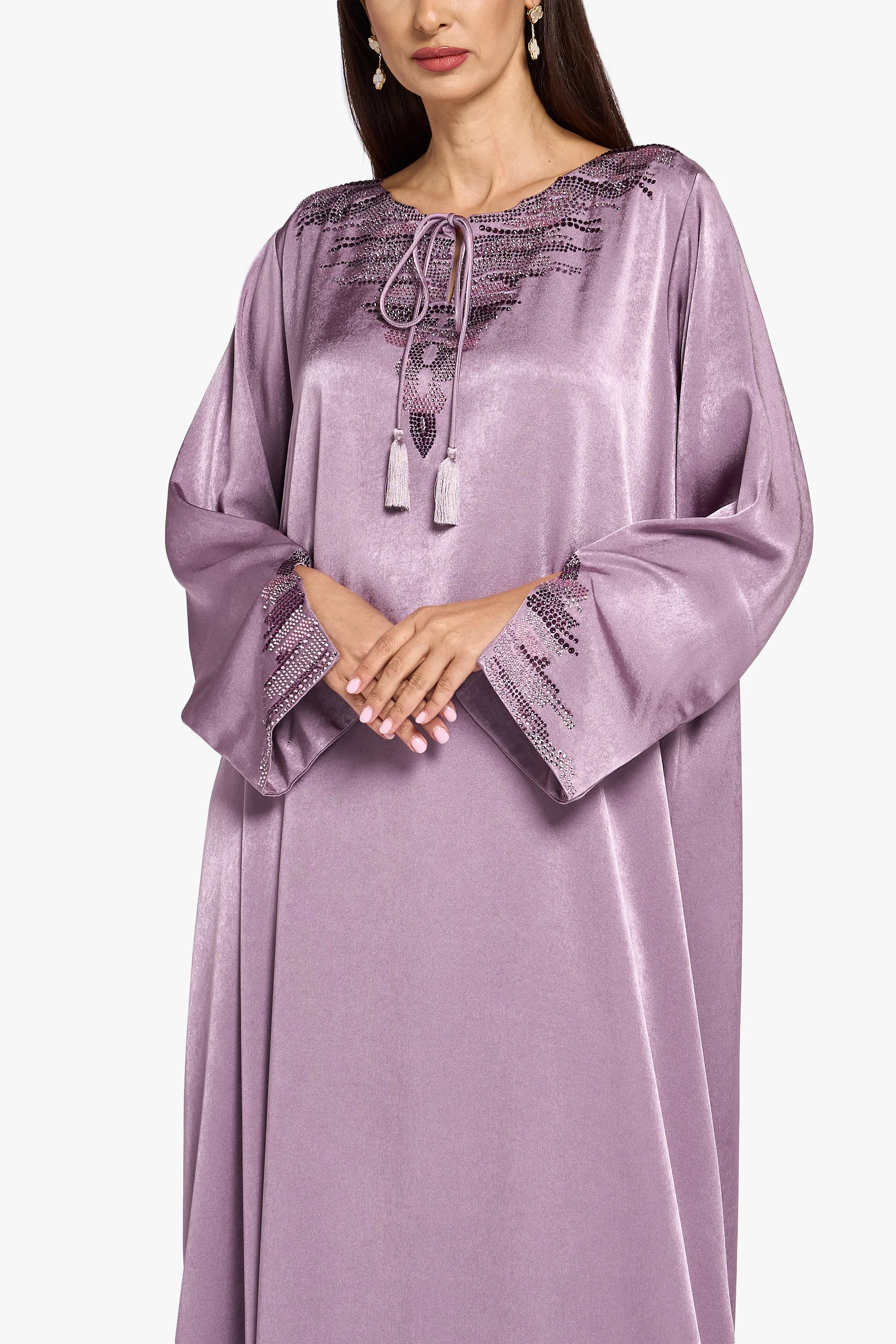 This mkhawar comes in a light pink color with crystal work on the neck and sleeves. It has a flowy and elegant style.