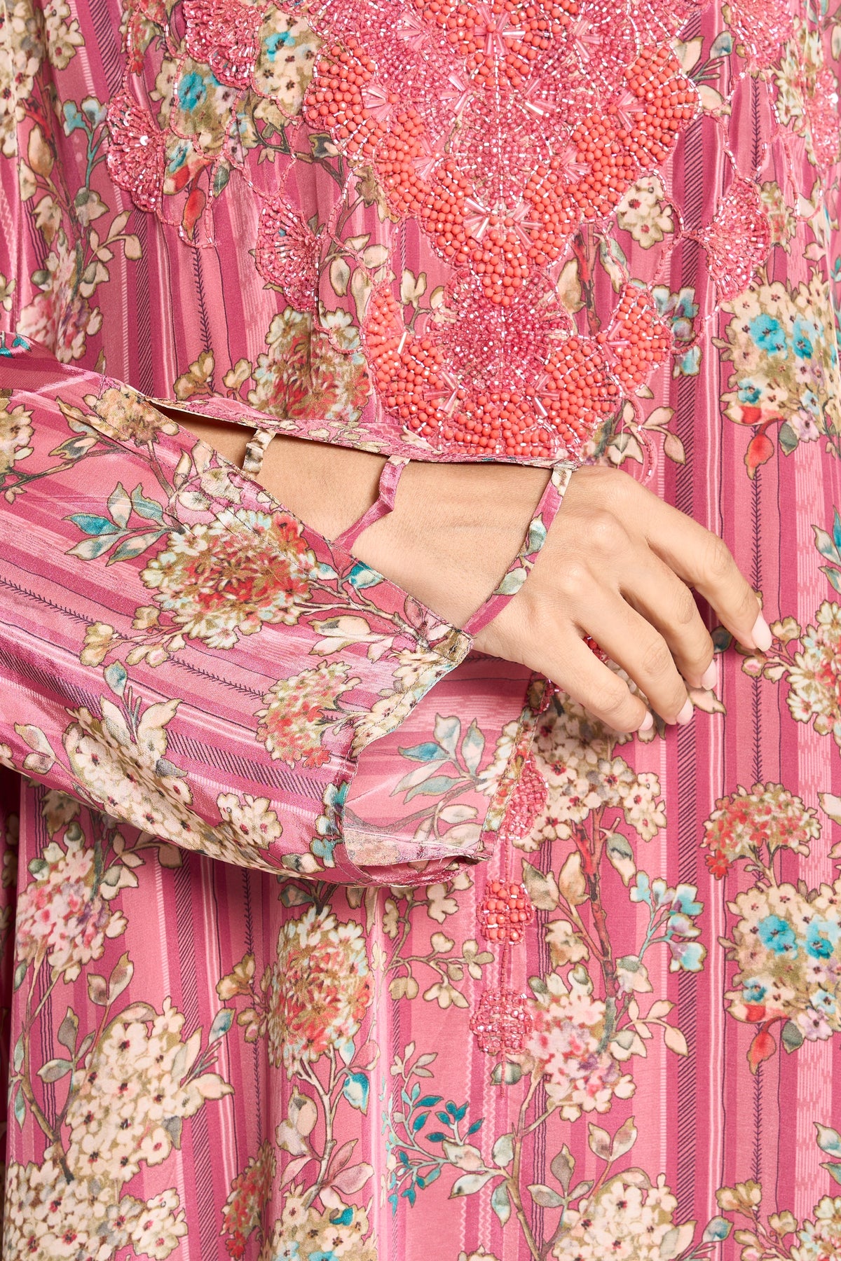 This pink printed poly crepe fabric showcases intricate hand beading from the neckline to the waistline, adding refined elegance. Designed with long flared sleeves and a flattering V-neckline, it combines style and sophistication, offering a graceful silhouette suitable for formal or festive occasions. The breathable crepe material ensures comfort while maintaining a luxurious appearance.