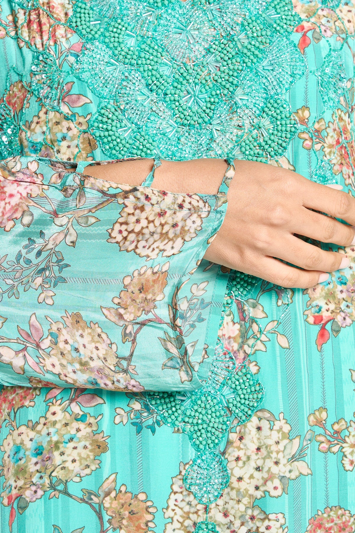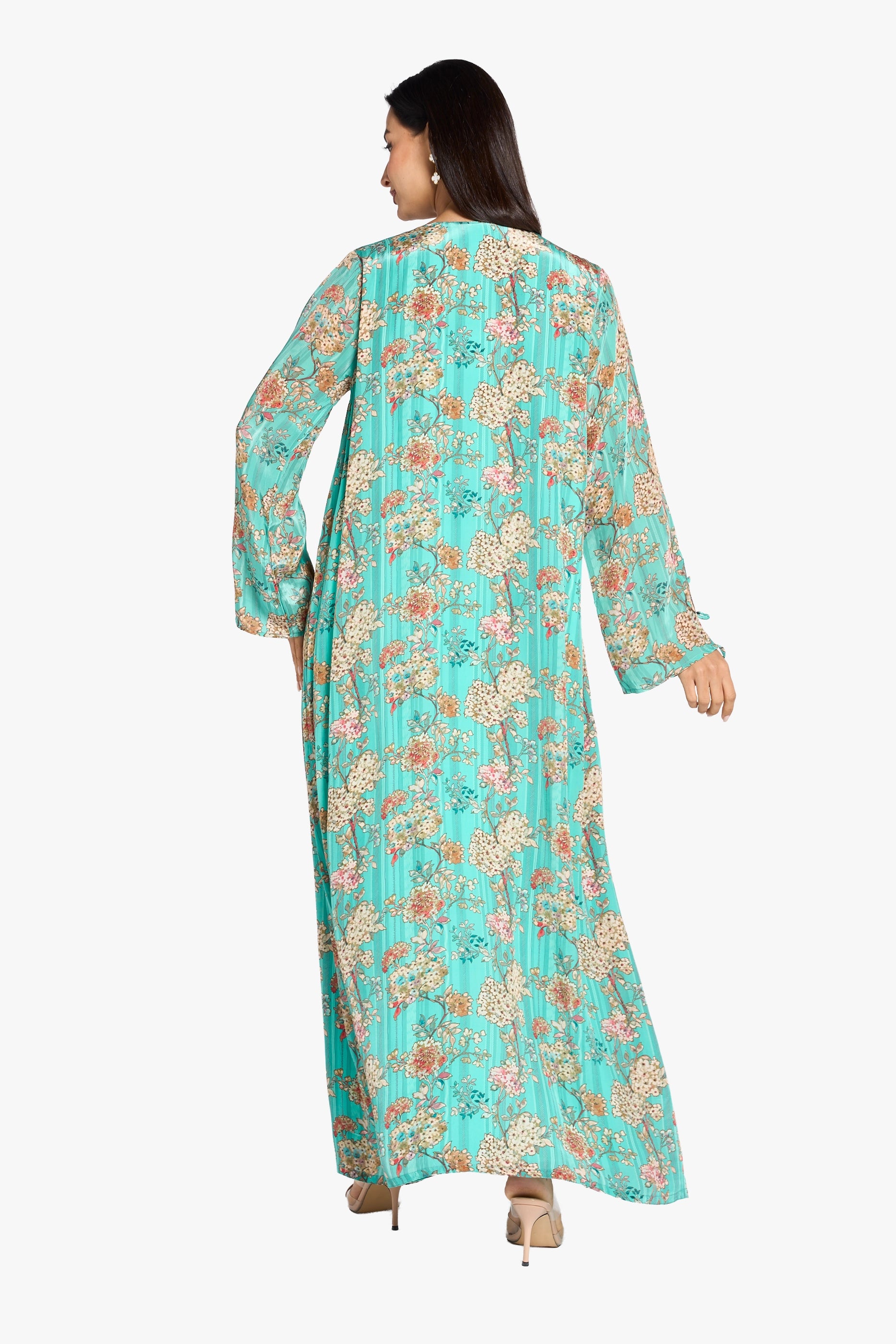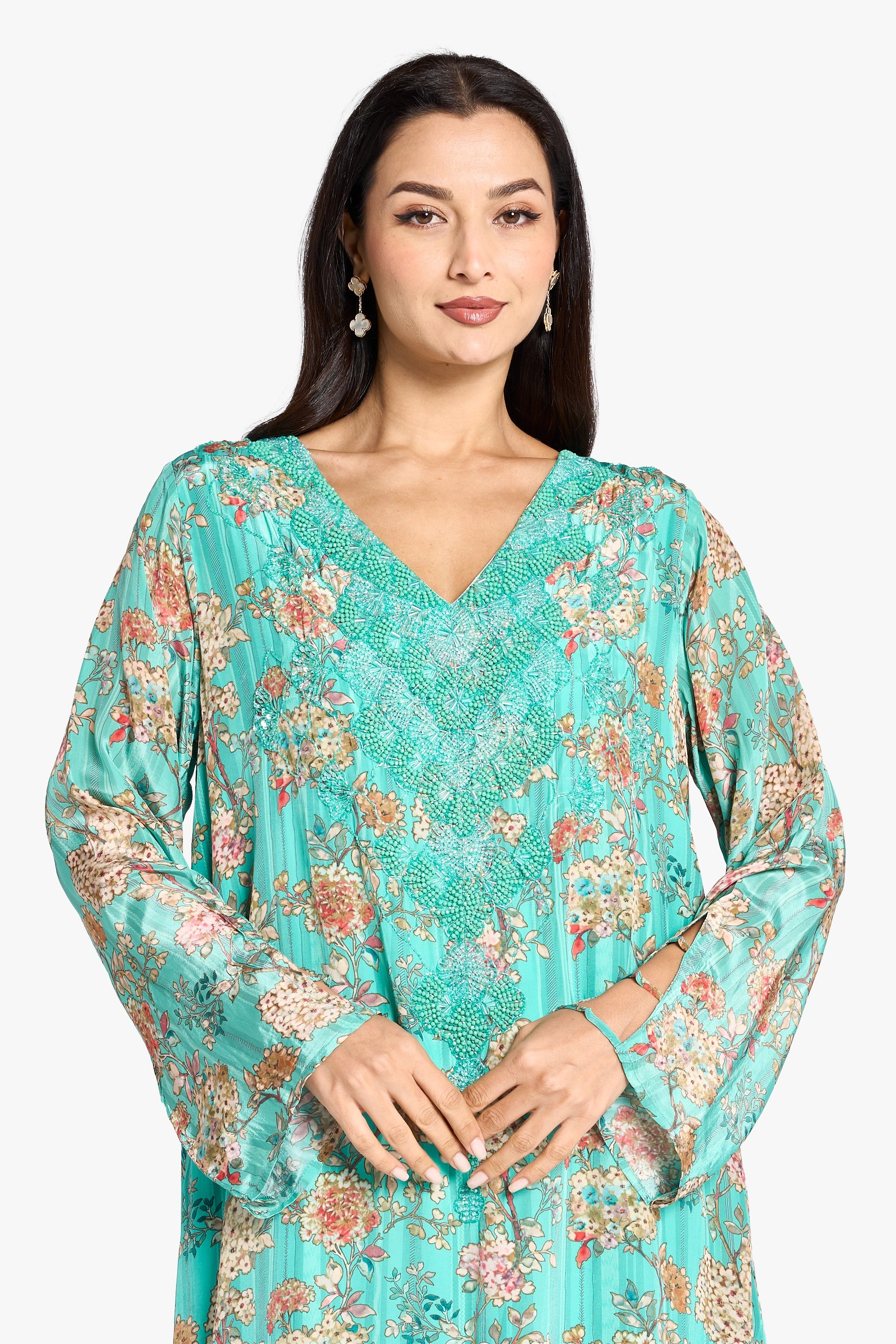 Crafted from flowing turquoise poly crepe, this Jalabiya showcases intricate hand beading from the neckline to the waistline, adding elegant detail. The long flared sleeves and V-neckline enhance its graceful silhouette, blending traditional design with refined craftsmanship for a striking and comfortable kaftan.