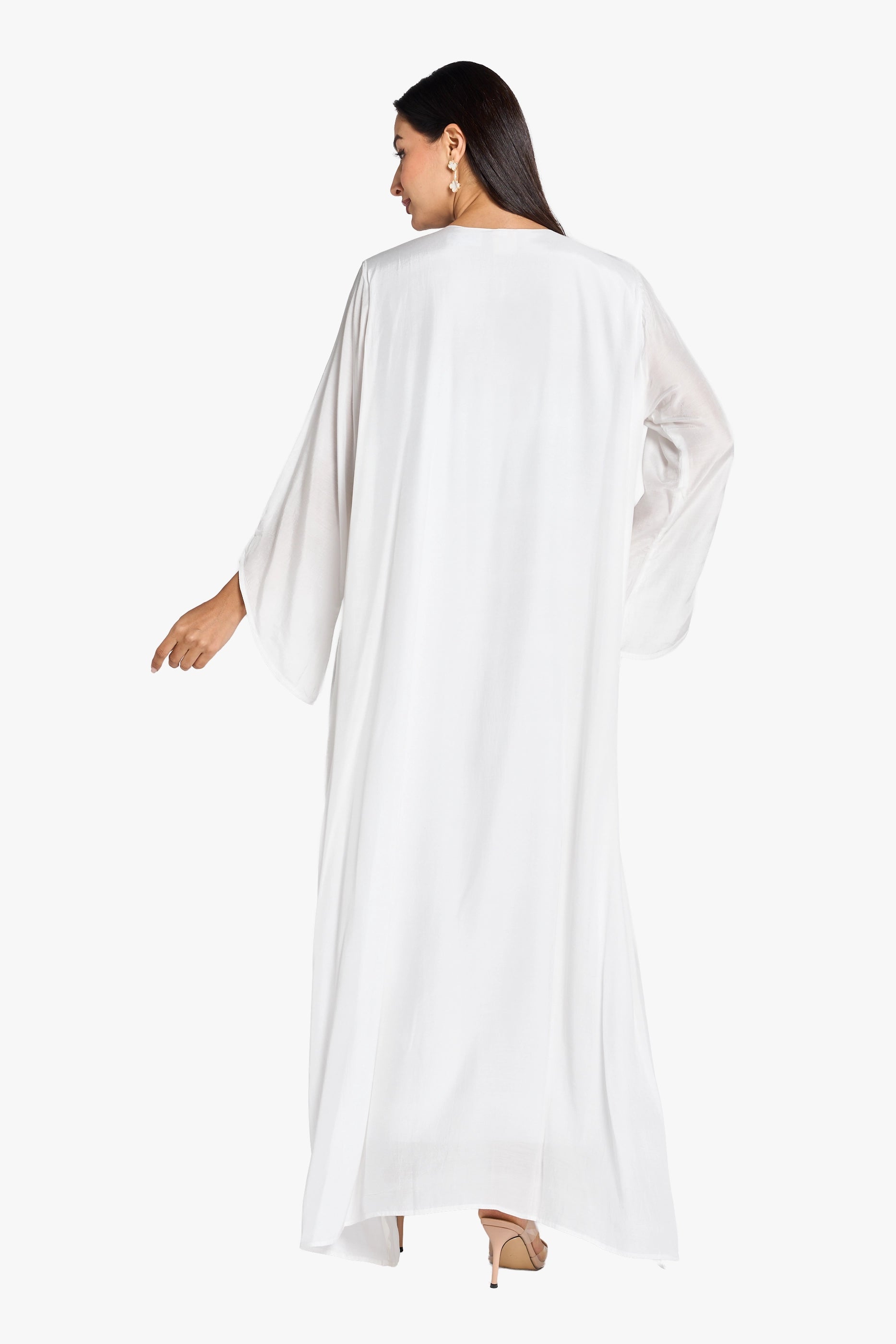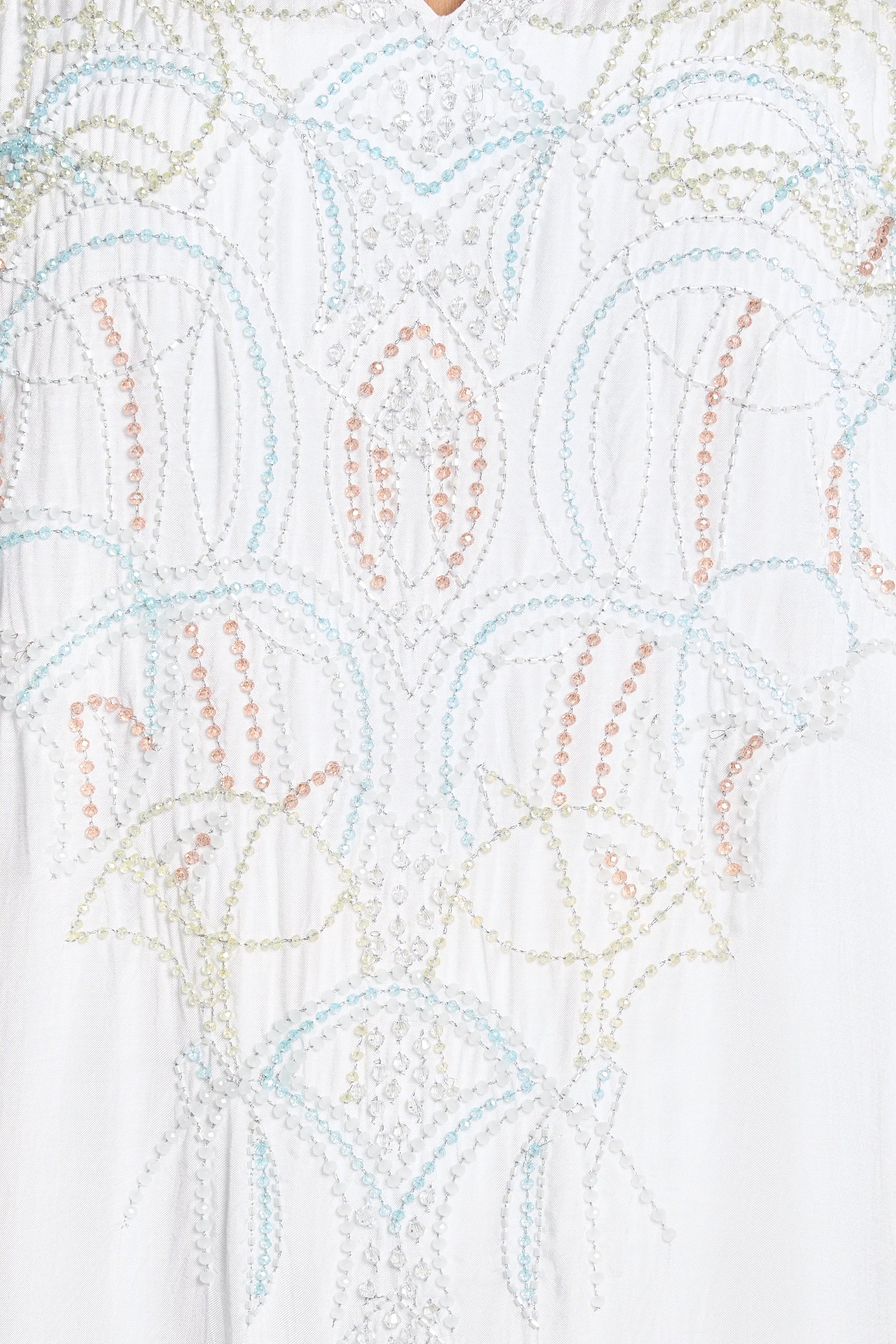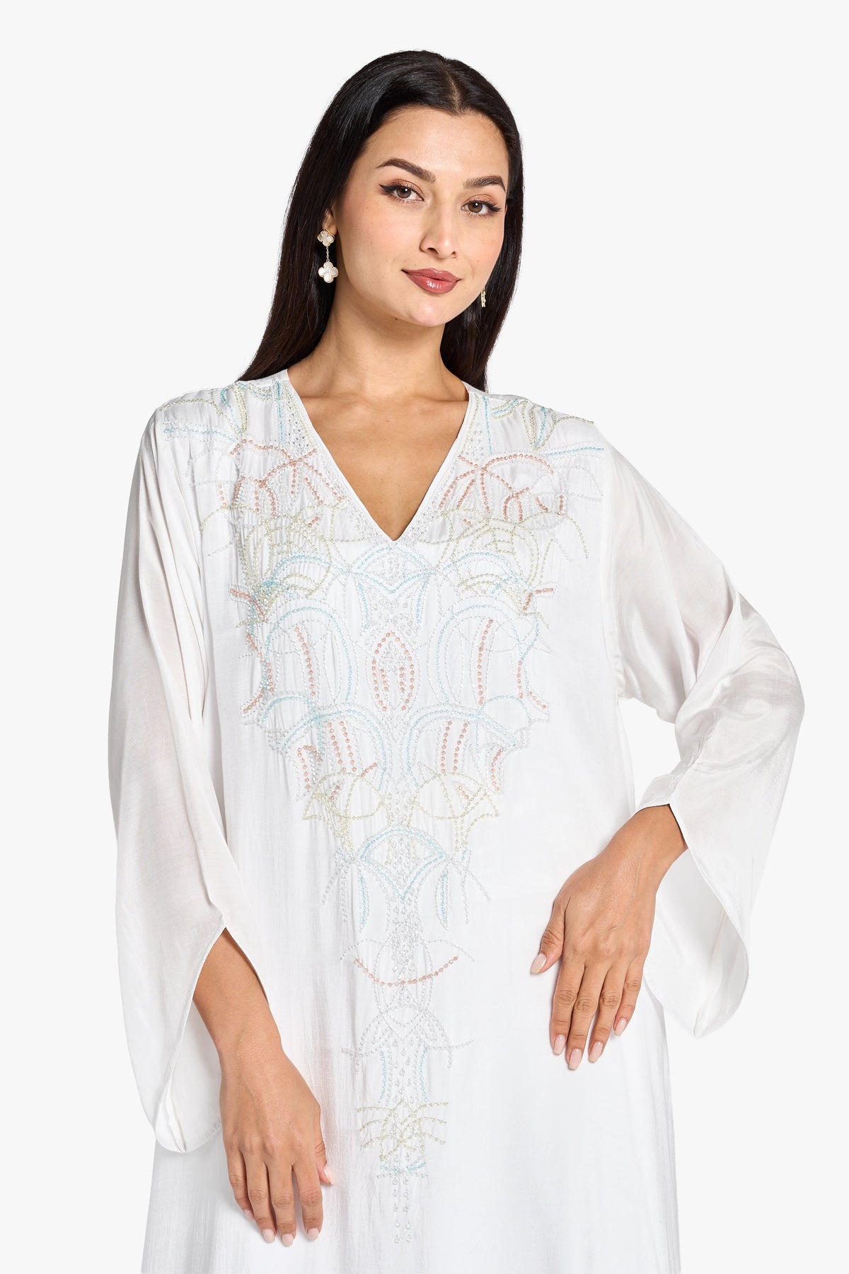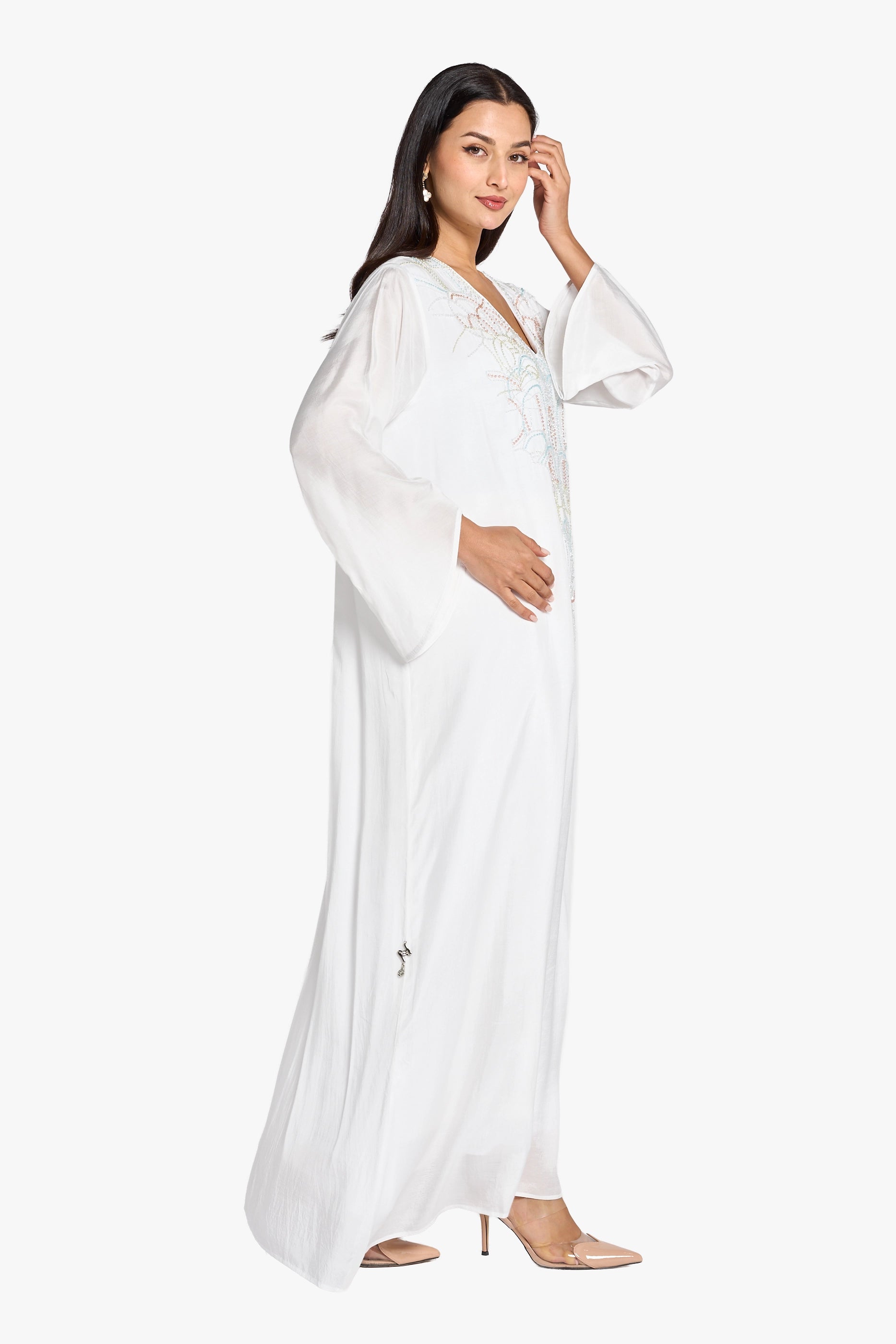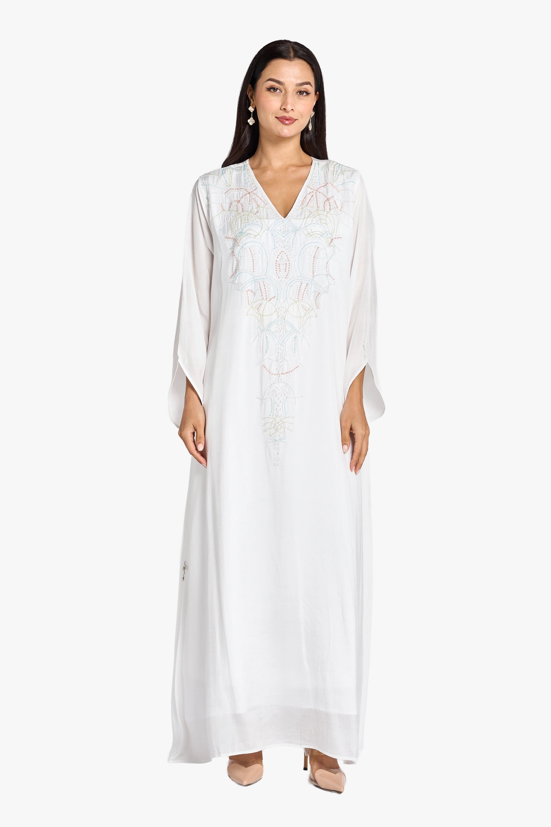 This elegant kaftan is crafted from breathable white linen, offering comfort and a refined look. It features intricate handbeading that extends from the neckline down to the waist, adding a delicate touch of sophistication. Designed with a flattering V-neckline and long sleeves, this piece balances modesty with style, perfect for both casual and formal occasions.