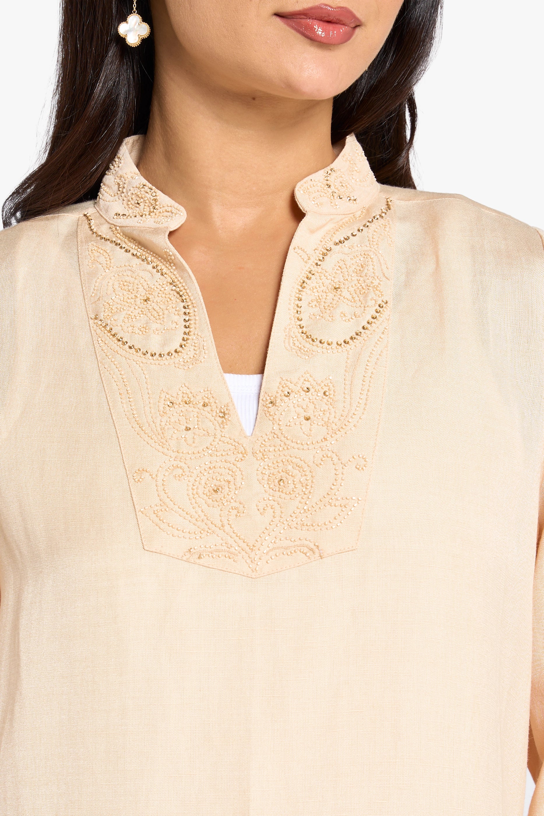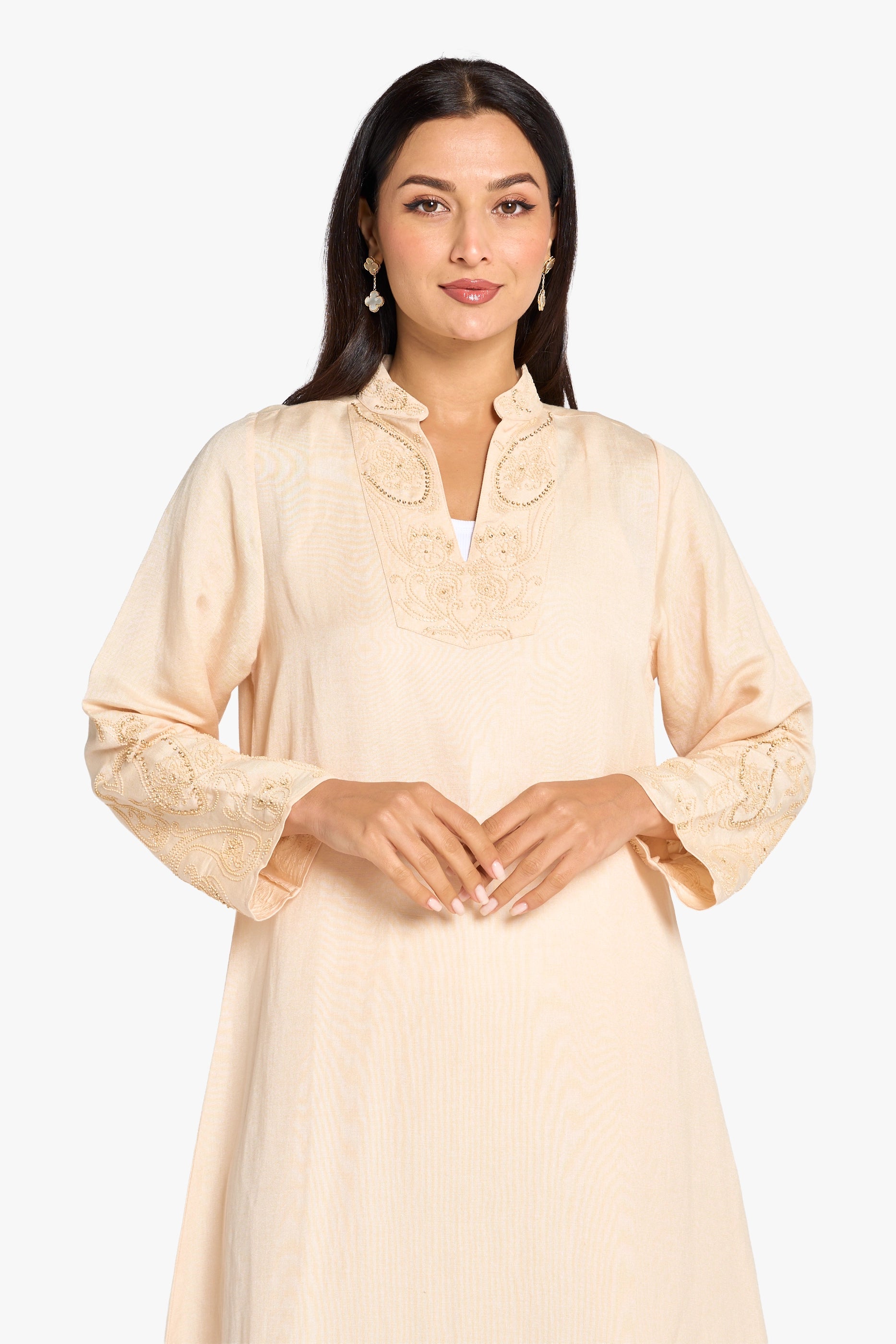 Crafted from soft peach linen, this daily wear kafan offers comfort and elegance. The delicate beading along the neck and sleeves adds a refined touch, while the collar with a V-neckline enhances its sophisticated silhouette. Ideal for everyday use, this piece balances style with breathable fabric for all-day wearability.