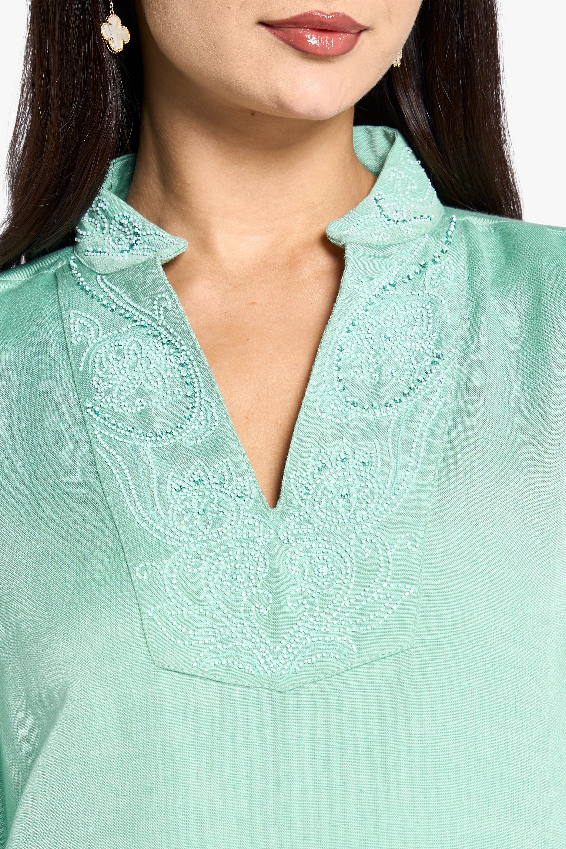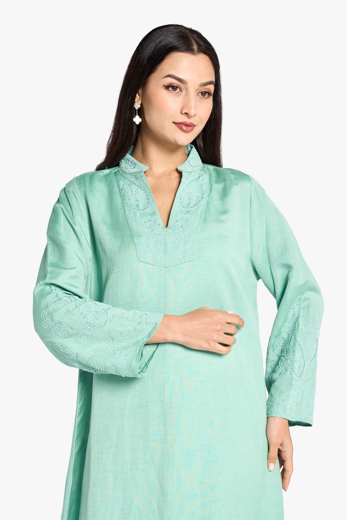 Crafted from turquoise linen, this daily wear kafan combines comfort with subtle elegance. The delicate beading along the neck and sleeves adds refined detail without overwhelming the breathable fabric. Featuring a collar with a flattering V-neckline, this design offers both style and ease, making it ideal for everyday sophistication.
