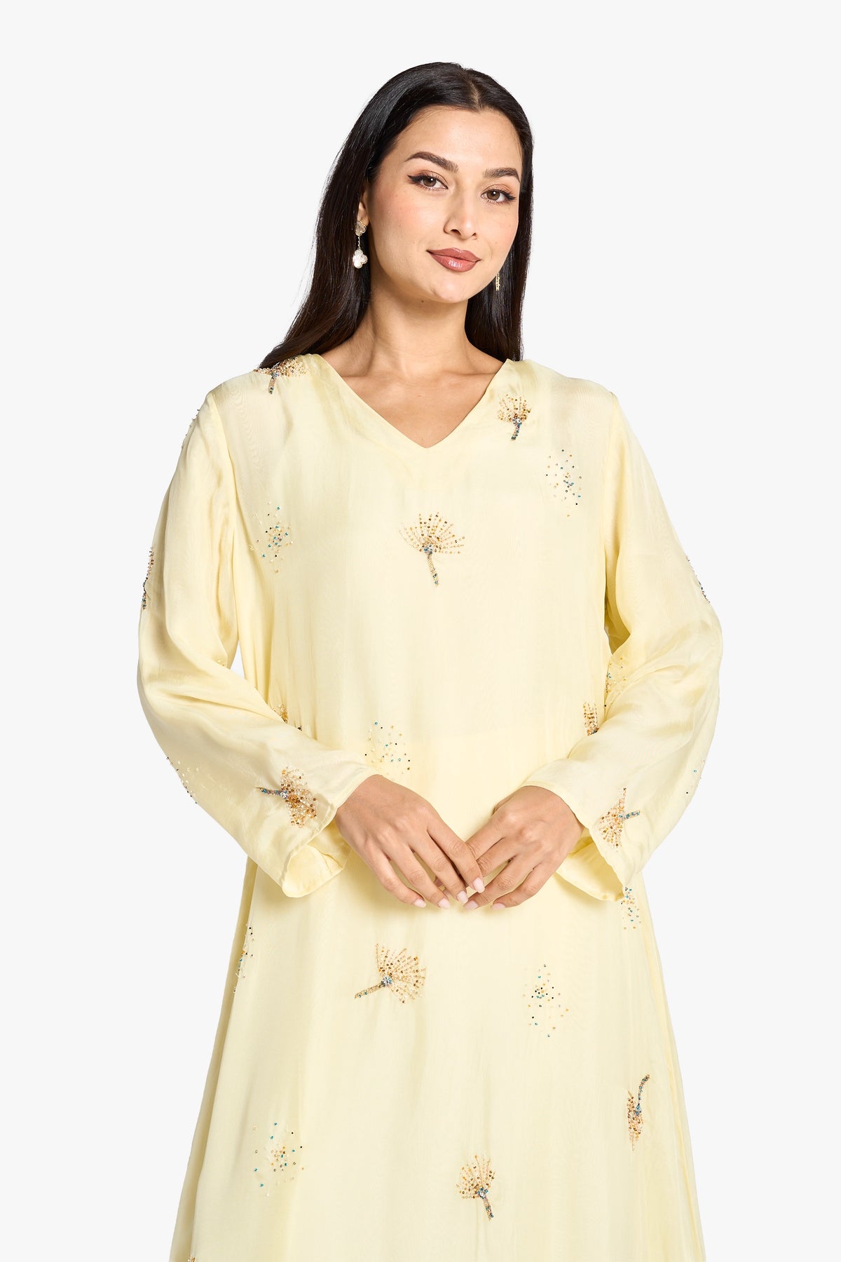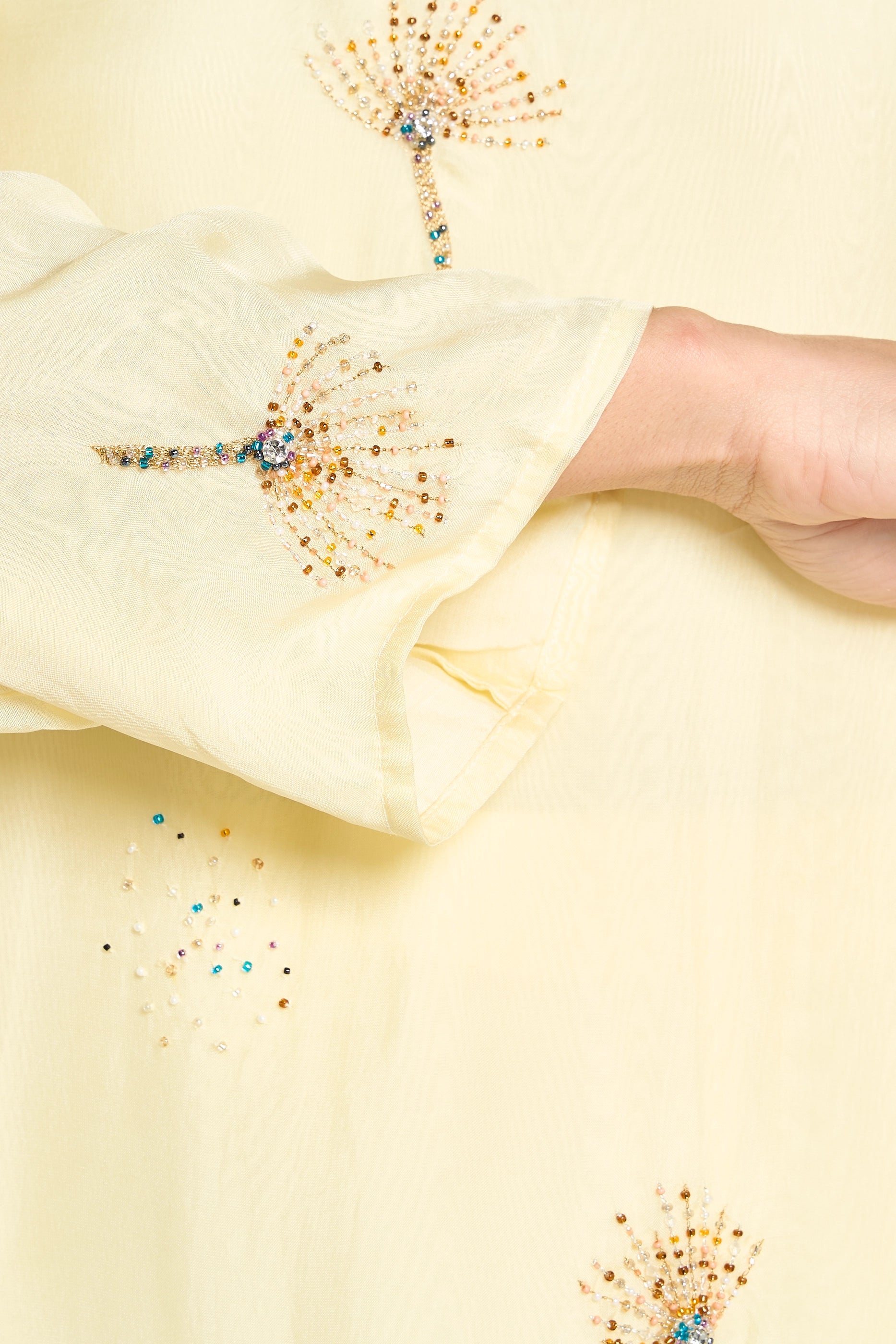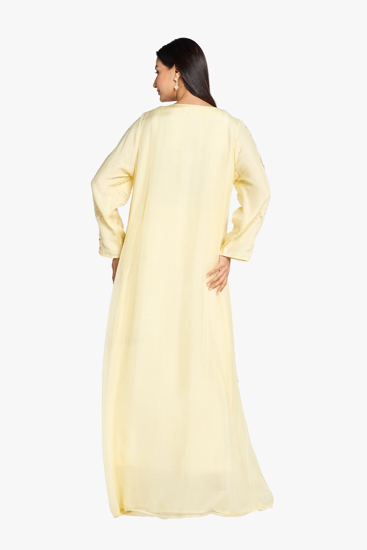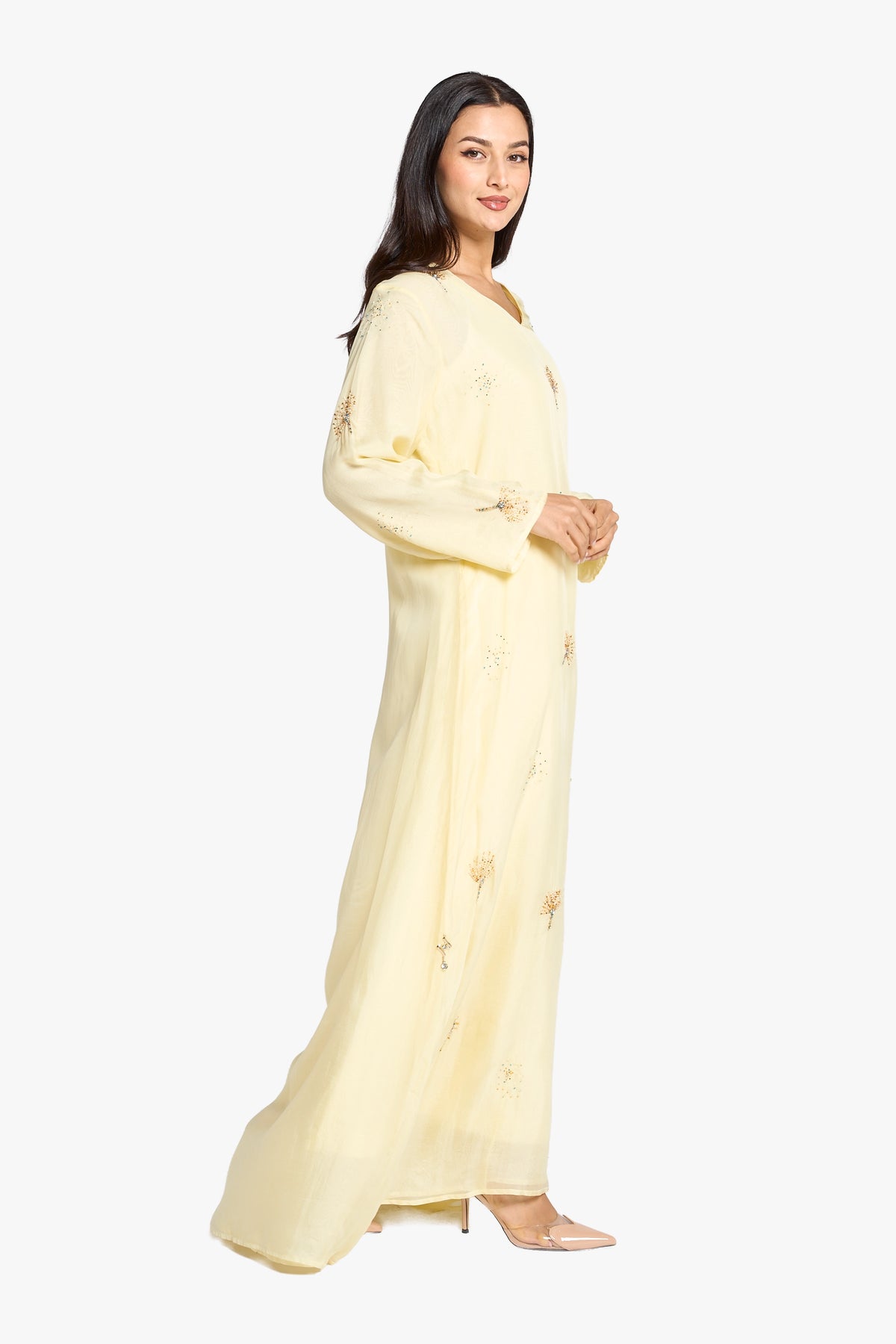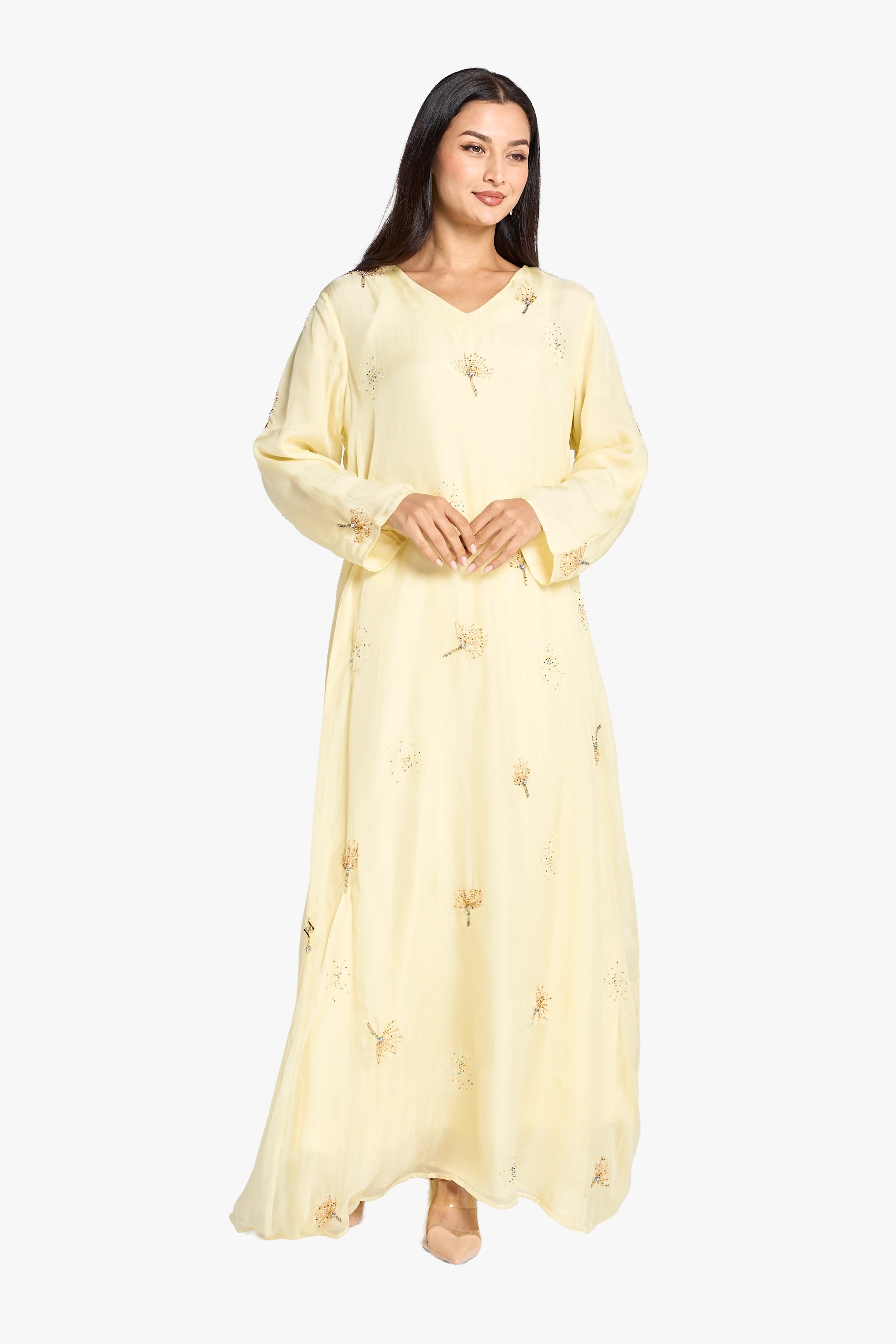 This elegant light yellow kaftan is crafted from sheer organza fabric, adorned with intricate hand-applied beadwork throughout. Its refined V-neckline and flowing long sleeves create a sophisticated silhouette, making it perfect for formal occasions that call for understated luxury and artisanal detail.