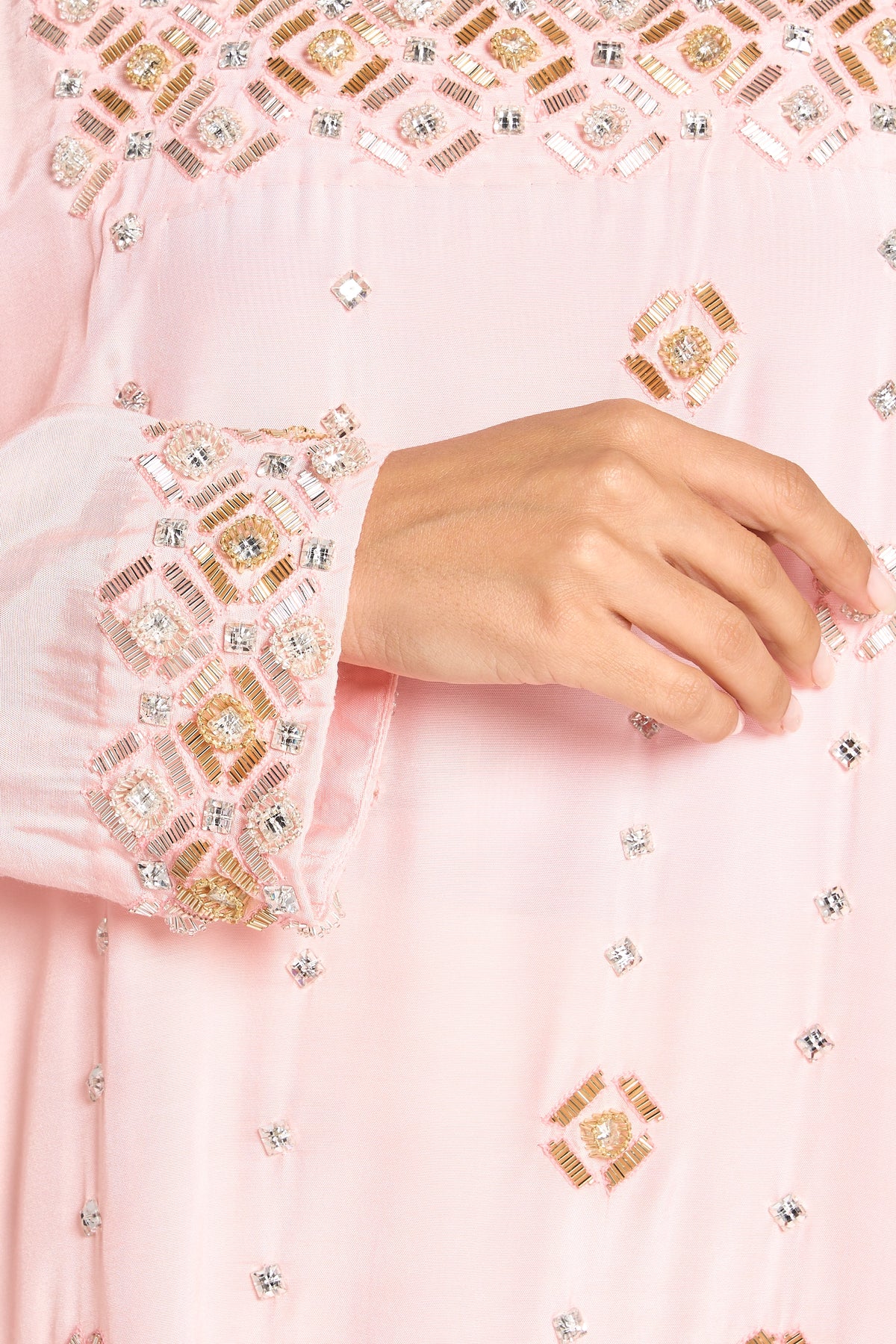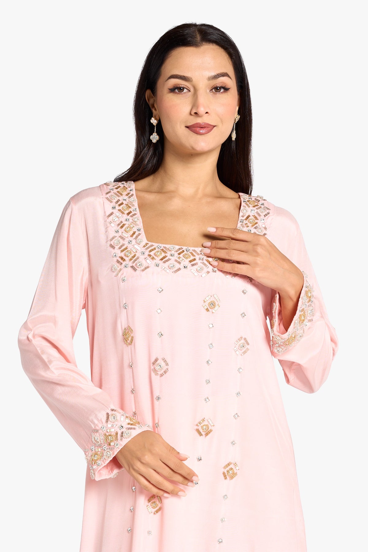 This pink kaftan crafted from luxurious crepe silk offers an elegant silhouette with a refined square neckline and long sleeves. Hand-embellished with delicate beadwork along the neckline and sleeves, it combines traditional artistry with sophisticated design. Perfect for special occasions, this kaftan provides both comfort and a graceful statement with its smooth fabric and meticulous detailing.