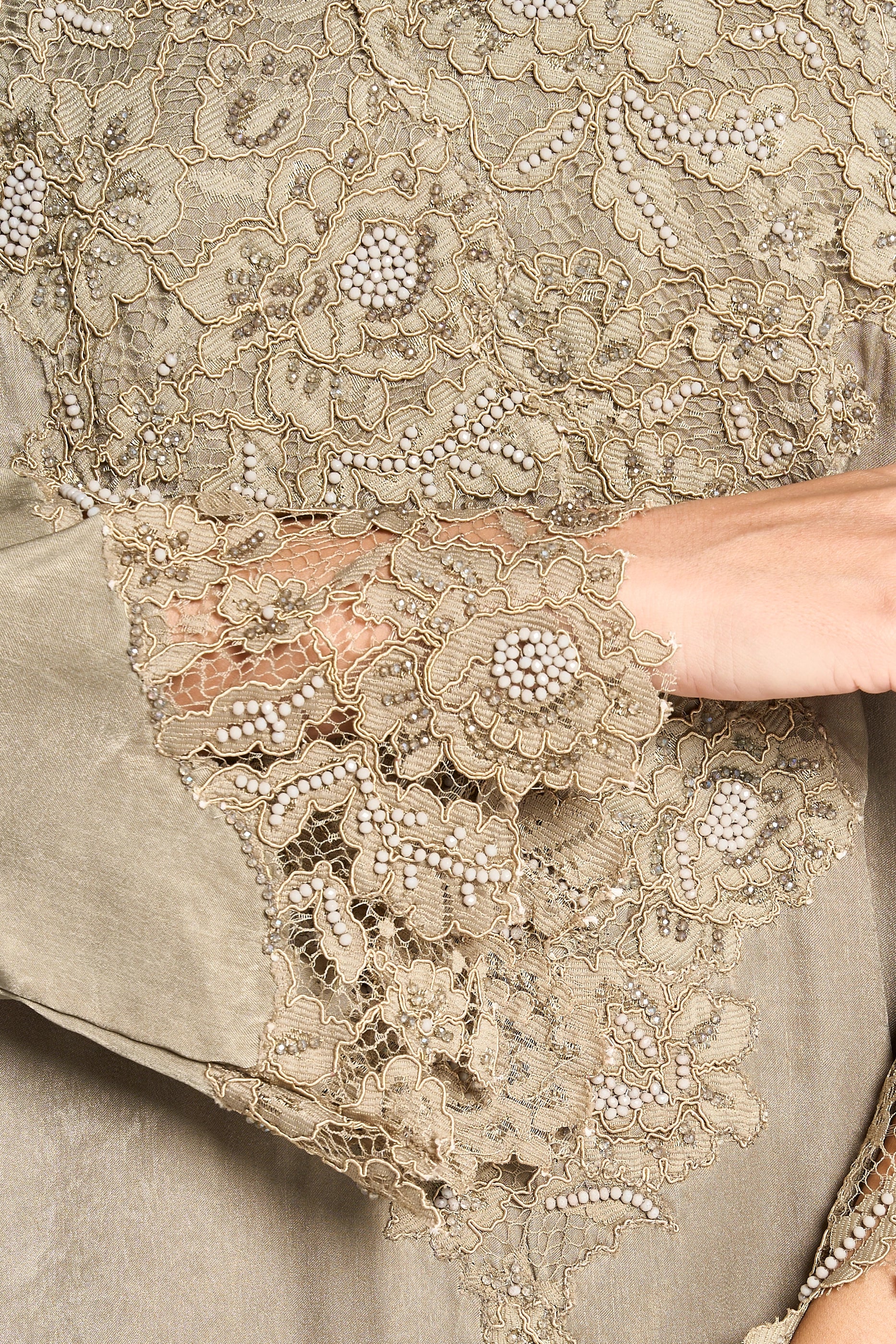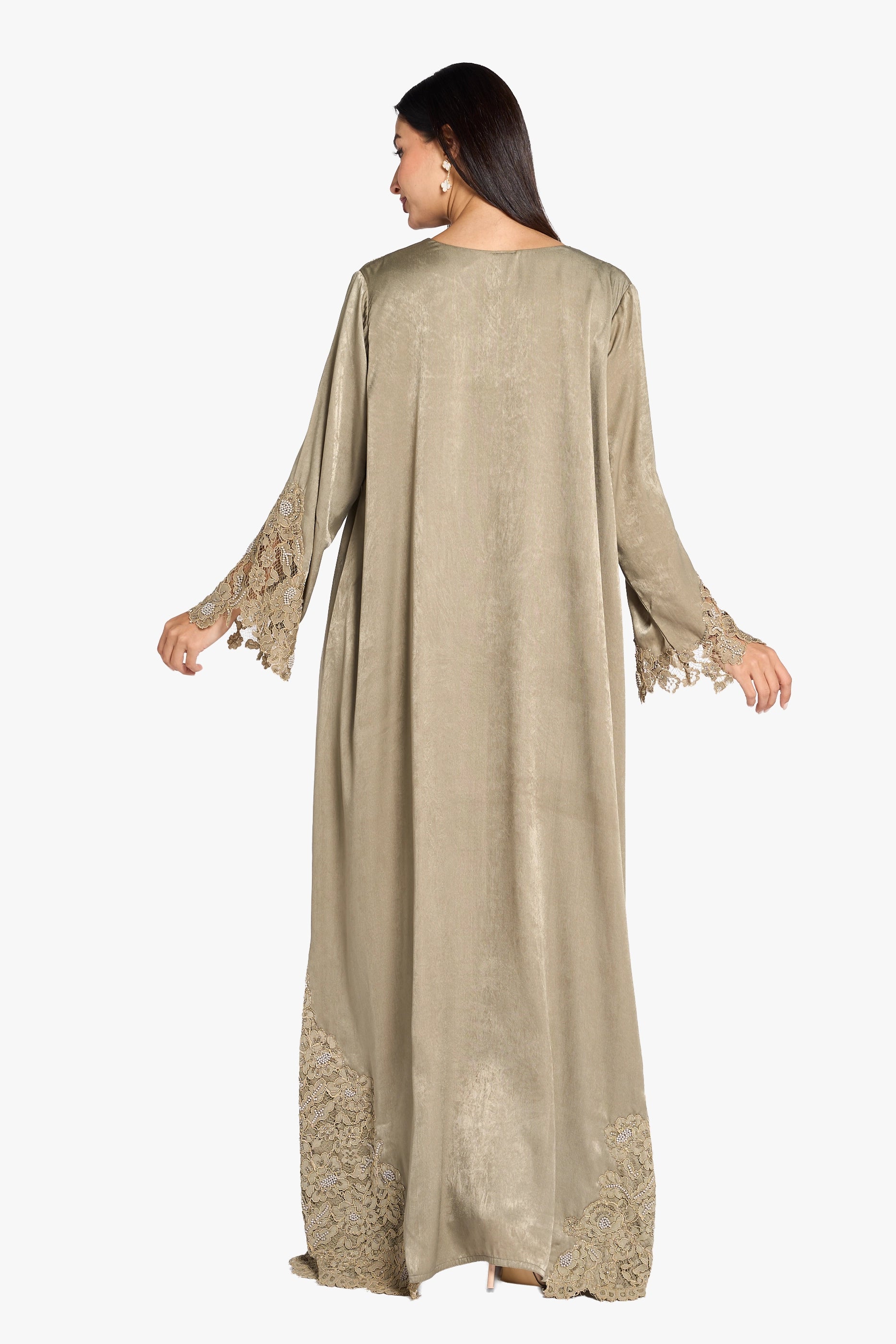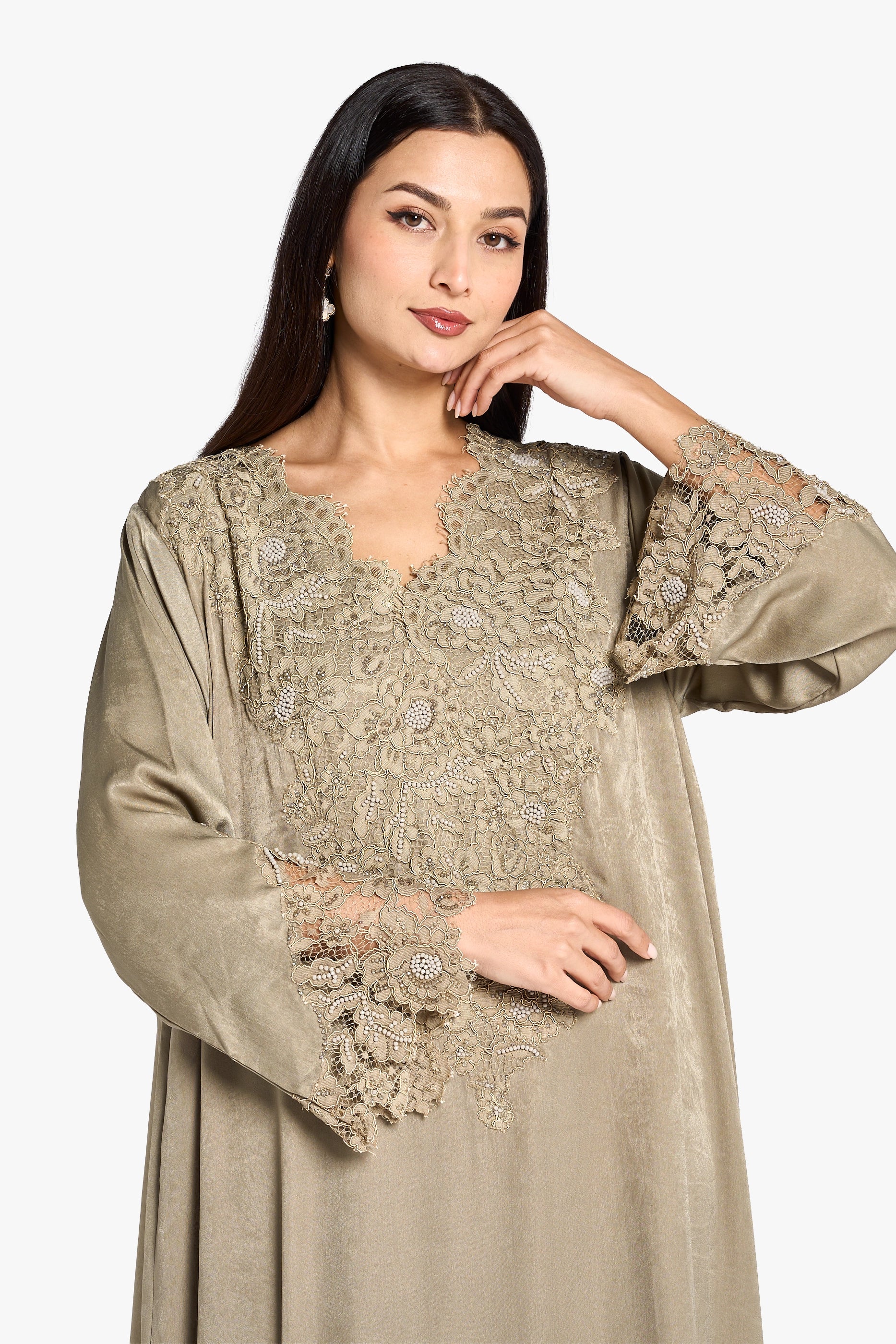 This elegant kaftan is crafted from luxurious velvet satin in a soft beige hue, offering a refined and comfortable fit. Detailed with intricate lace work on the neckline, sleeves, and side slits, it is further enhanced by delicate bead embellishments. The V-neckline and side slits provide a flattering silhouette, combining classic style with subtle sophistication for special occasions.