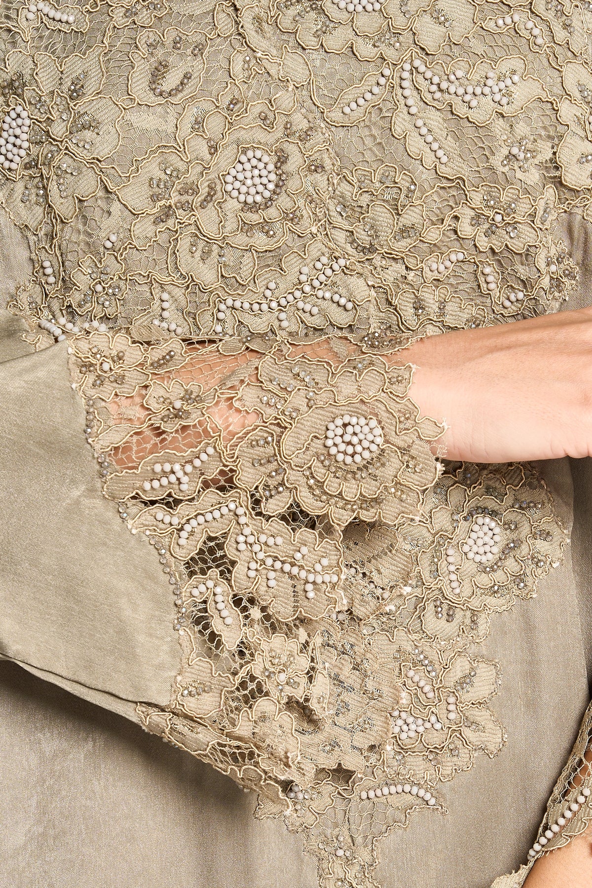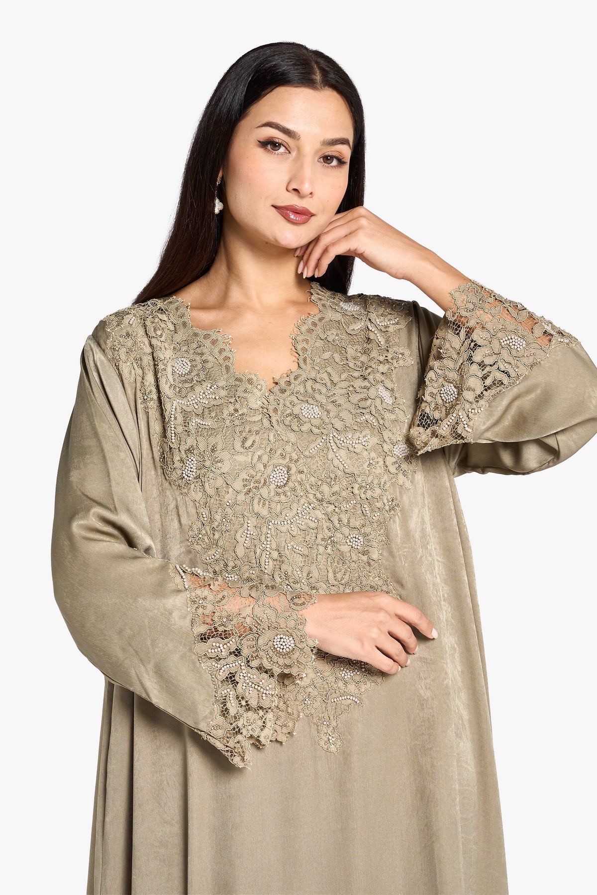 Louzan Jalabiya Velvet+Satin Lace & Hand Beading Kaftan – Beige