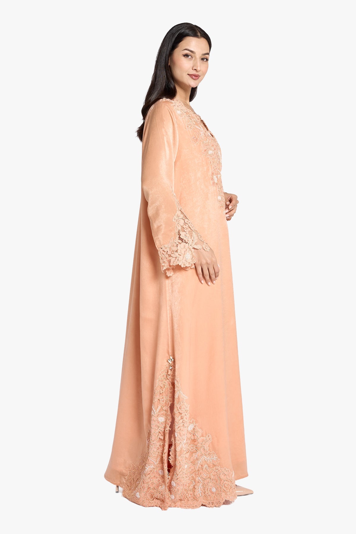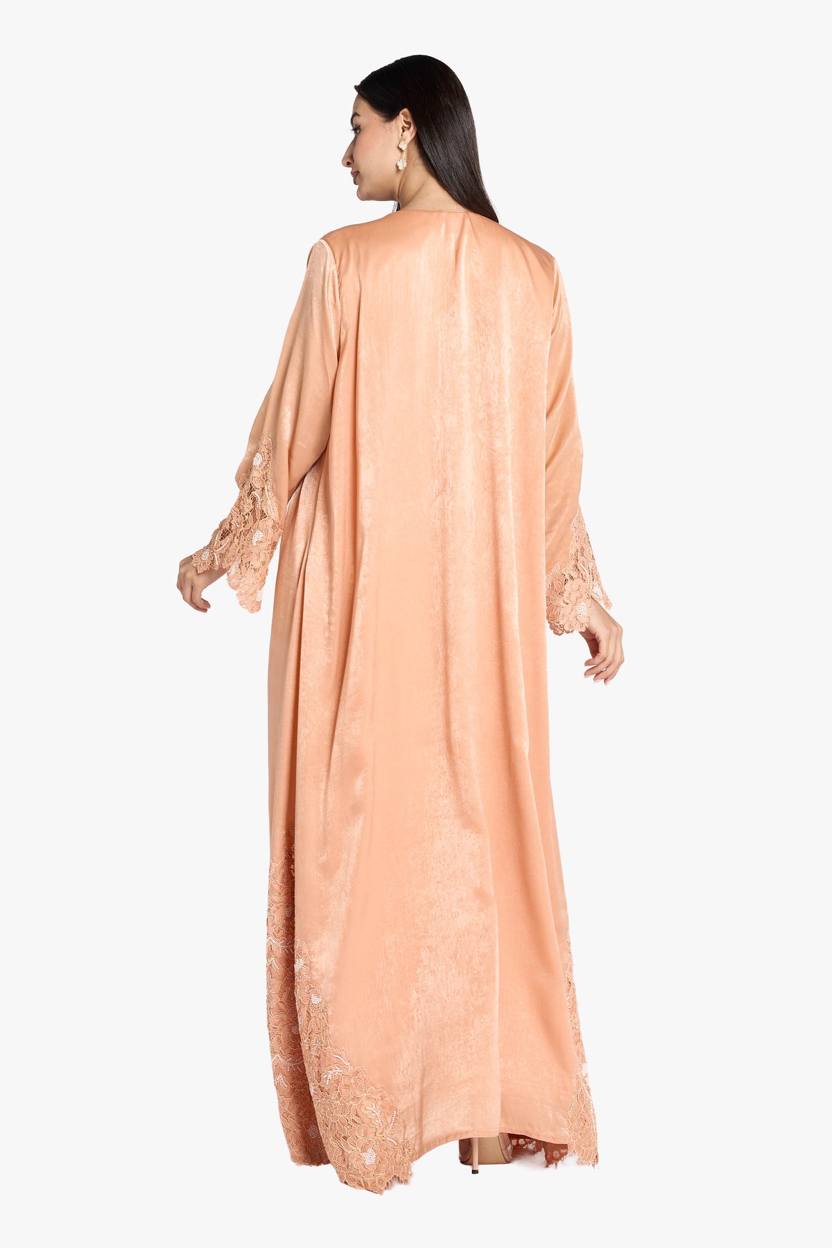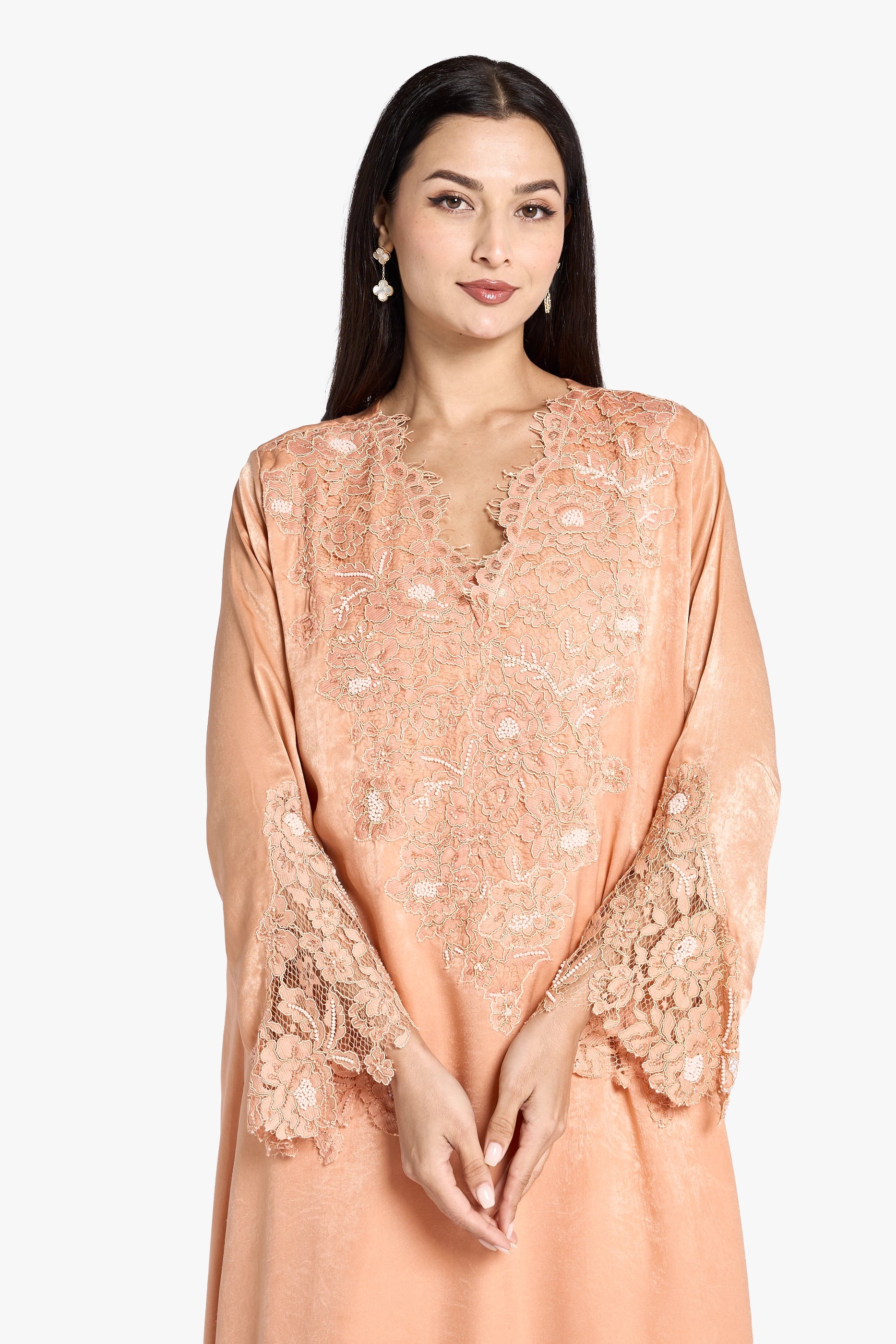 Louzan Jalabiya Velvet+Satin Lace & Hand Beading Kaftan – Peach