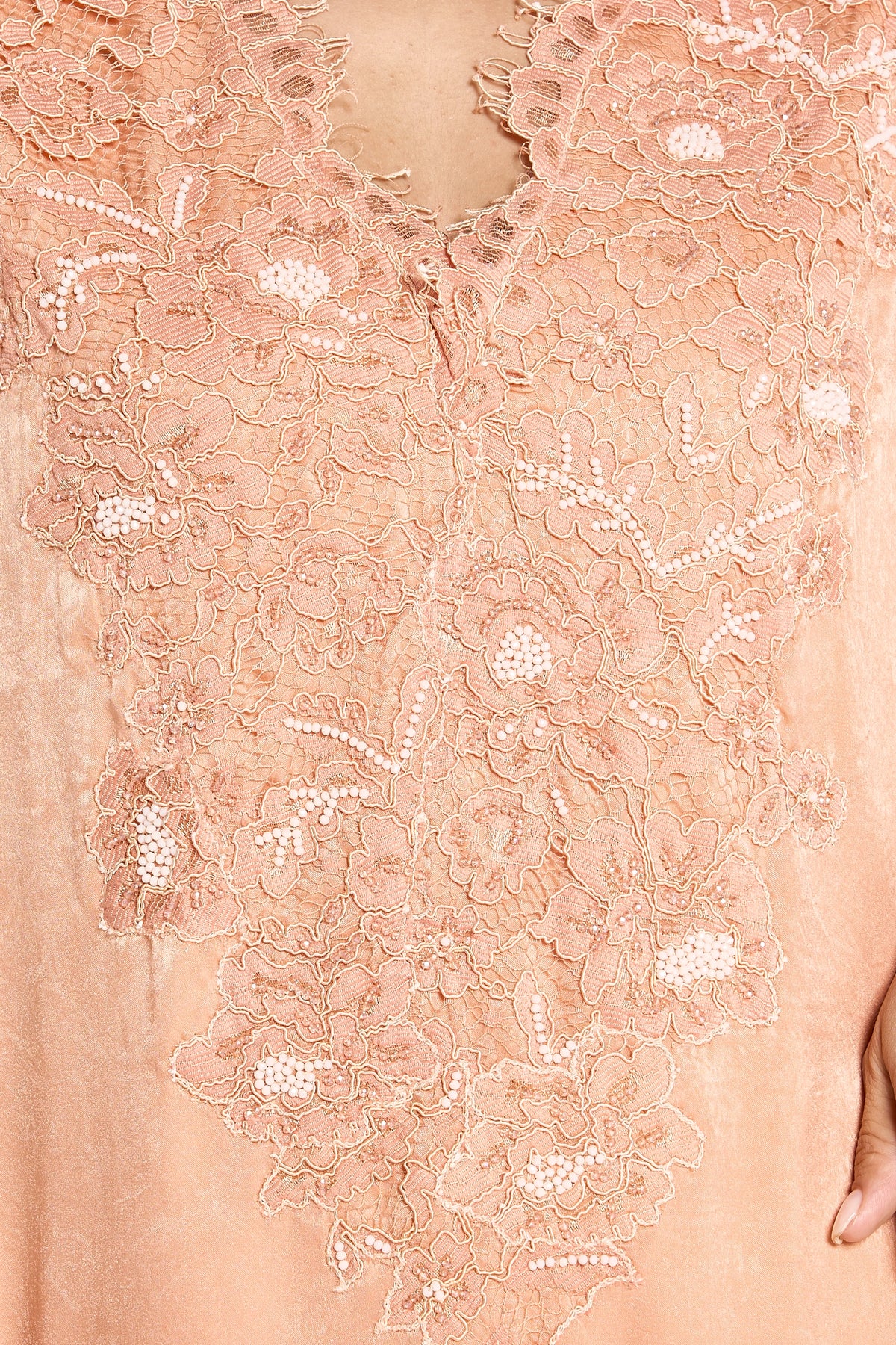 This peach kaftan crafted from luxurious velvet satin combines elegance and comfort. Featuring intricate lace detailing on the neckline, sleeves, and side slits, it is delicately enhanced with beadwork for a refined finish. The V-neck design and side slits provide both style and ease of movement, making it a sophisticated choice for special occasions.
