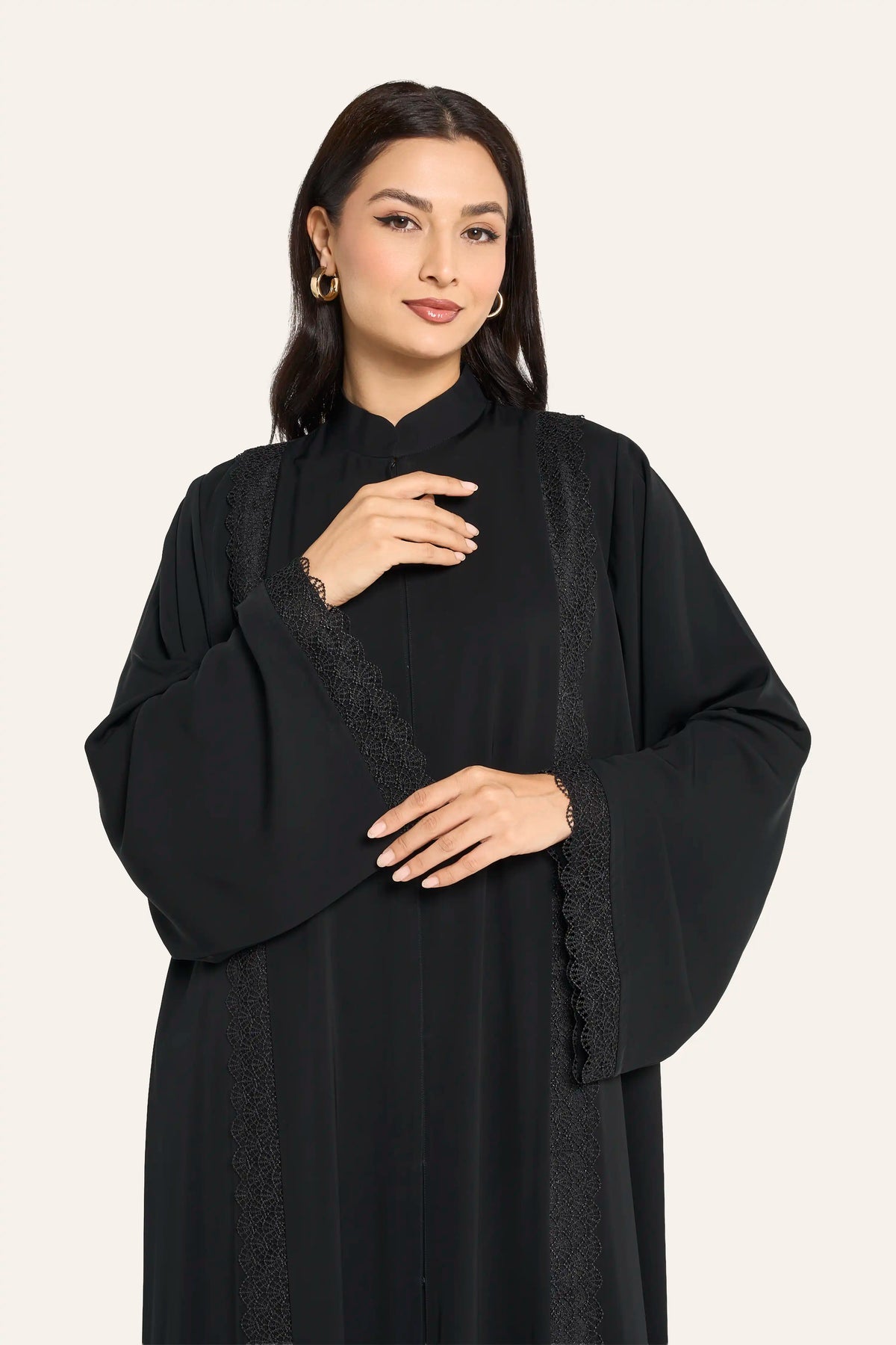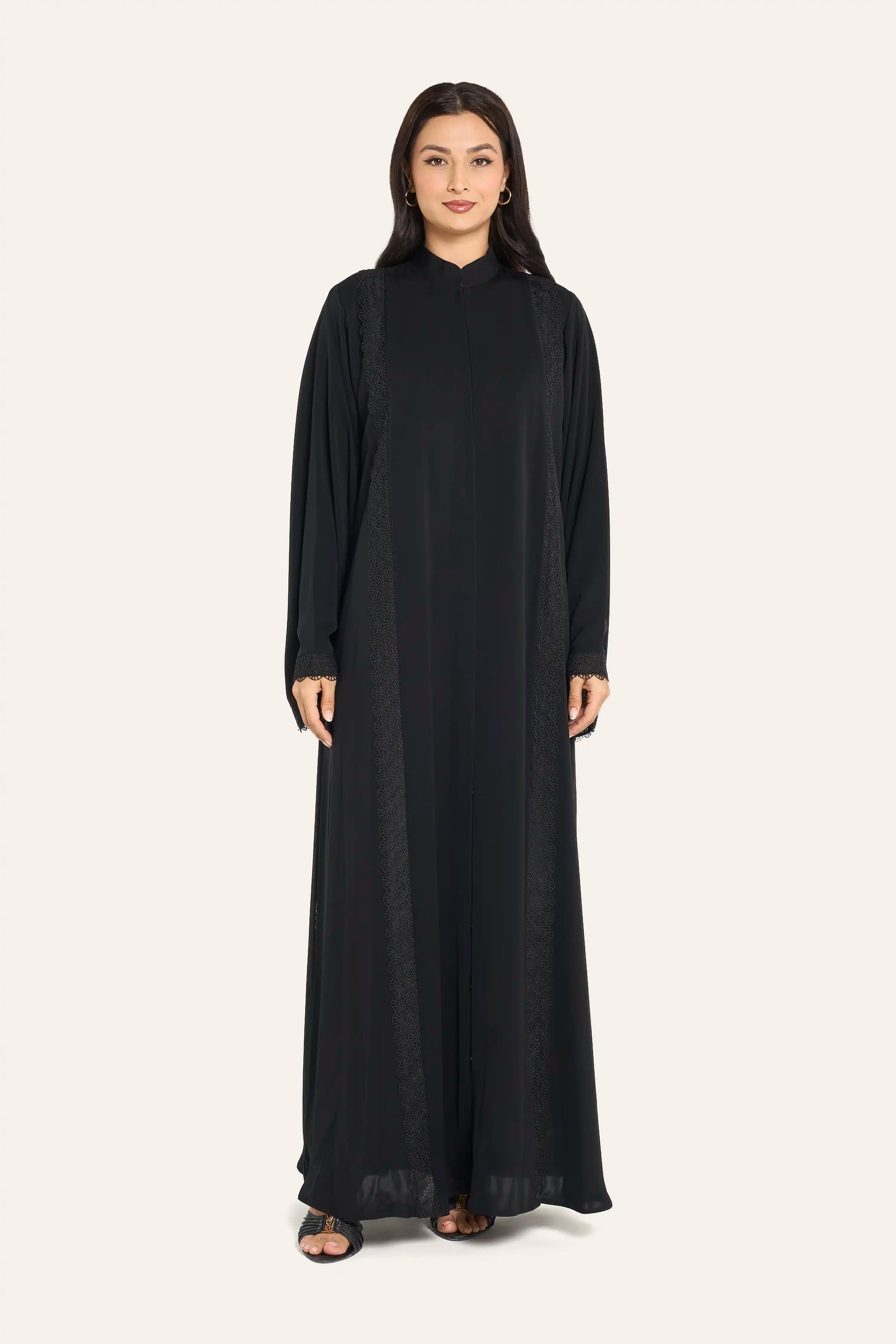 Louzan knotch collar abaya crafted in satin abstract printed fabric with metal snap button detailing. This elegant piece combines traditional silhouette with contemporary design elements, featuring a distinctive knotch collar and premium satin construction. The abstract print adds visual interest while maintaining sophisticated appeal, perfect for elevated everyday wear or special occasions. Metal snap buttons provide both functional closure and refined aesthetic detail.