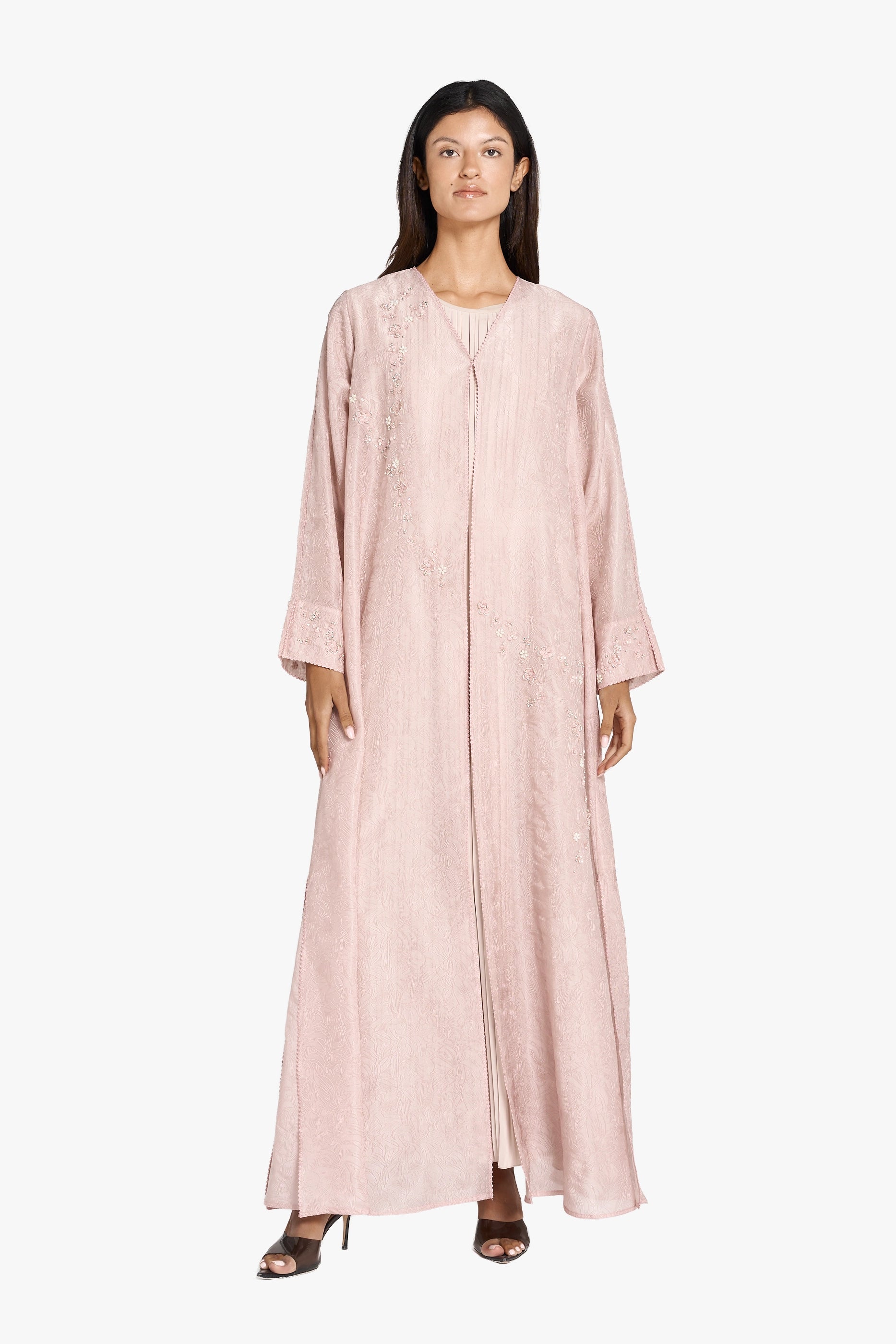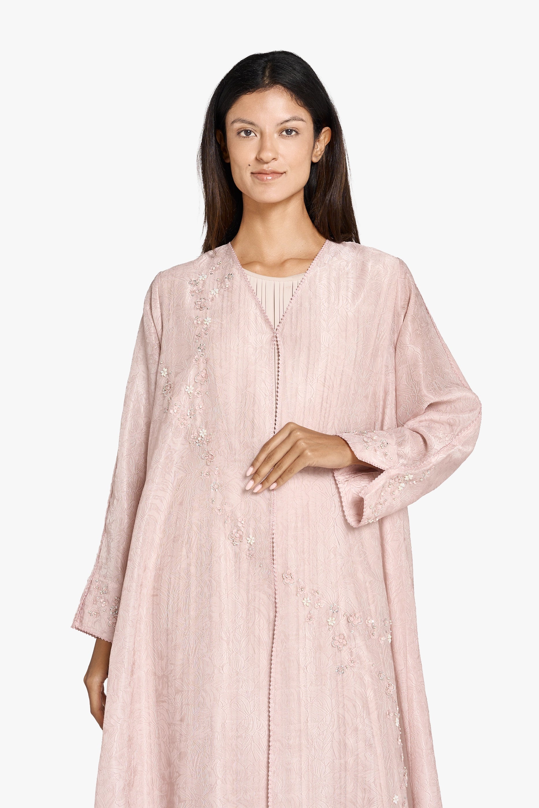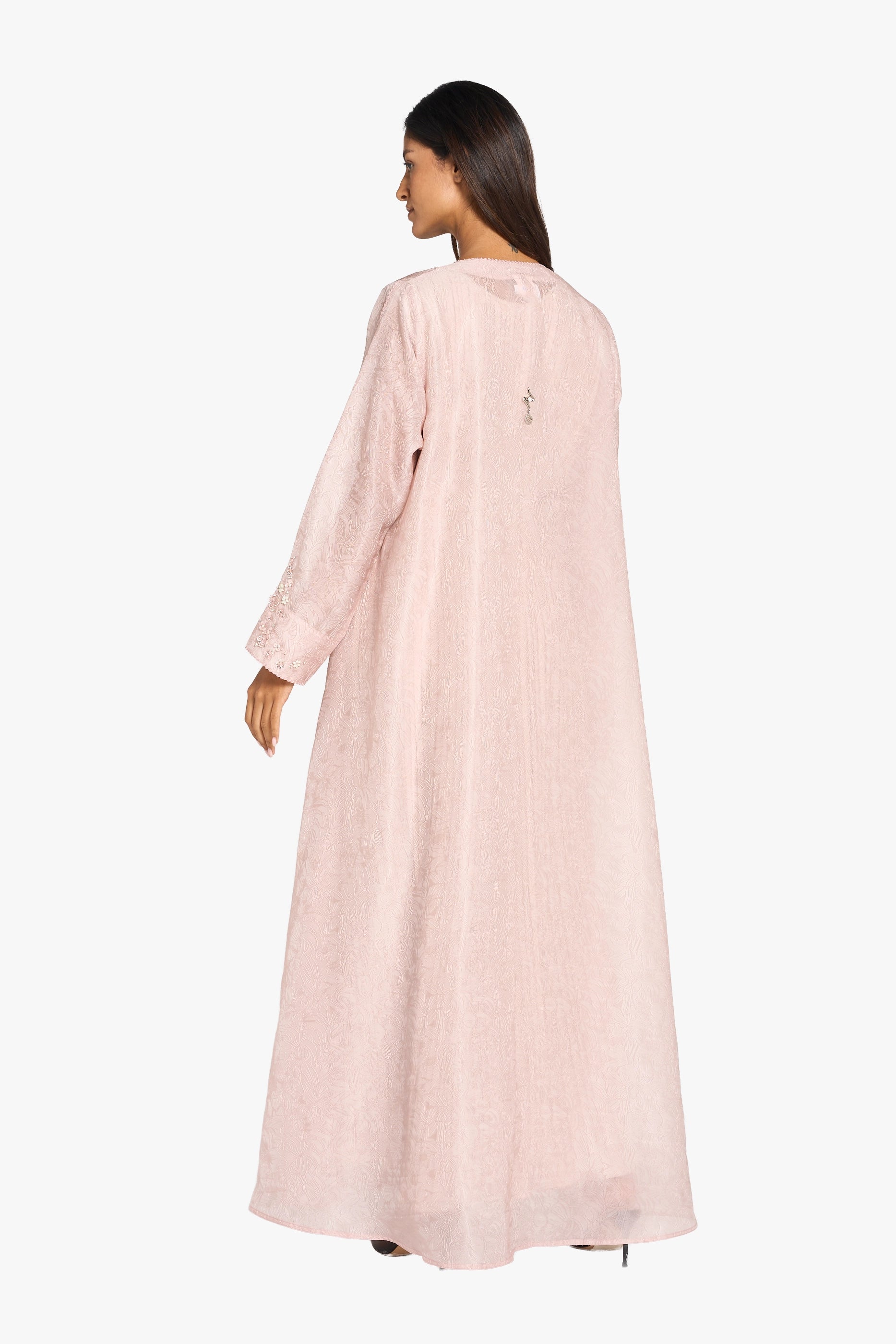 Discover timeless sophistication with this Louzan abaya, meticulously constructed from ditsy floral jacquard Tencel organza. Each piece showcases hand-embroidered scattered florals delicately adorned with sequins, beads, and crystals, creating a luminous interplay of texture and light. The combination of premium fabric and artisanal embellishment elevates this abaya beyond everyday wear, making it an ideal choice for special occasions and refined gatherings. A testament to masterful craftsmanship and understated luxury.