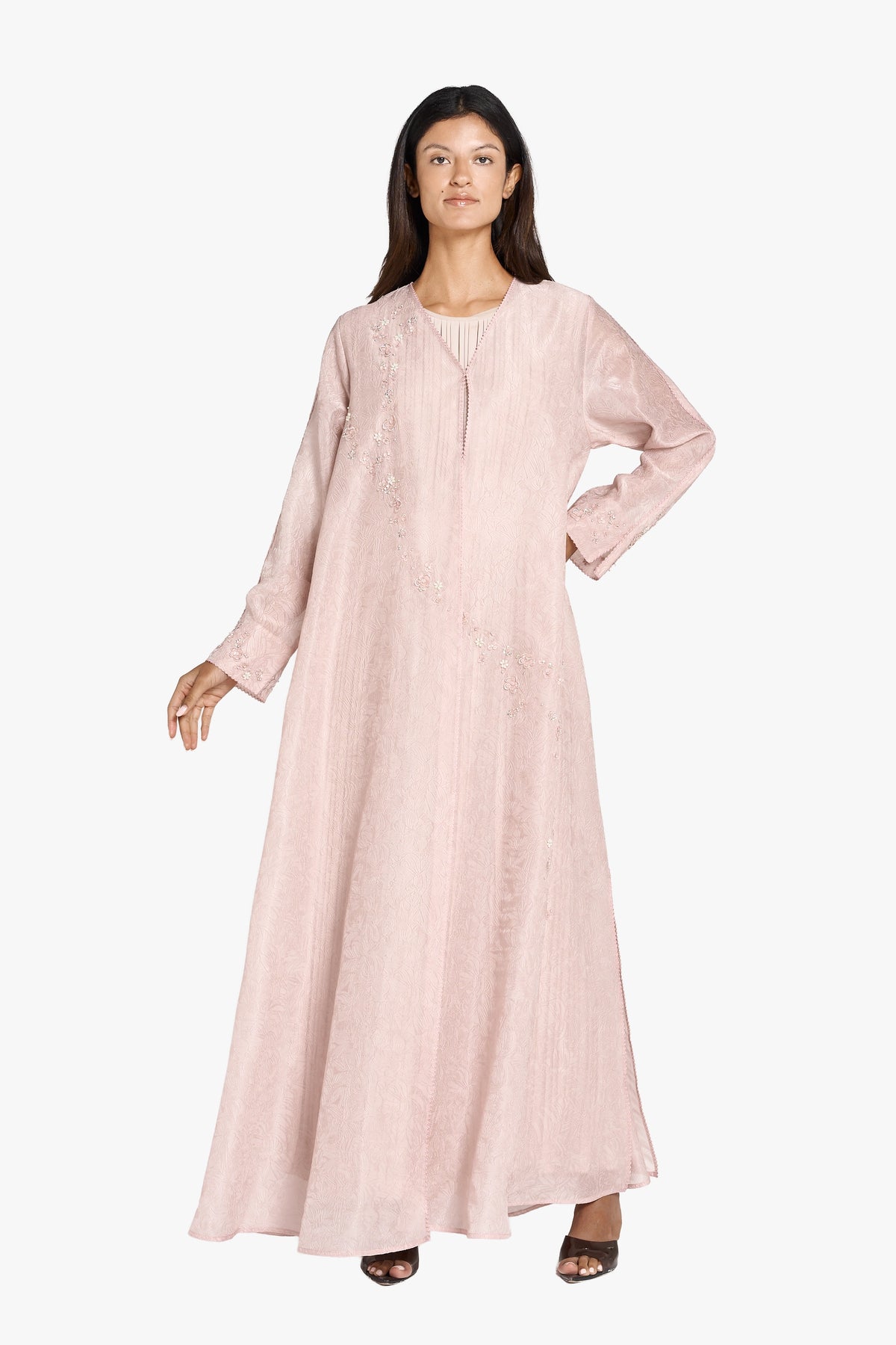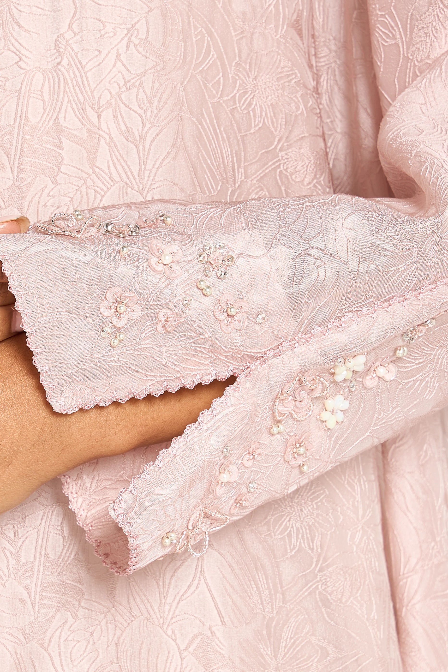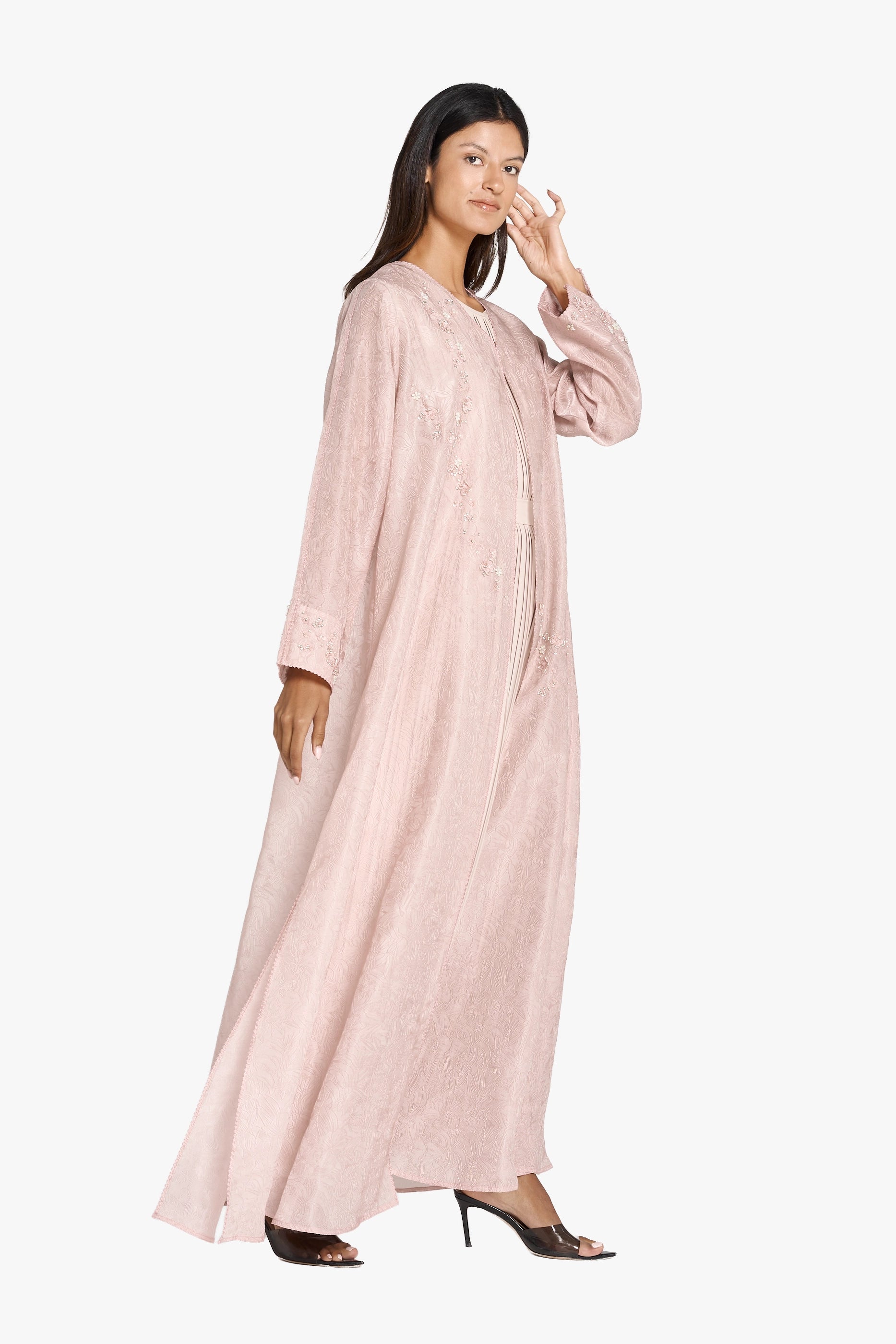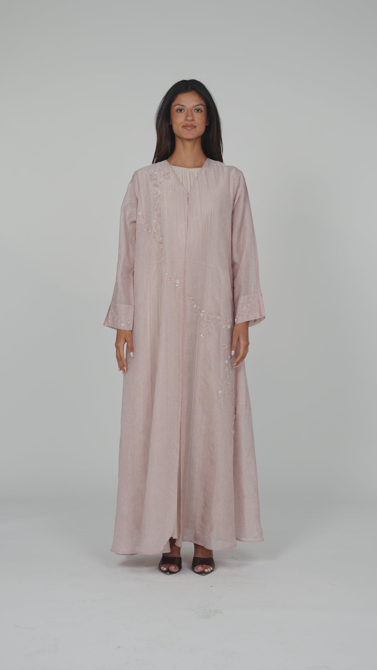 Discover timeless sophistication with this Louzan abaya, meticulously constructed from ditsy floral jacquard Tencel organza. Each piece showcases hand-embroidered scattered florals delicately adorned with sequins, beads, and crystals, creating a luminous interplay of texture and light. The combination of premium fabric and artisanal embellishment elevates this abaya beyond everyday wear, making it an ideal choice for special occasions and refined gatherings. A testament to masterful craftsmanship and understated luxury.