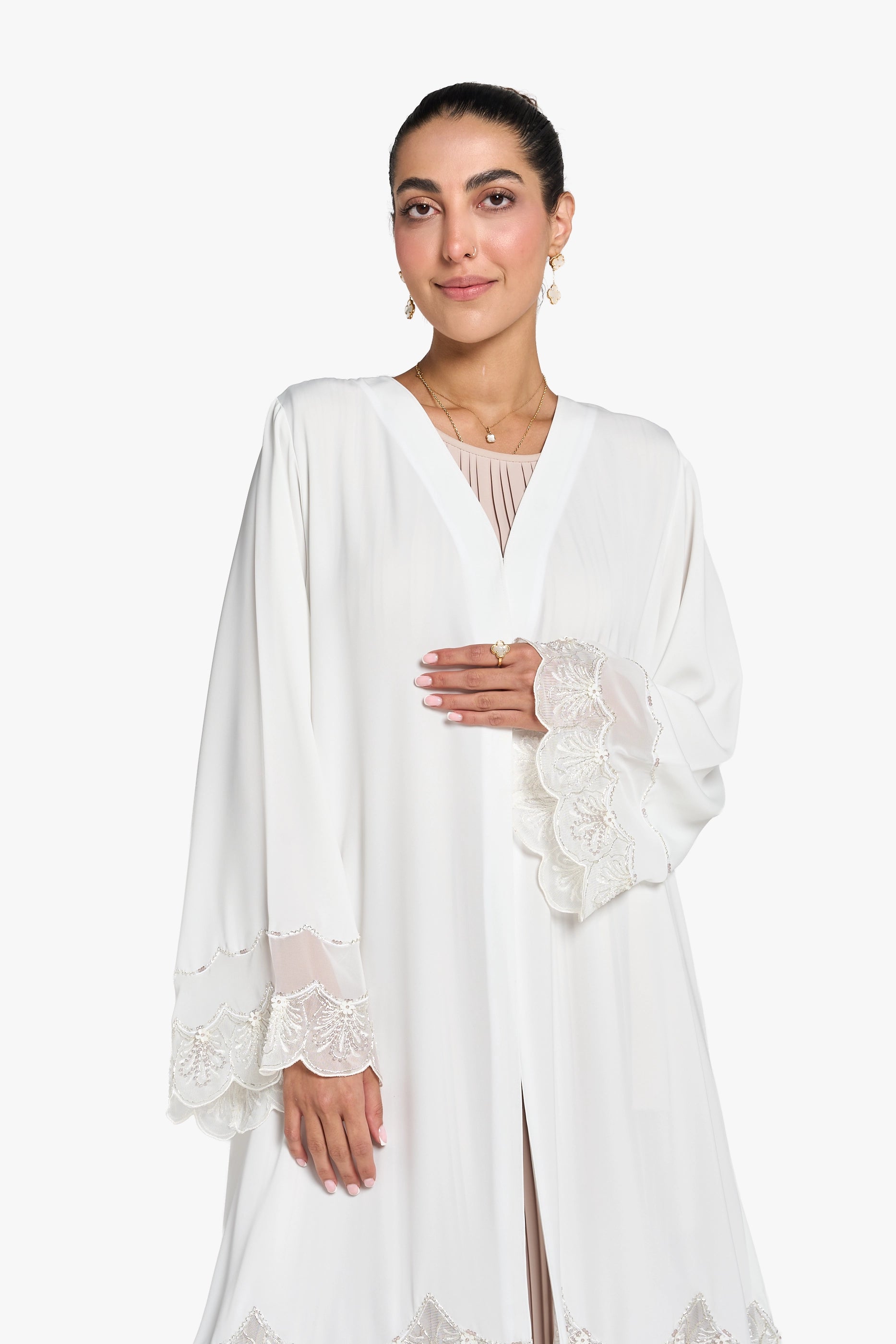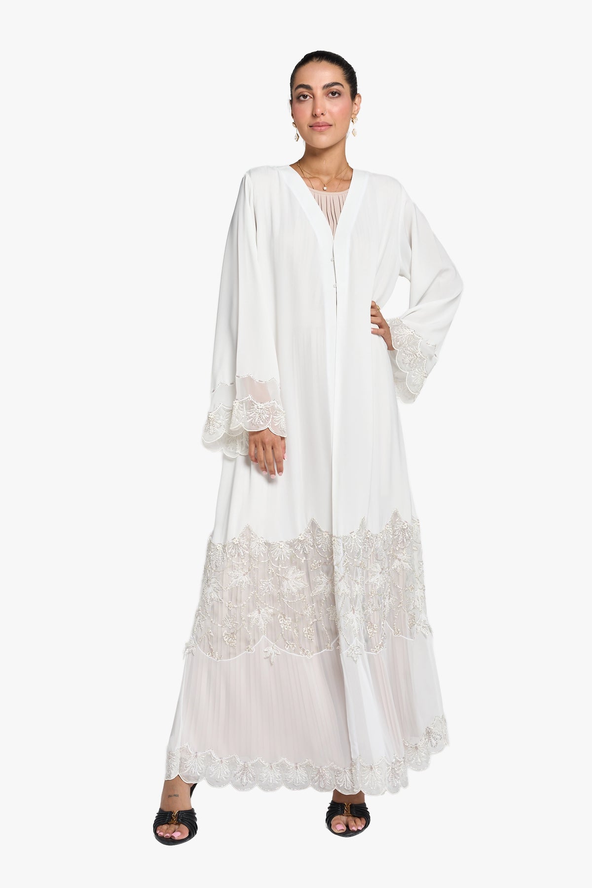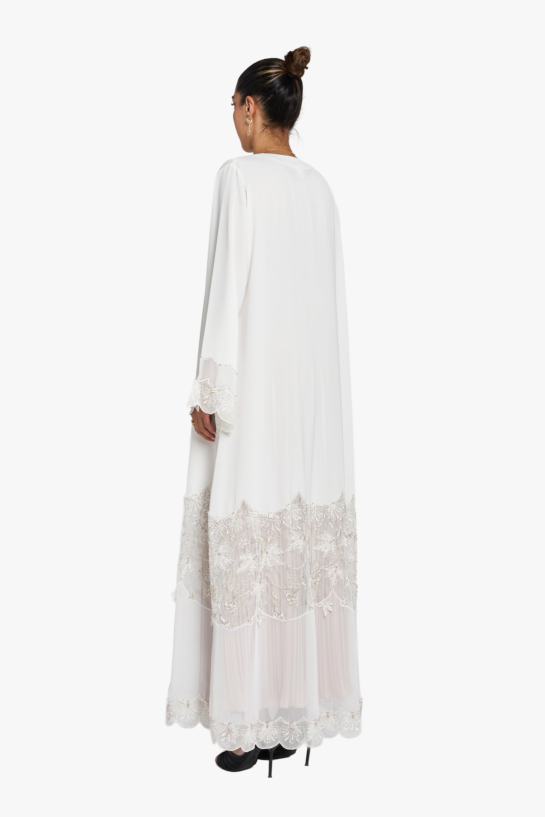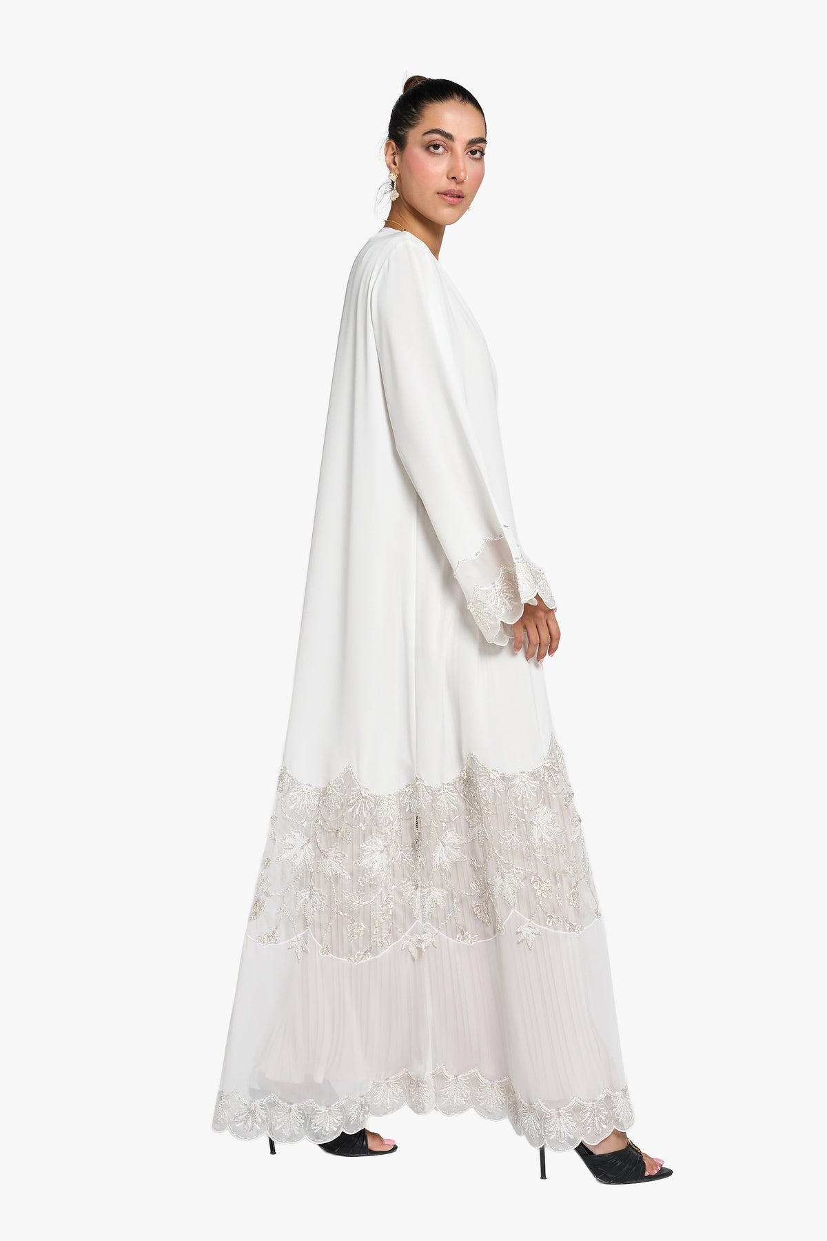 Louzan VIP abaya showcases exquisite craftsmanship in premium nida fabric, featuring delicate dori embroidery styled with baroque-inspired floral motifs. Enhanced with sparkling crystals and beads, this abaya embodies timeless elegance and refined tradition, perfect for those who appreciate sophisticated, graceful attire.
