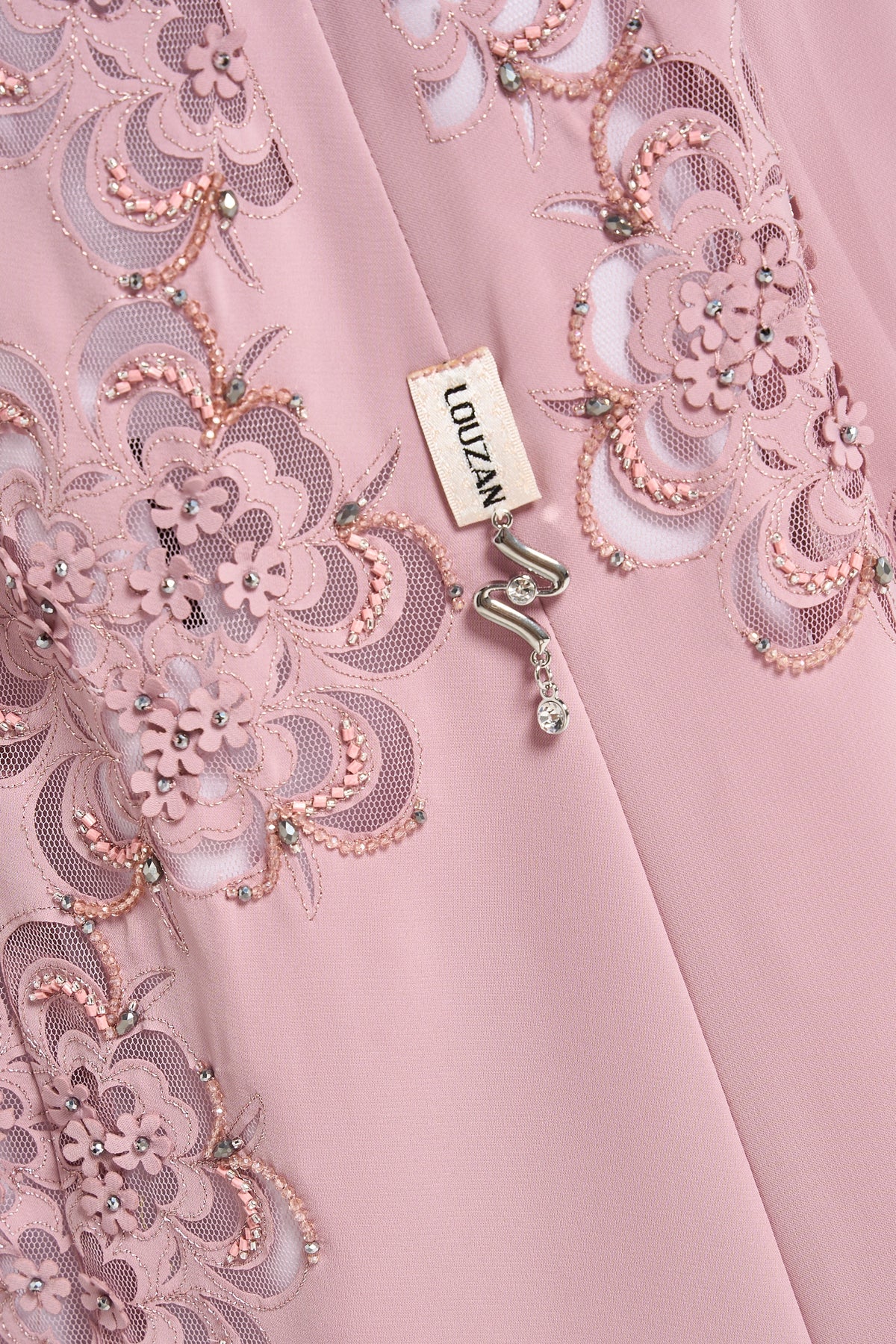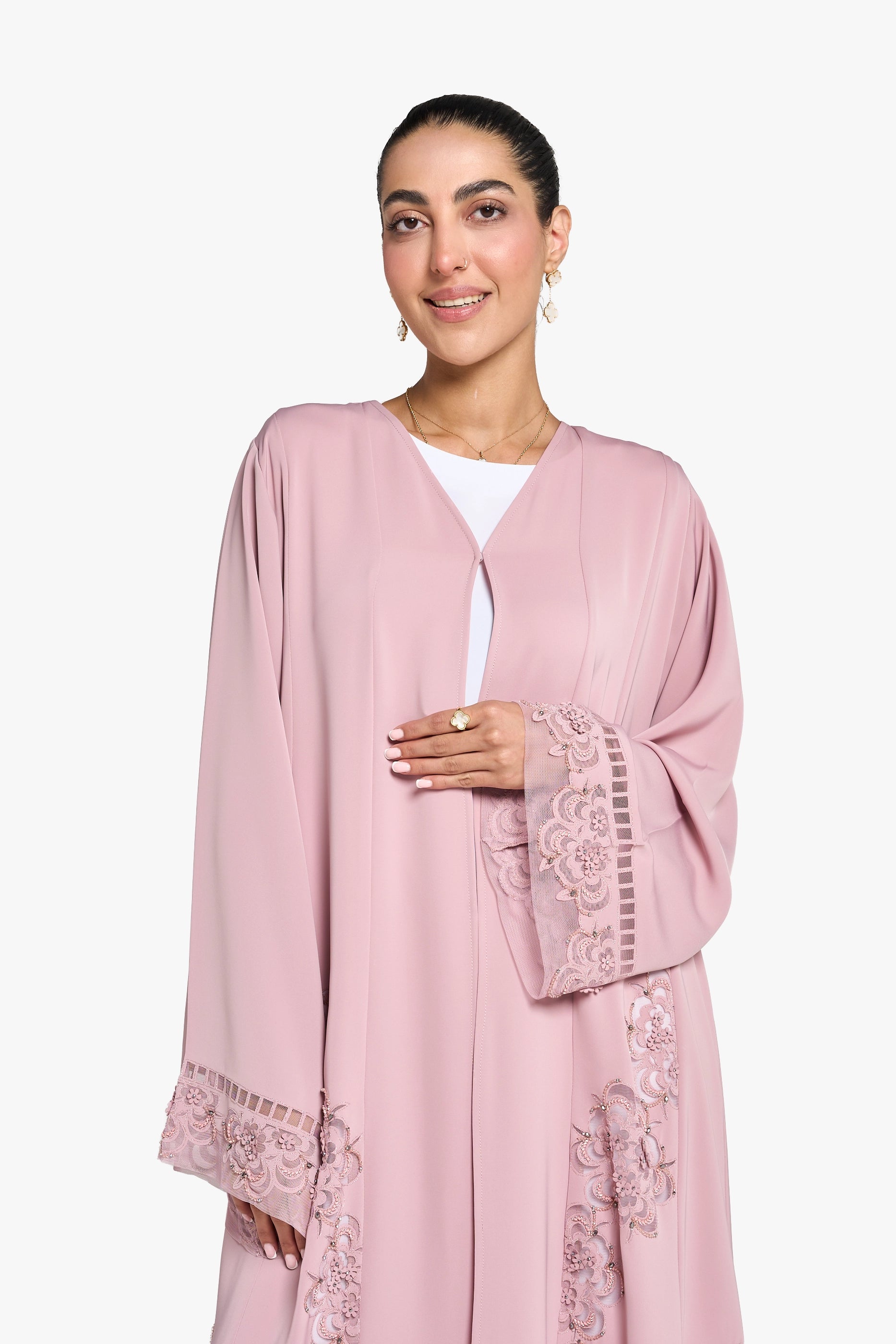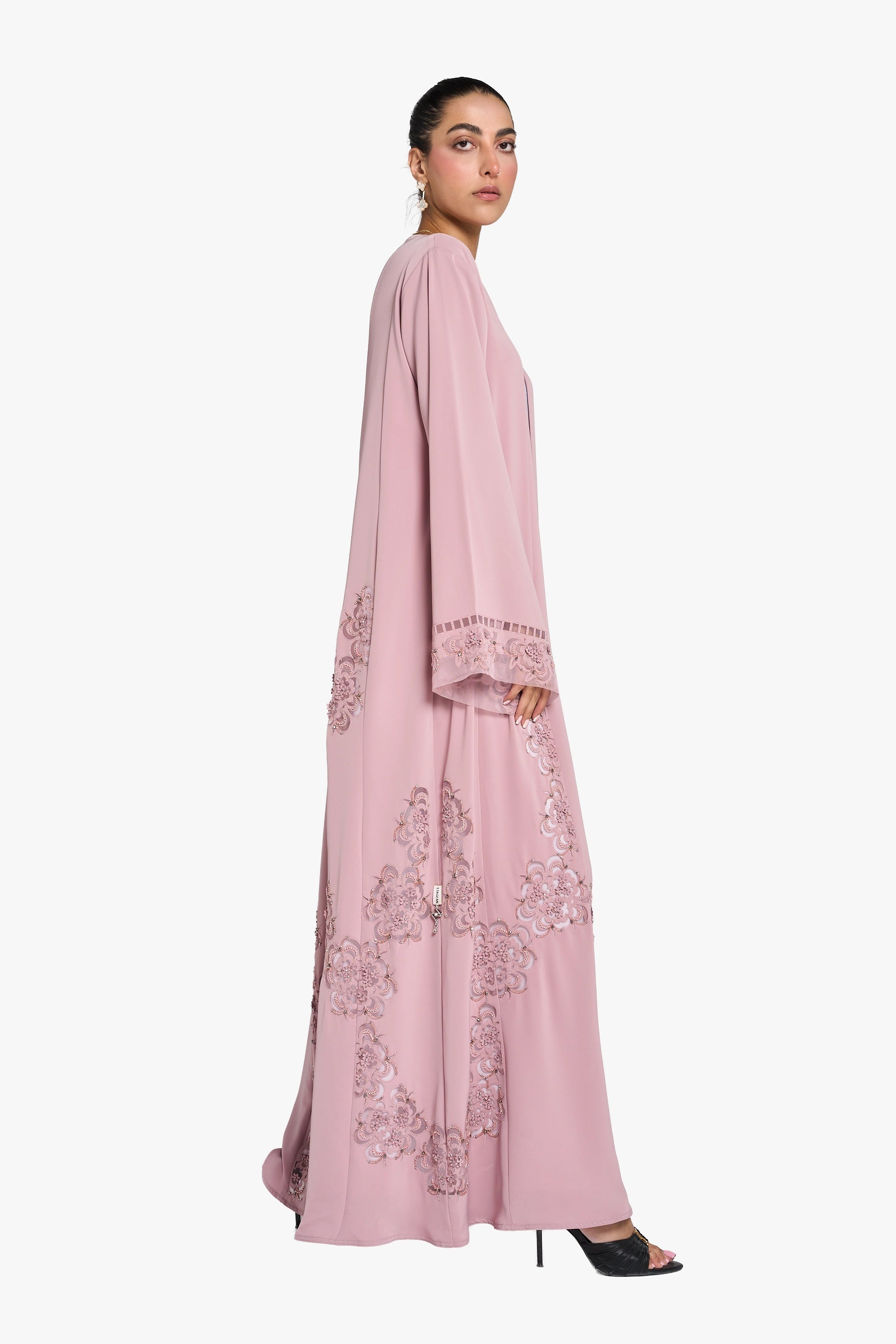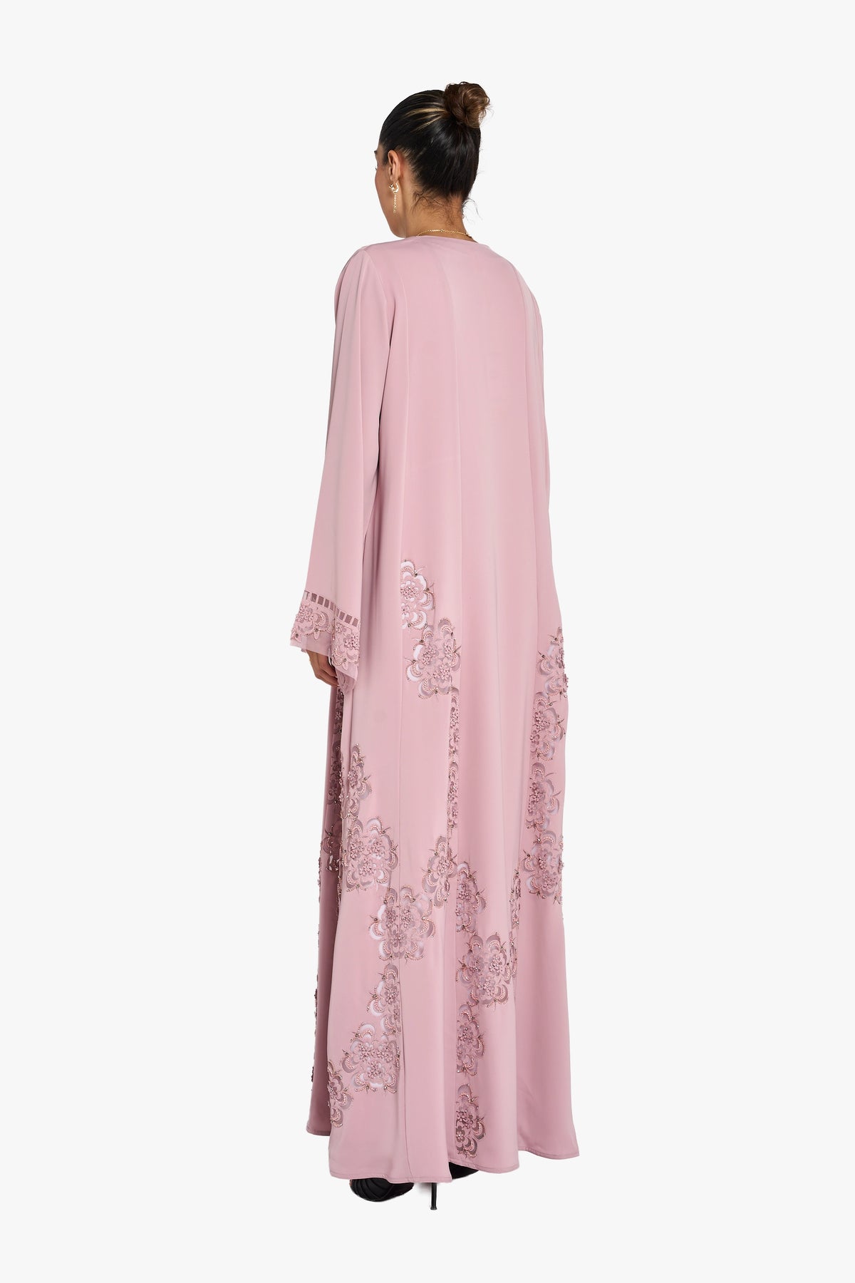 The LOUZAN ABAYA LN2324N61 features premium nida fabric designed for comfort and graceful drape. Its intricate laser-cut floral patterns are flawlessly complemented by refined dori embroidery and delicate beadwork, creating a sophisticated and elegant look. Ideal for special occasions, this abaya combines expert craftsmanship with timeless style to ensure you stand out with subtle luxury.