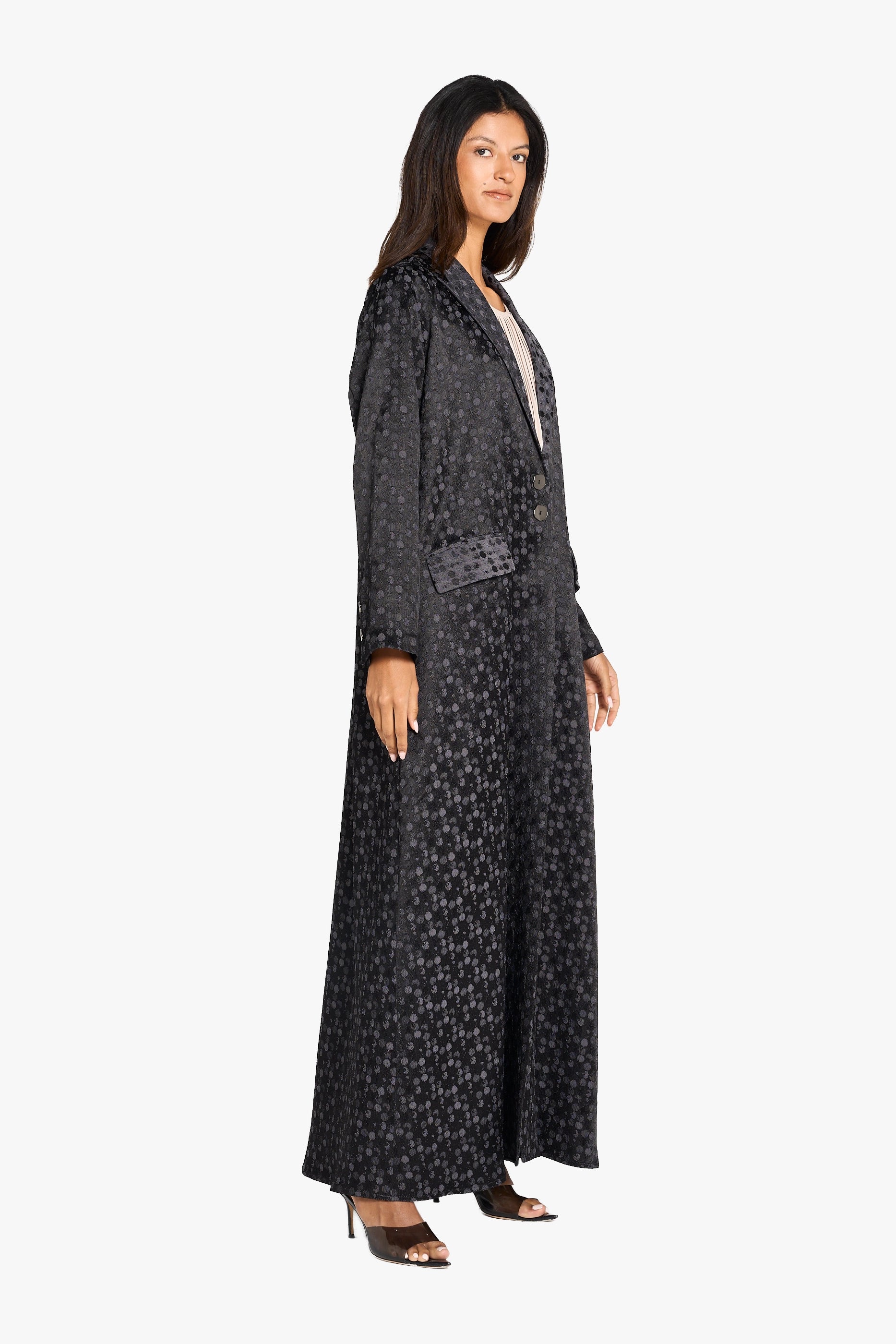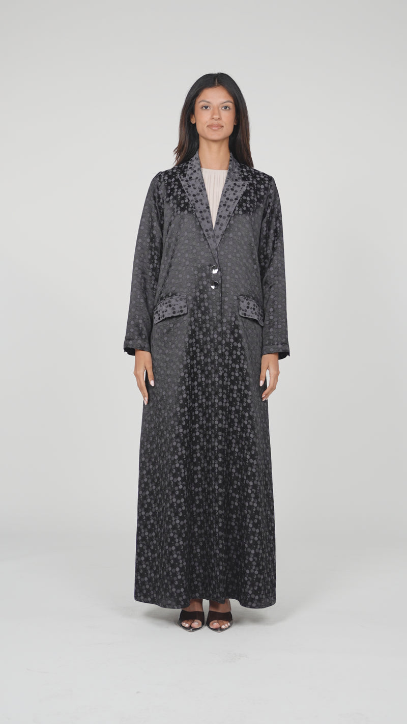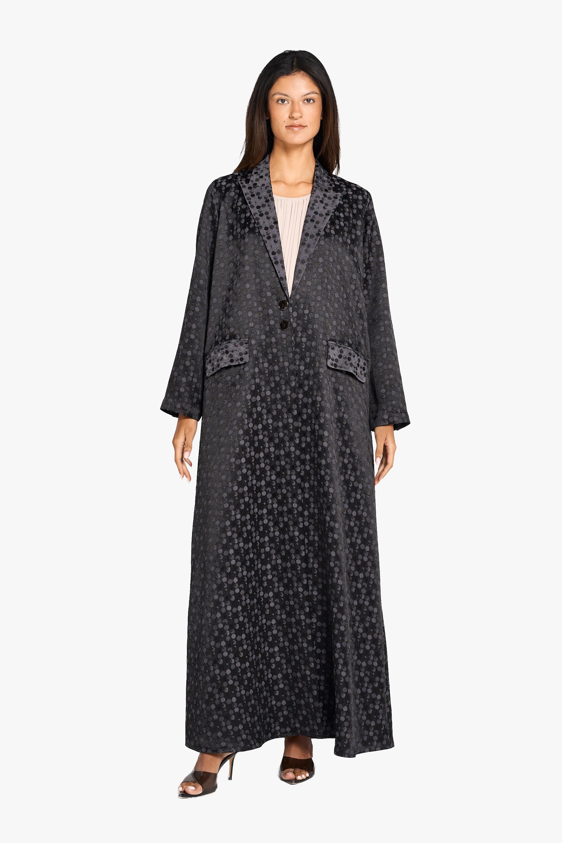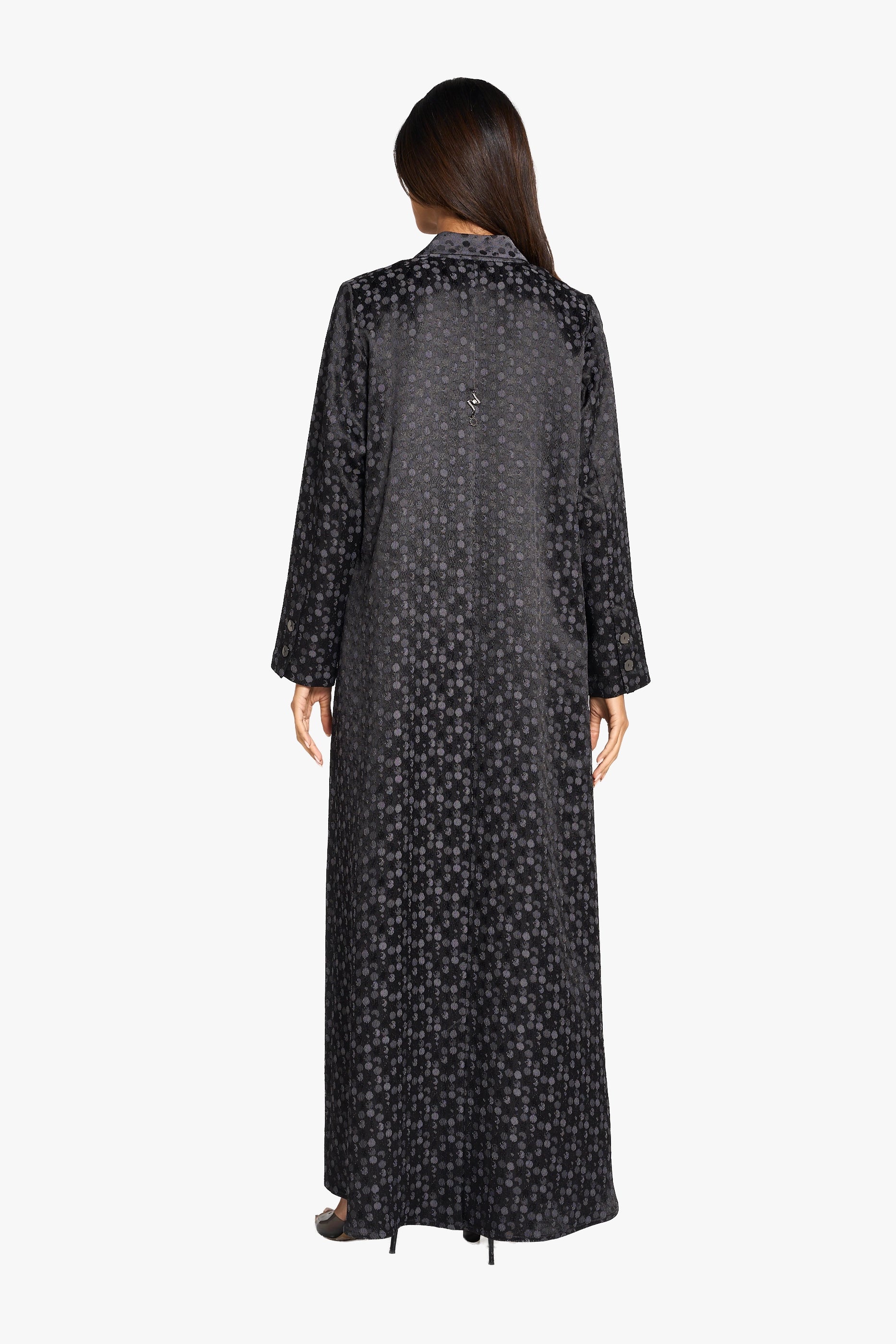 The LOUZAN JACQUARD DF81 represents contemporary modest fashion with sophisticated construction. This abaya features a distinctive polka-design jacquard fabric that delivers visual interest while maintaining elegance. The notch collar provides a refined neckline, while strategically placed pockets utilize the fabric's reverse side for subtle textural contrast. Metal button accents elevate the design, adding a modern touch to this timeless silhouette. Perfect for those seeking a smart, polished abaya that balances traditional styling with contemporary details.