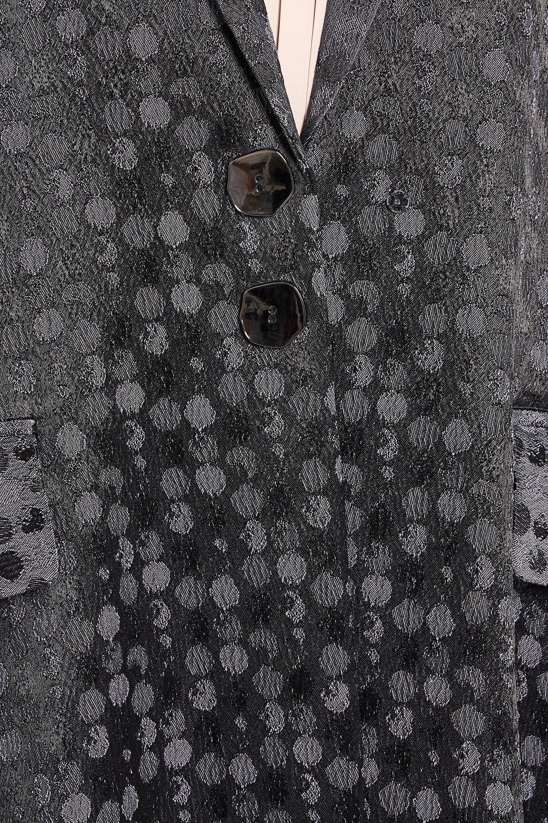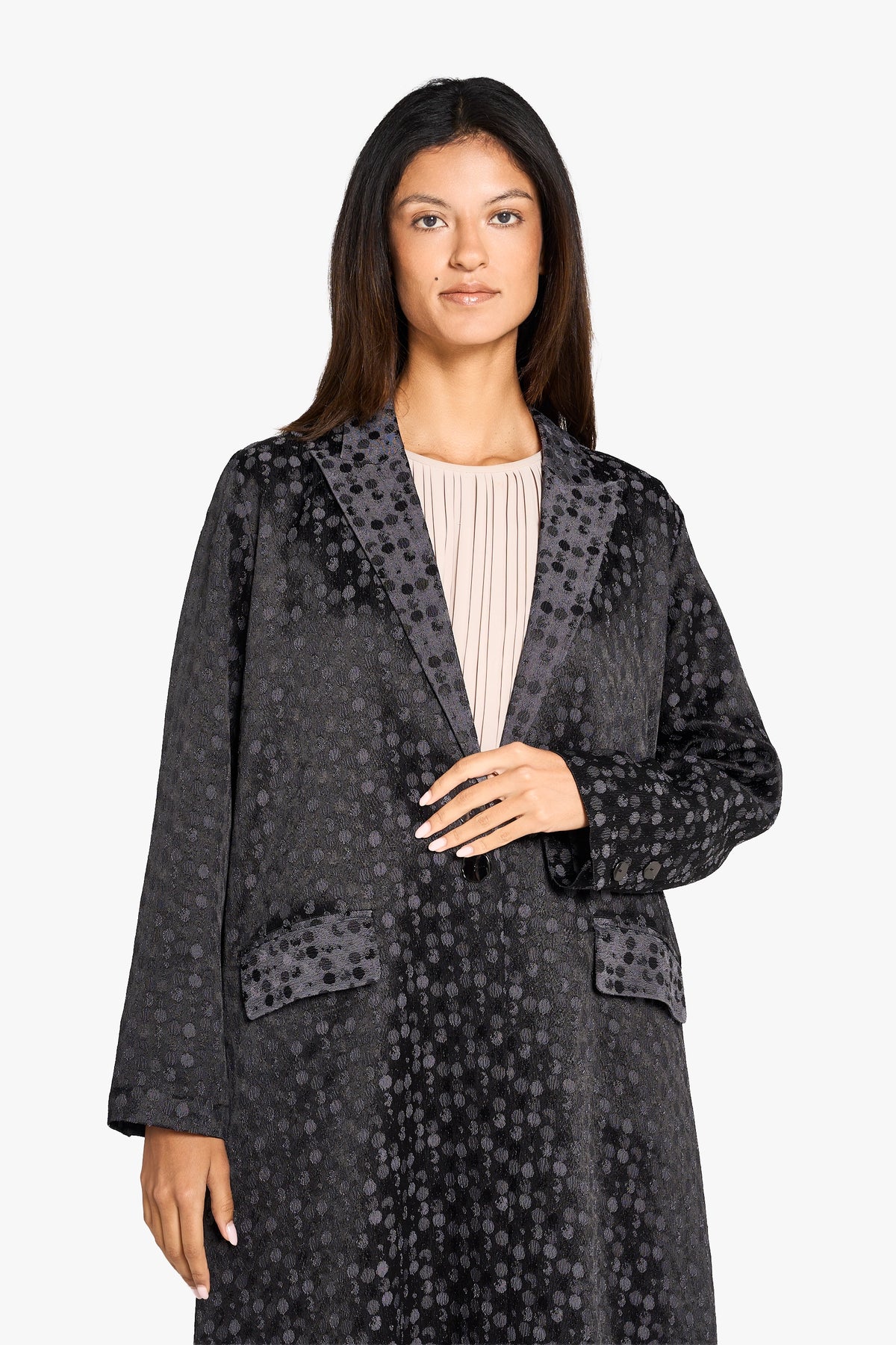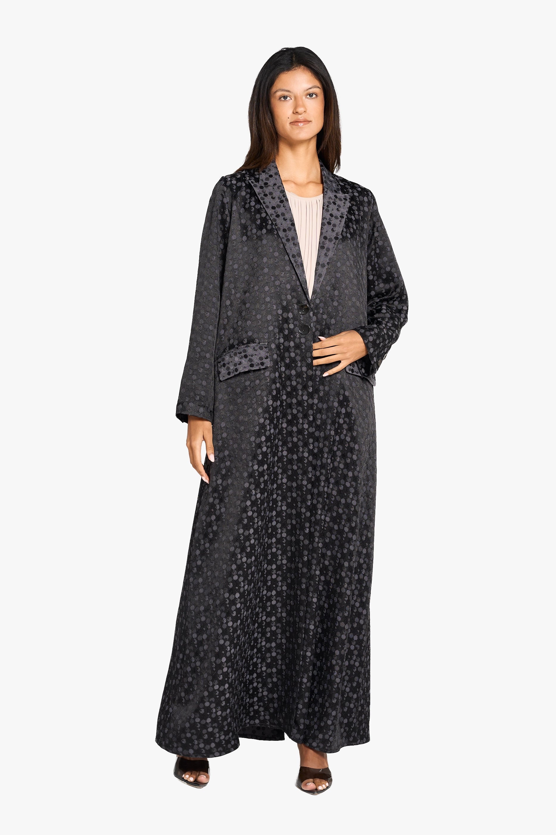 The LOUZAN JACQUARD DF81 represents contemporary modest fashion with sophisticated construction. This abaya features a distinctive polka-design jacquard fabric that delivers visual interest while maintaining elegance. The notch collar provides a refined neckline, while strategically placed pockets utilize the fabric's reverse side for subtle textural contrast. Metal button accents elevate the design, adding a modern touch to this timeless silhouette. Perfect for those seeking a smart, polished abaya that balances traditional styling with contemporary details.
