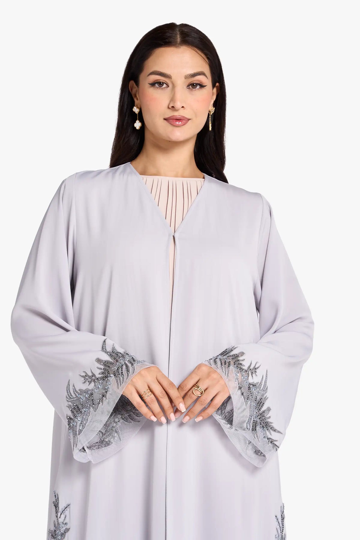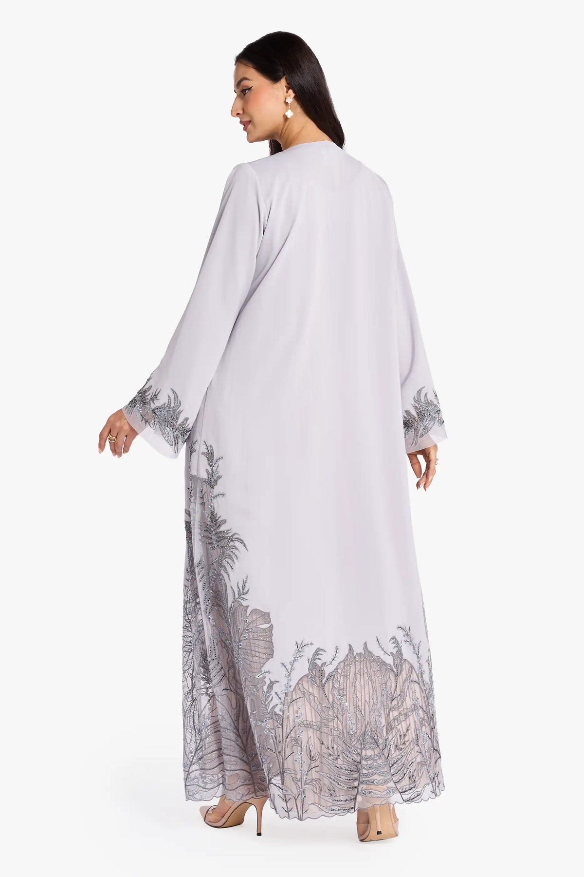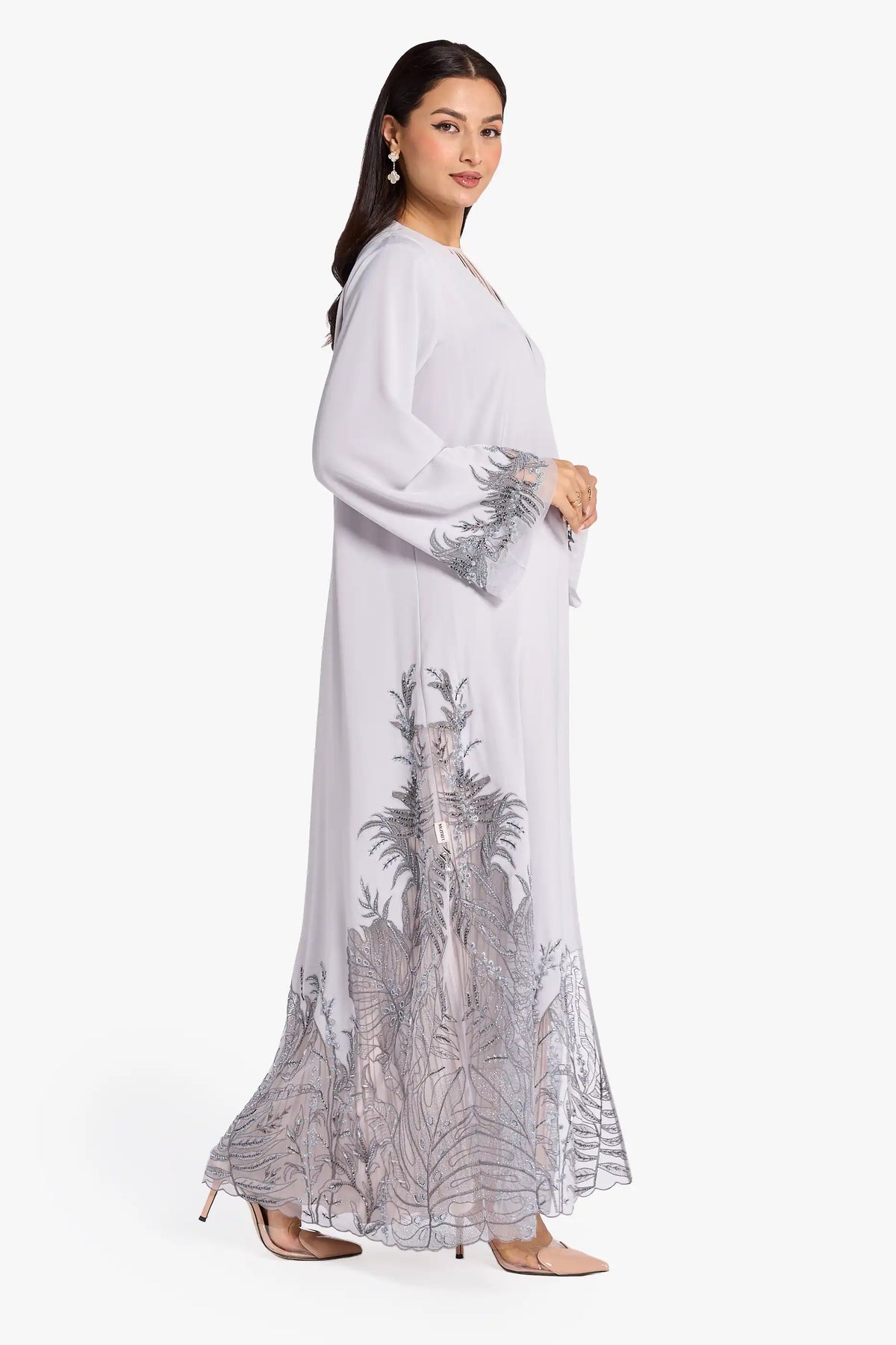 Louzan VIP Abaya Crafted In Nida Fabric With Intricately Embroidered Tropical Flora Design,Grey Color
