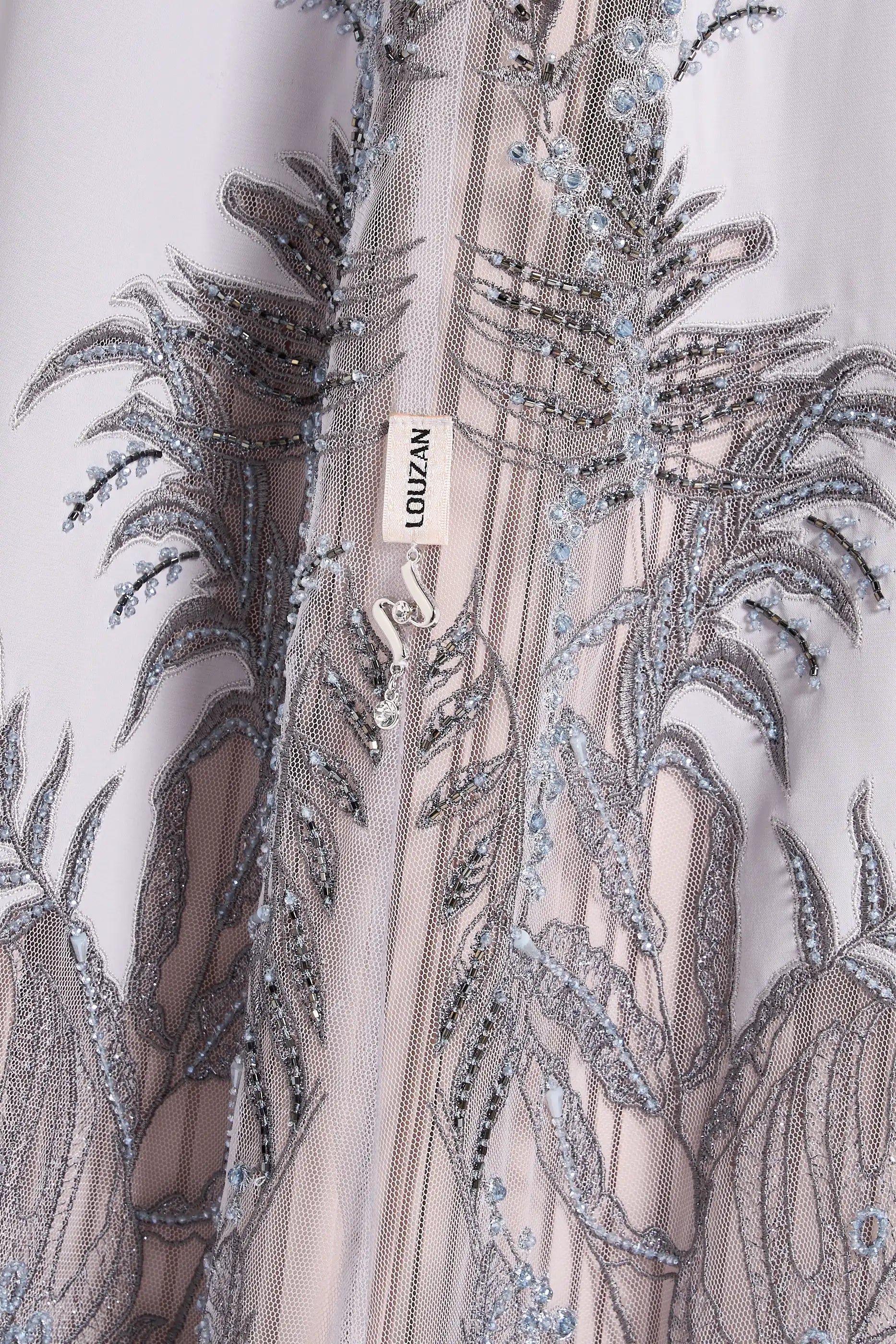 Louzan VIP abaya crafted in nida fabric with intricately embroidered tropical flora design using zari and dori, hand-embellished with sparkling crsytals and delicate beads, it brings together the artistry and elegance. Perfect for refined, statement-making occasions.