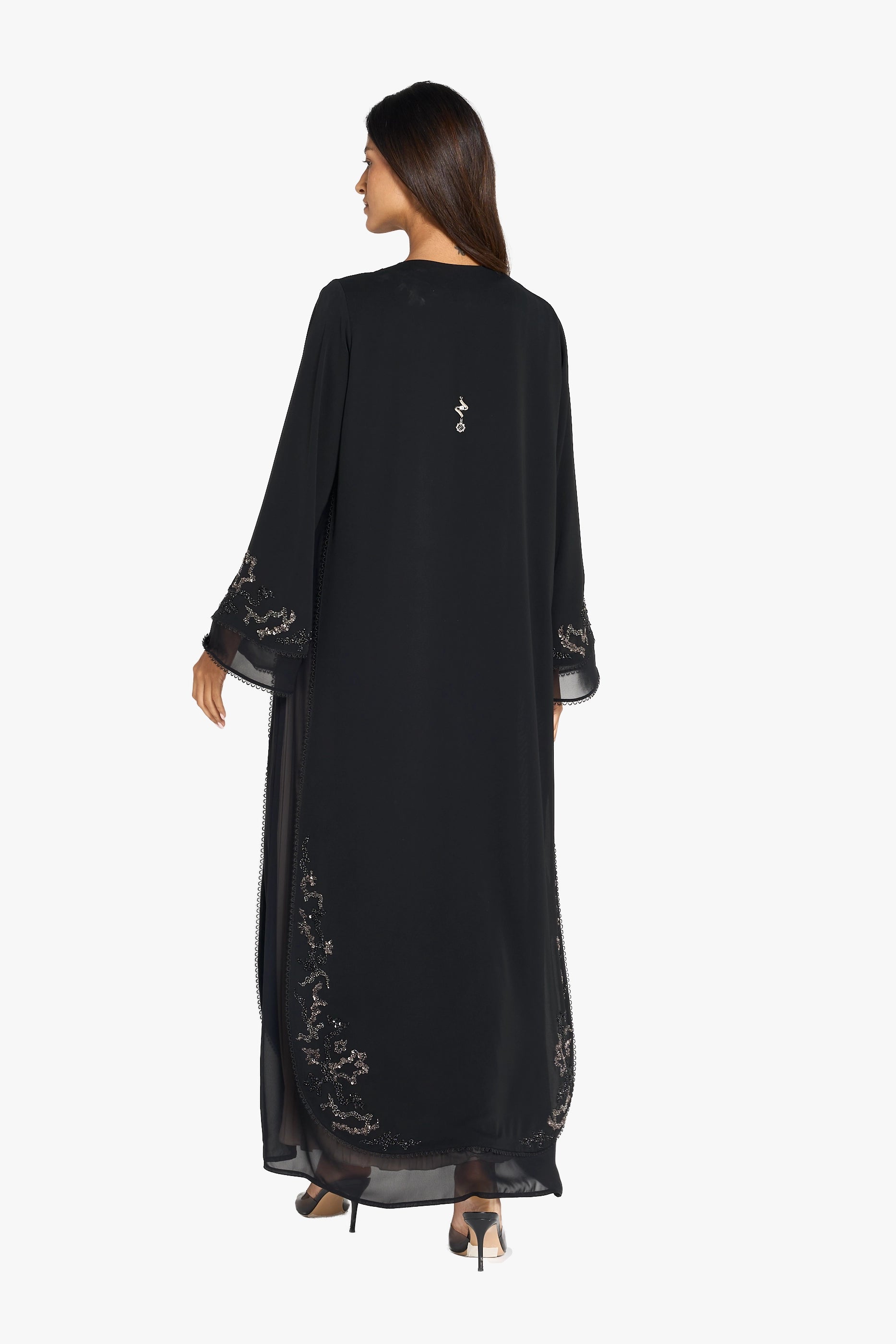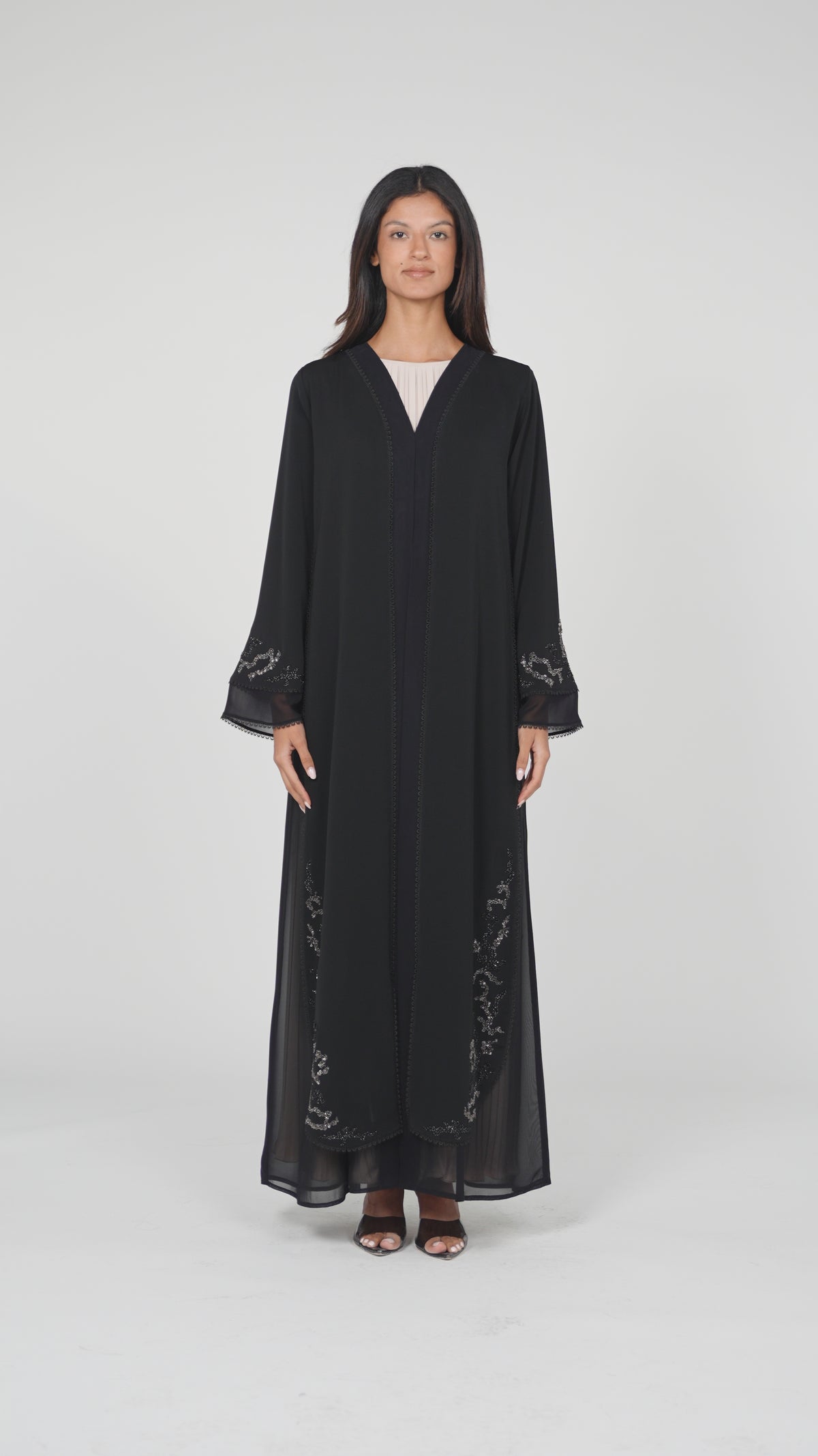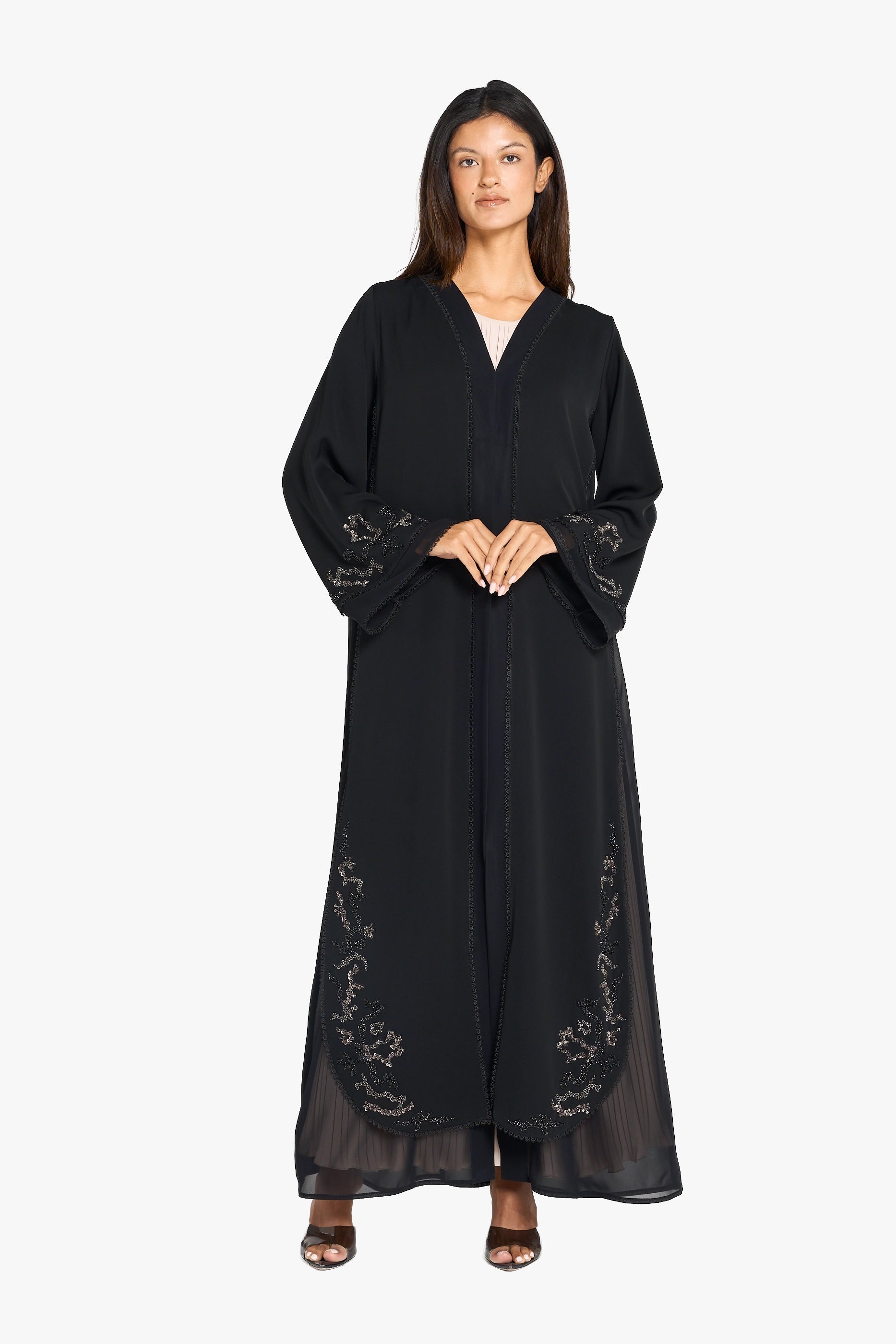 Elevate your modest fashion collection with this refined Louzan abaya, meticulously designed for the discerning wearer. The luxurious nida fabric provides a comfortable, structured foundation, while graceful double chiffon side panels create fluid movement and visual dimension. Intricate abstract sequin embellishments add a contemporary edge, transforming a timeless silhouette into a statement piece. Perfect for occasions demanding understated sophistication with modern flair, this abaya seamlessly bridges tradition and contemporary style.