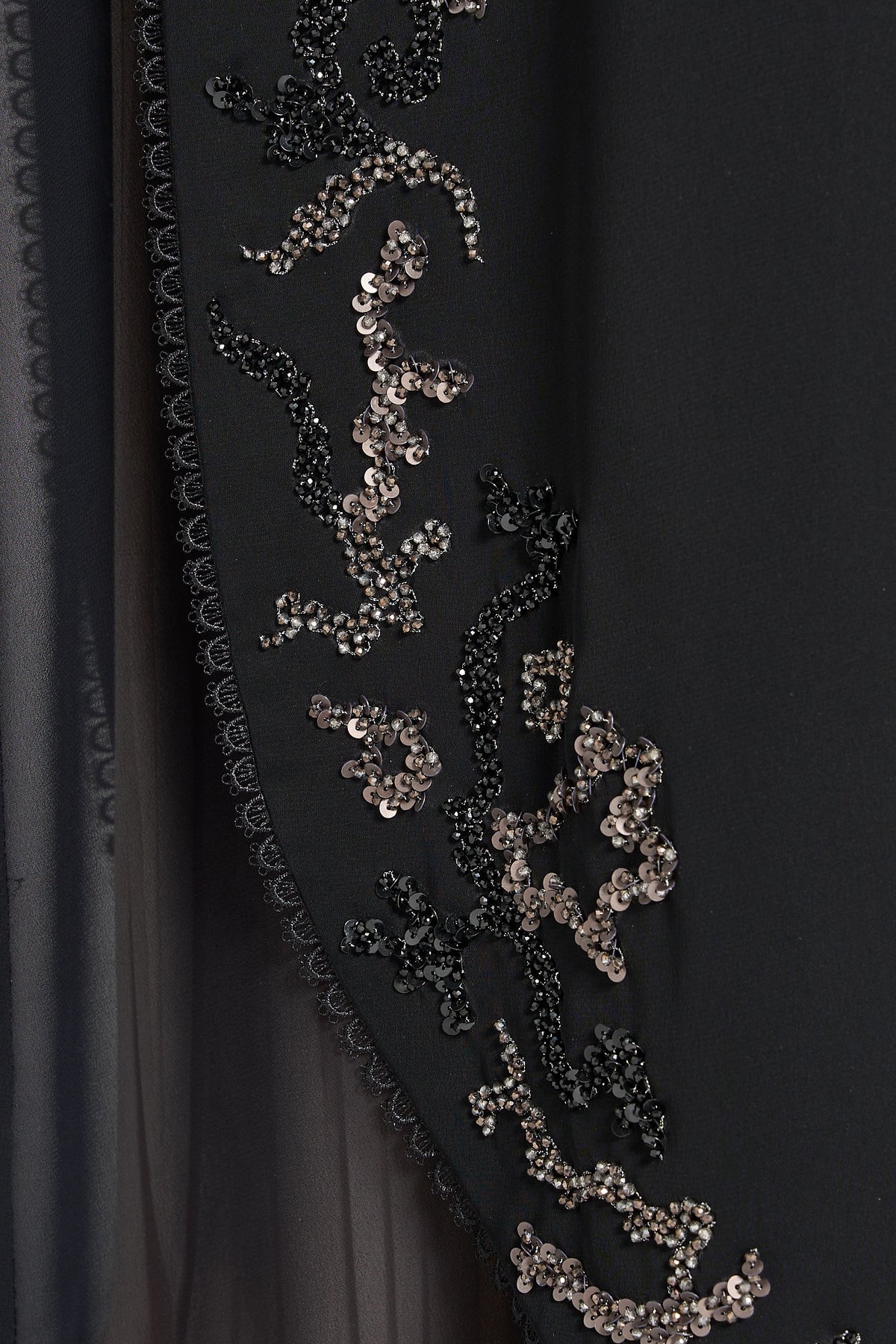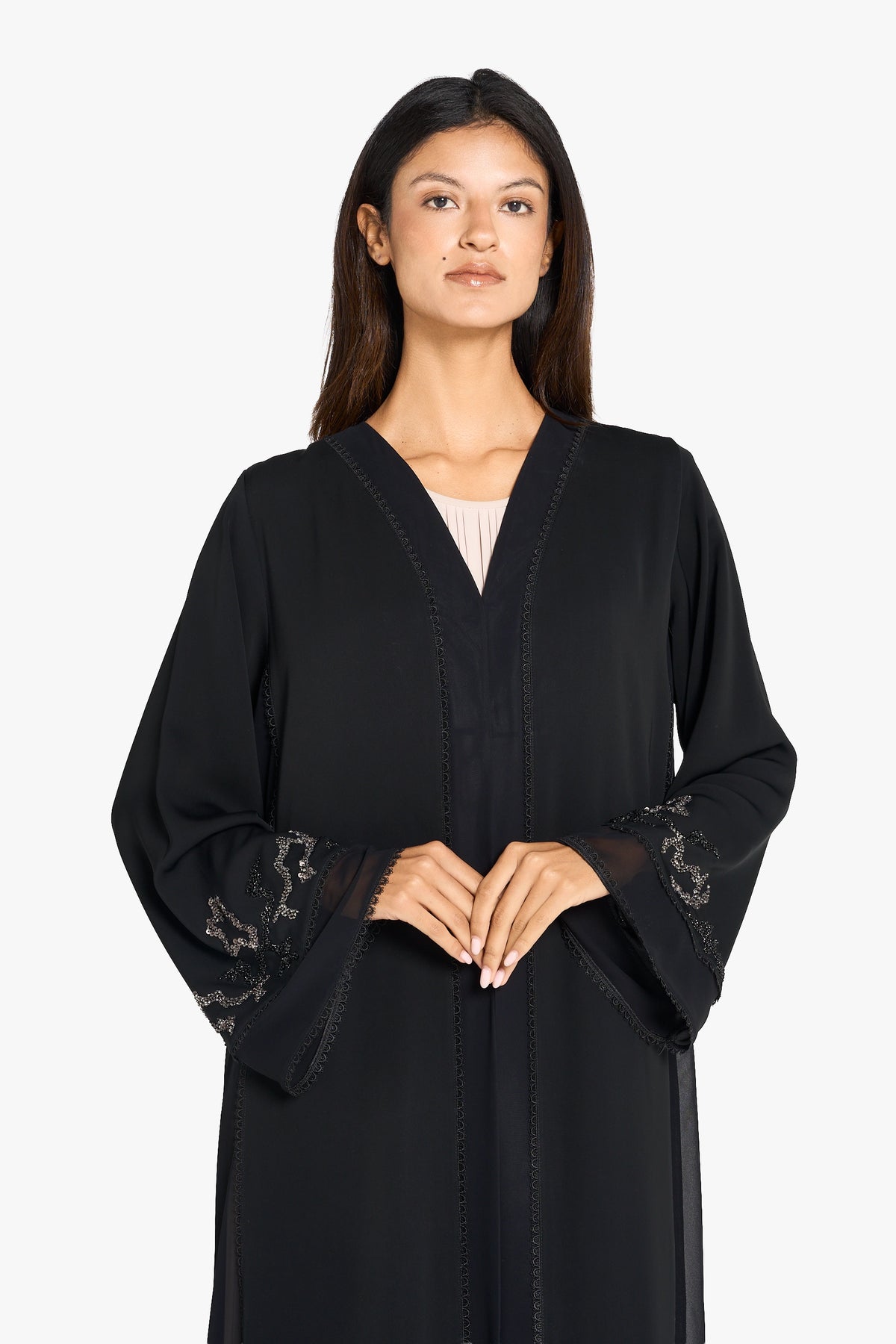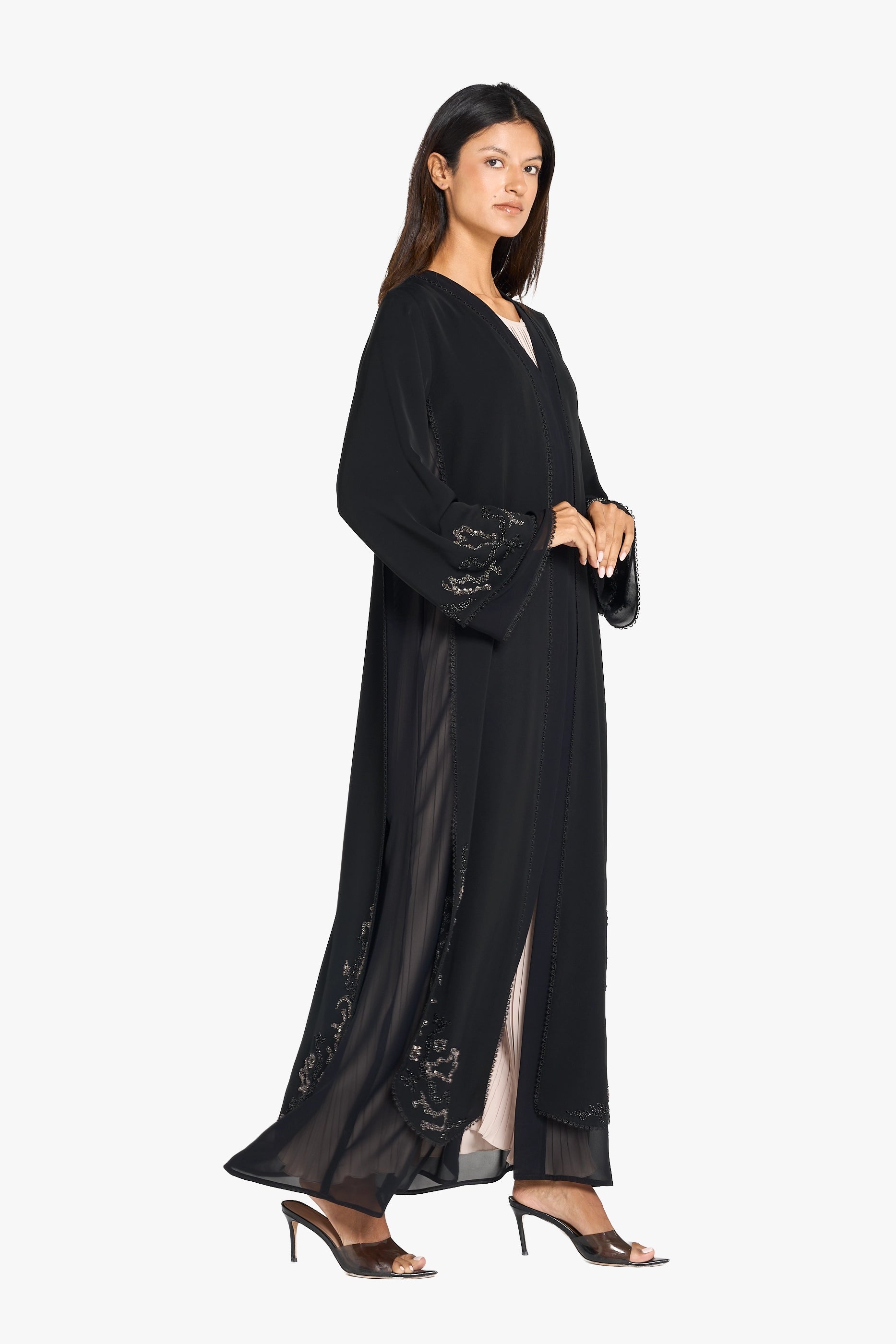 Elevate your modest fashion collection with this refined Louzan abaya, meticulously designed for the discerning wearer. The luxurious nida fabric provides a comfortable, structured foundation, while graceful double chiffon side panels create fluid movement and visual dimension. Intricate abstract sequin embellishments add a contemporary edge, transforming a timeless silhouette into a statement piece. Perfect for occasions demanding understated sophistication with modern flair, this abaya seamlessly bridges tradition and contemporary style.