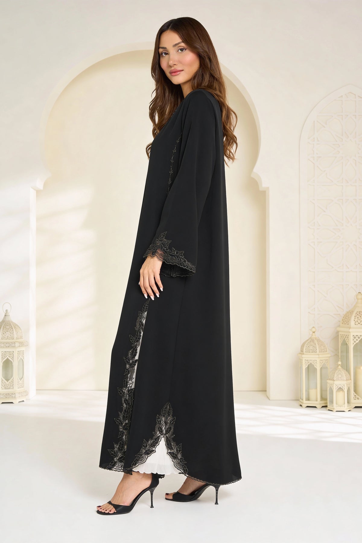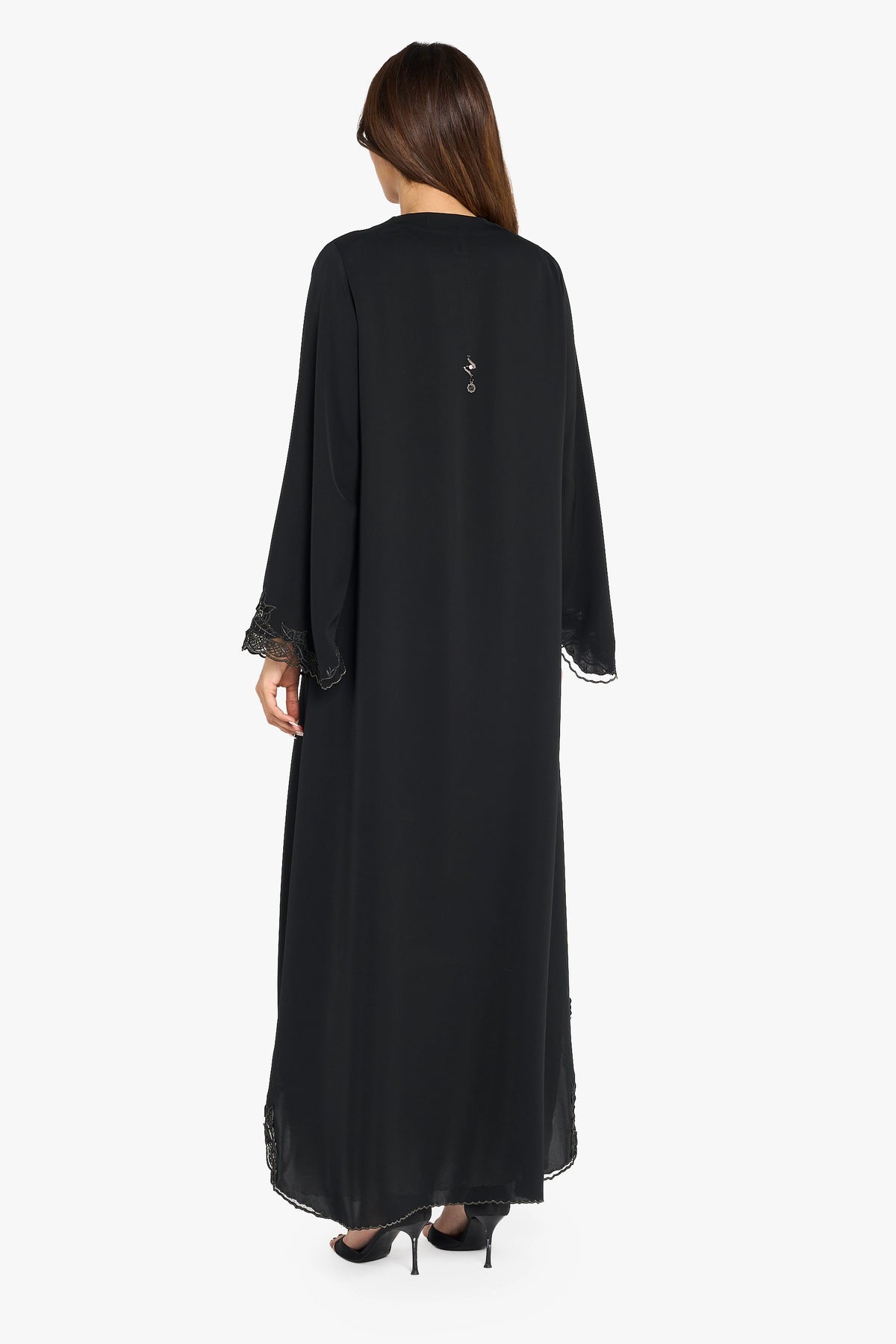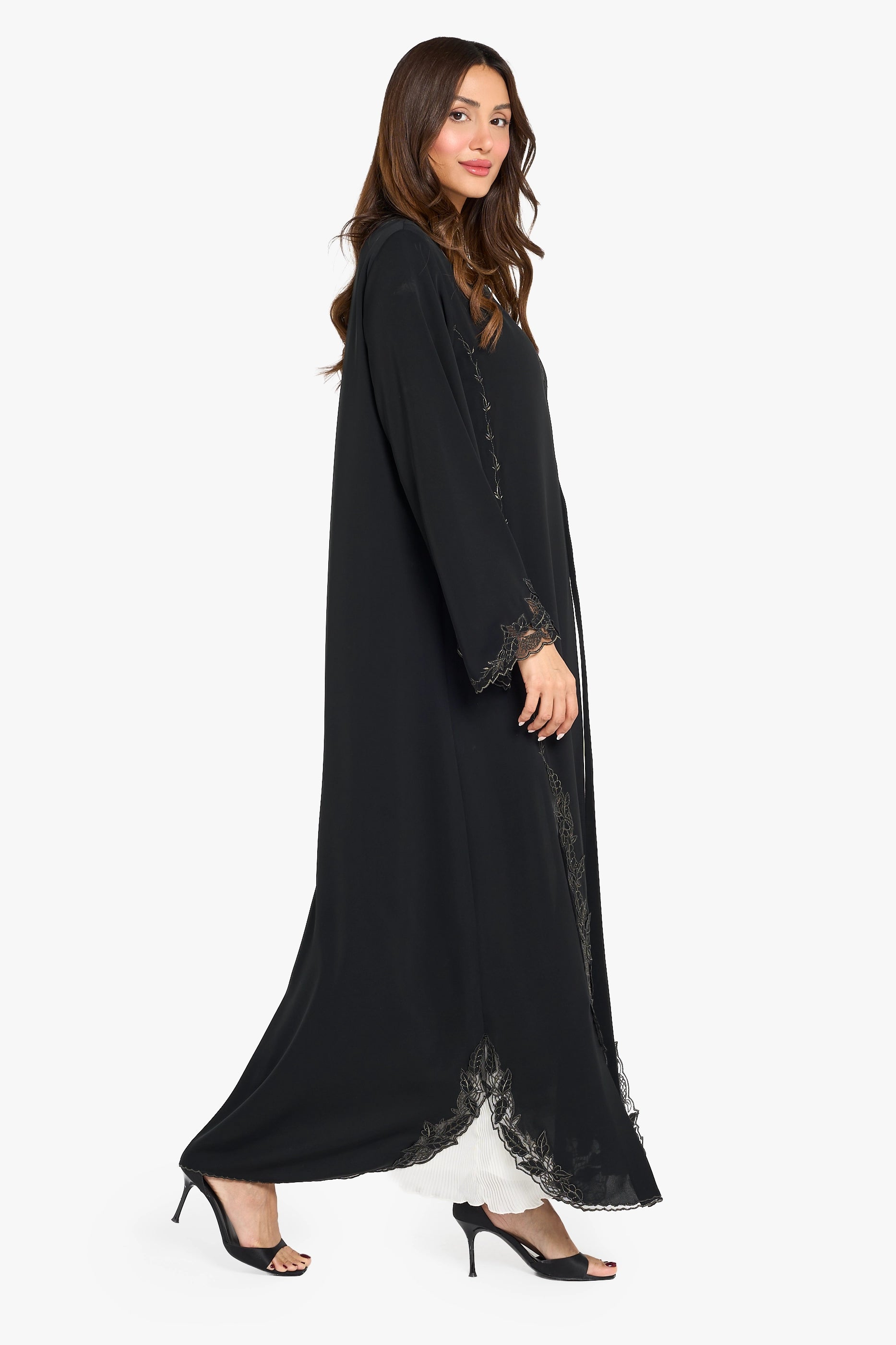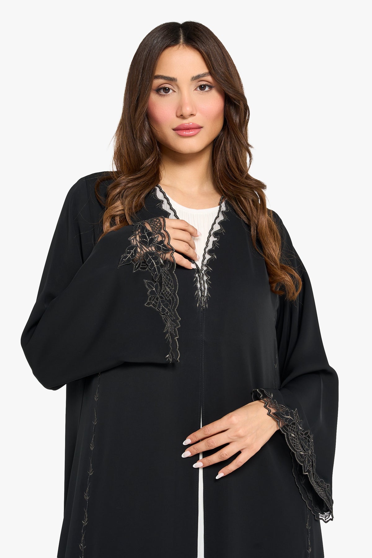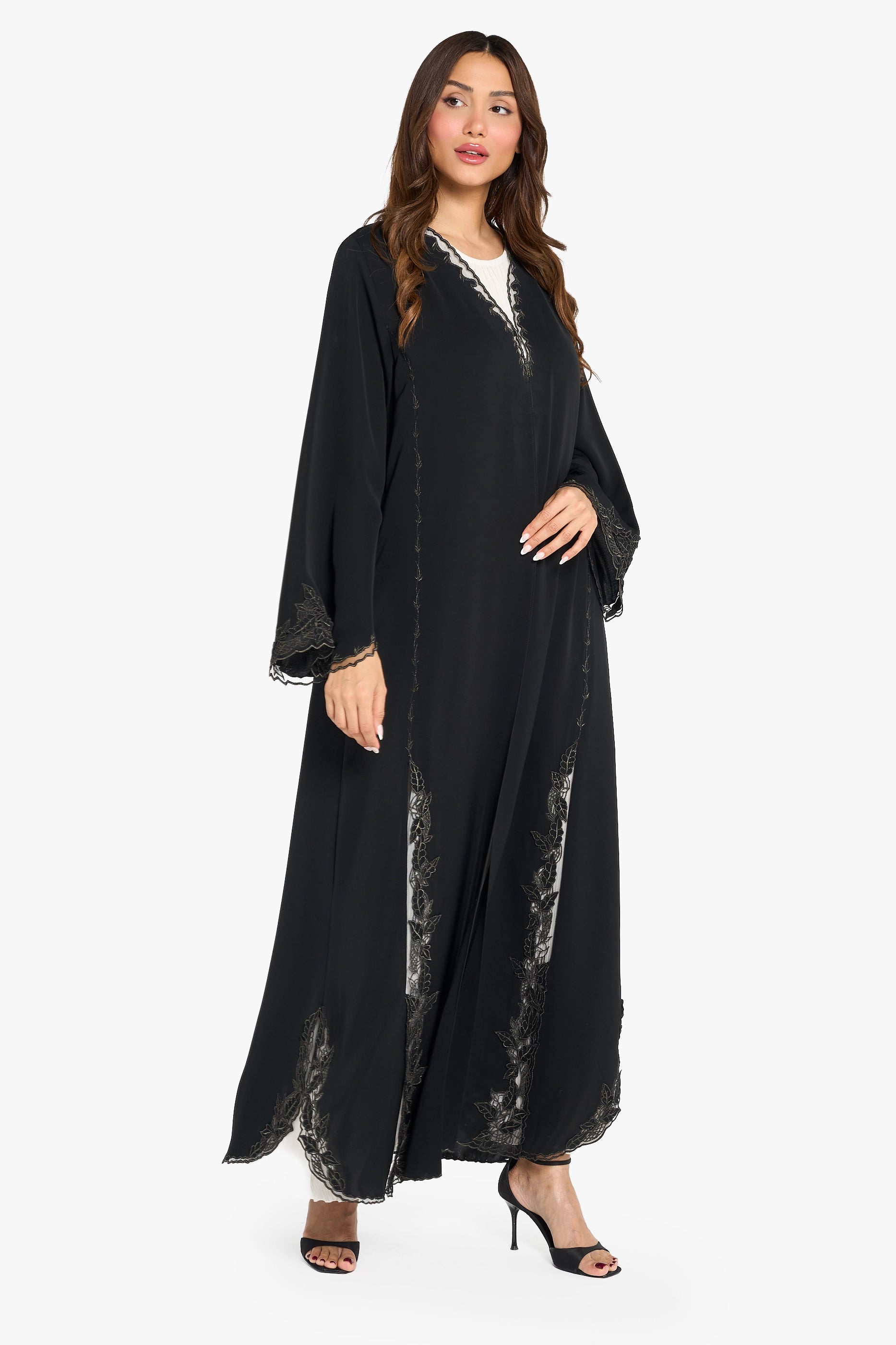 A Louzan abaya crafted from soft nida, featuring delicate floral tatree embroidery. A timeless piece that embodies classic sophistication and refined elegance.