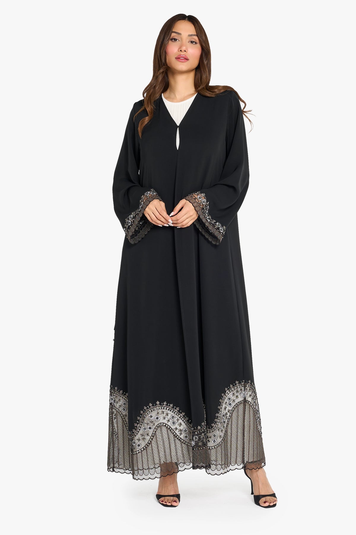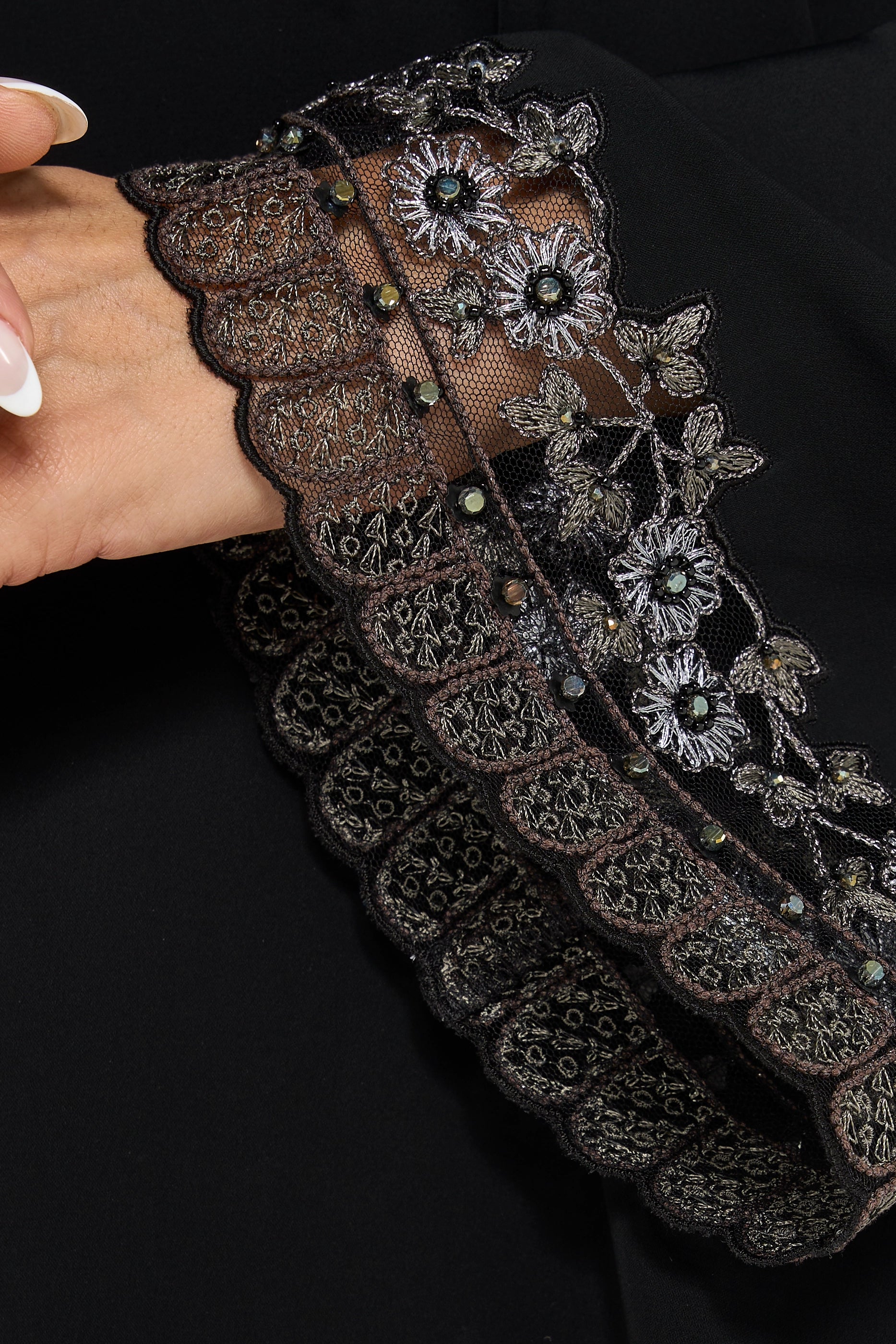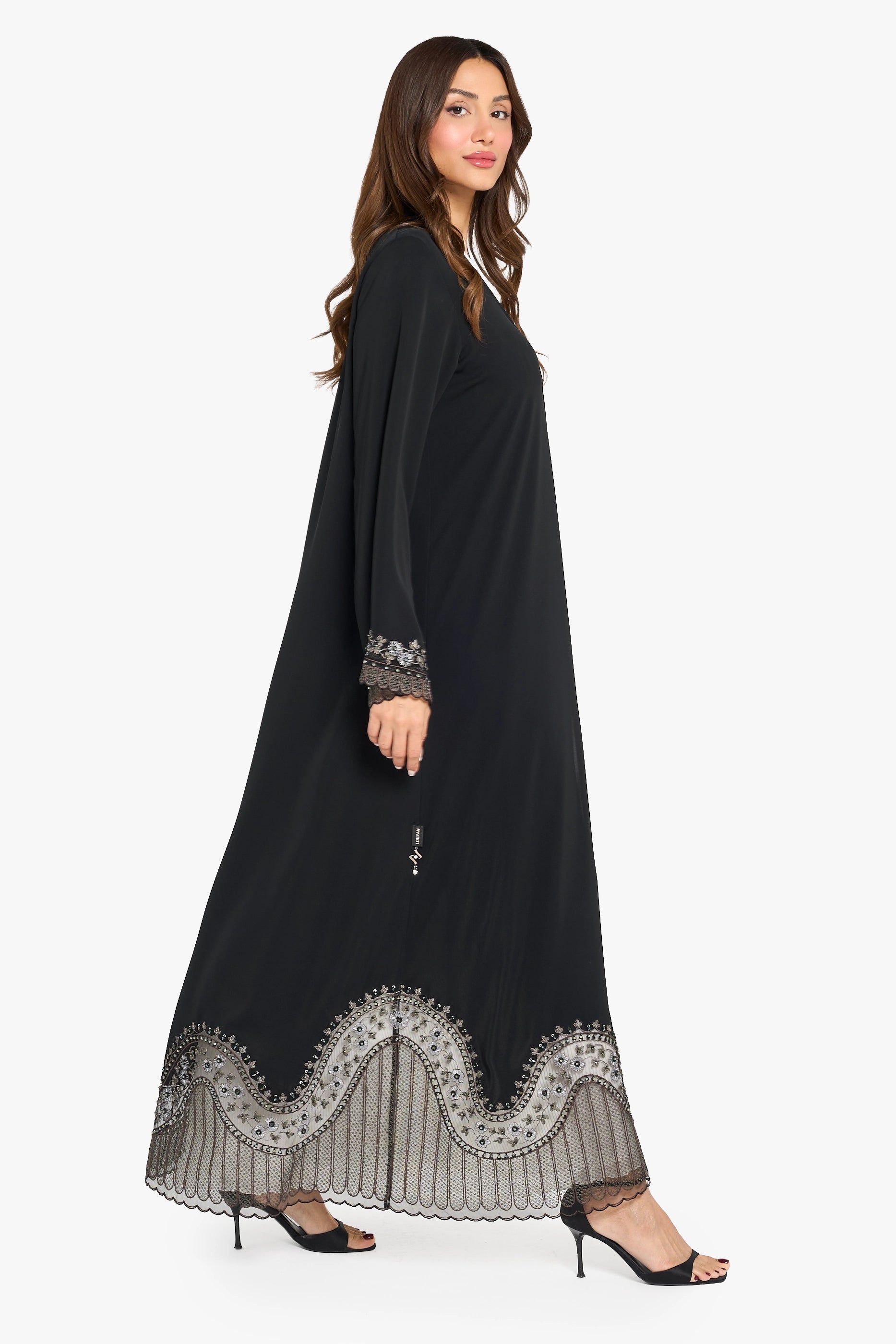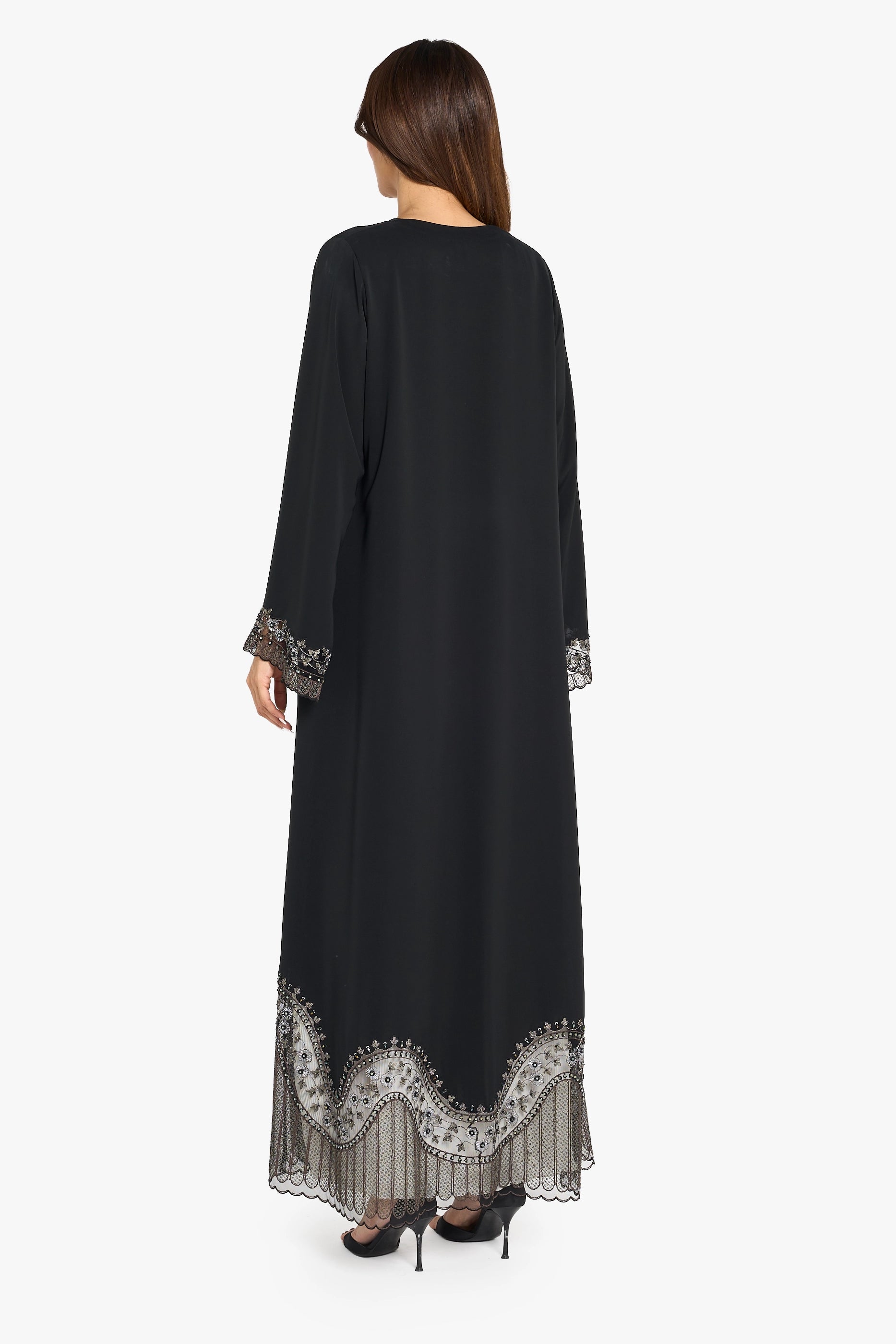 black abaya with green color geometric floral pattern computer embroidery highlighting with crystal work