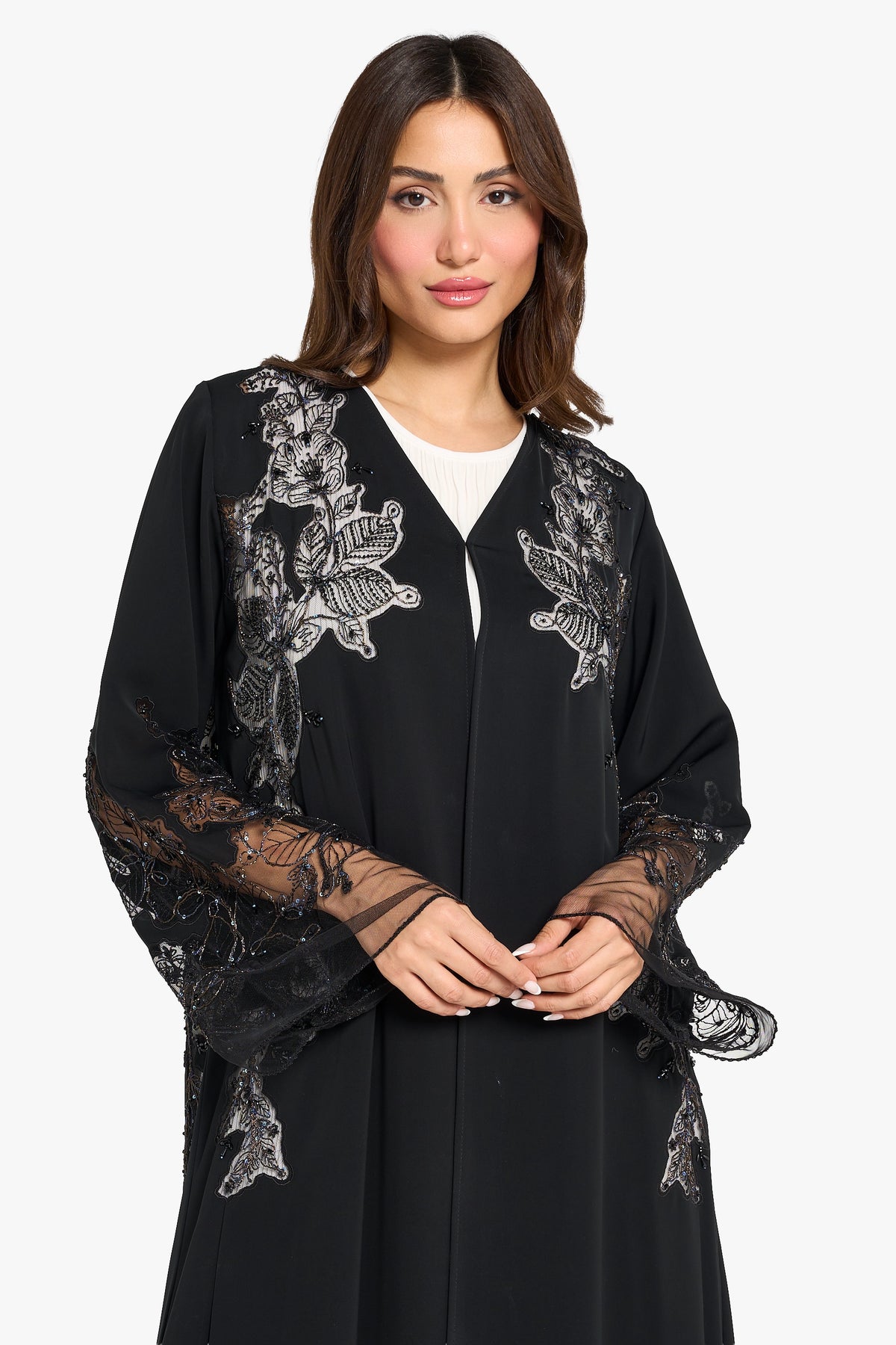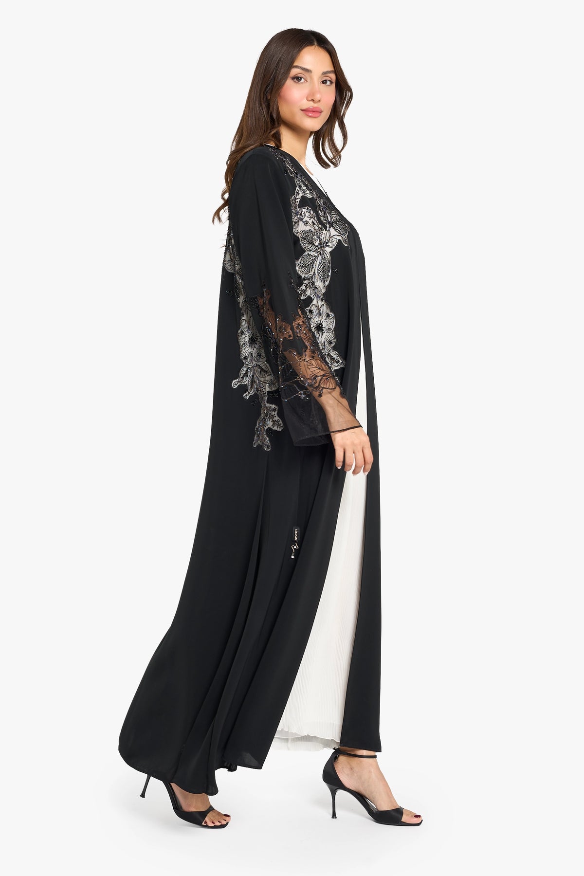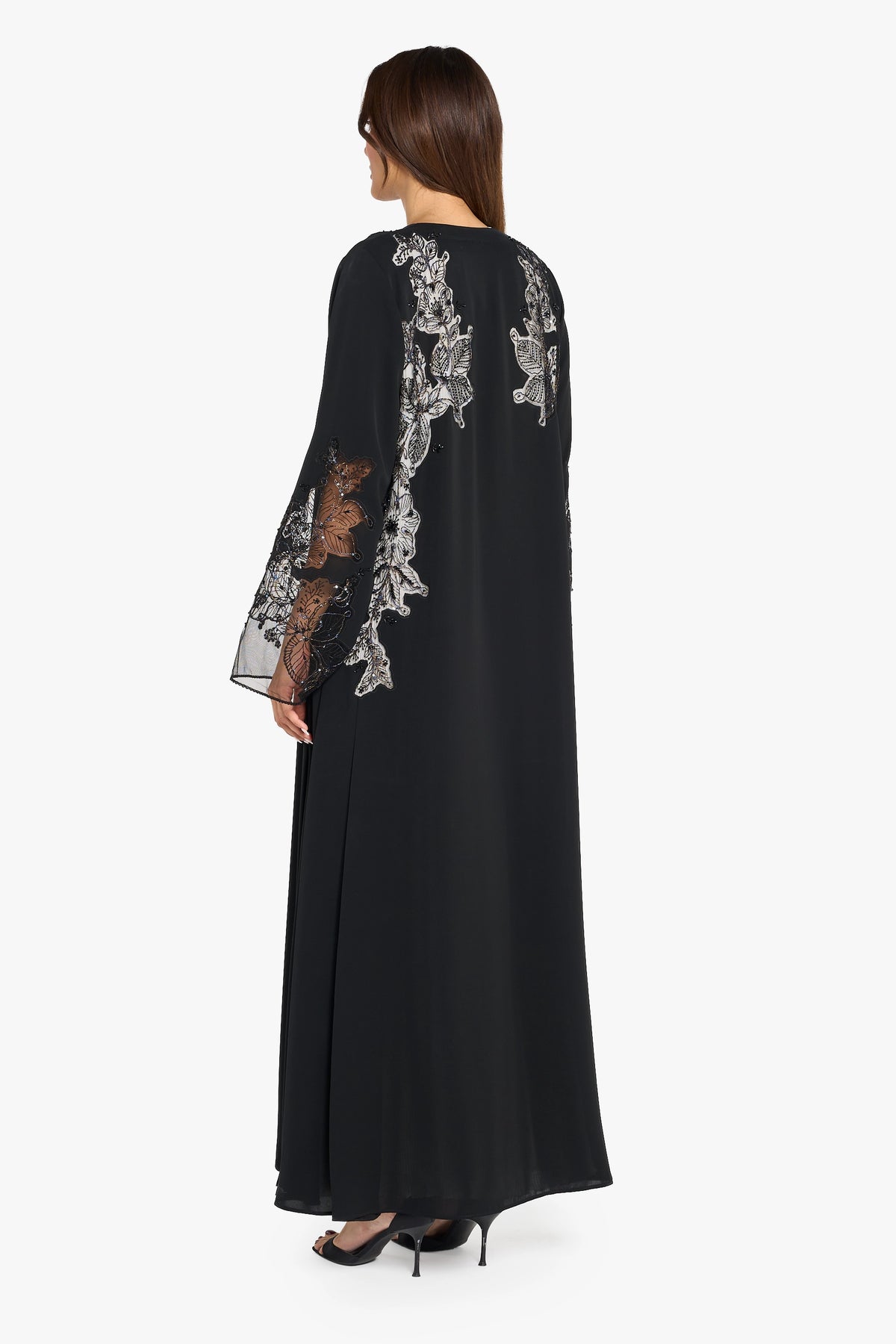 Black abaya with large modern floral pattern dori embroidery highlighting with 3d crystal work