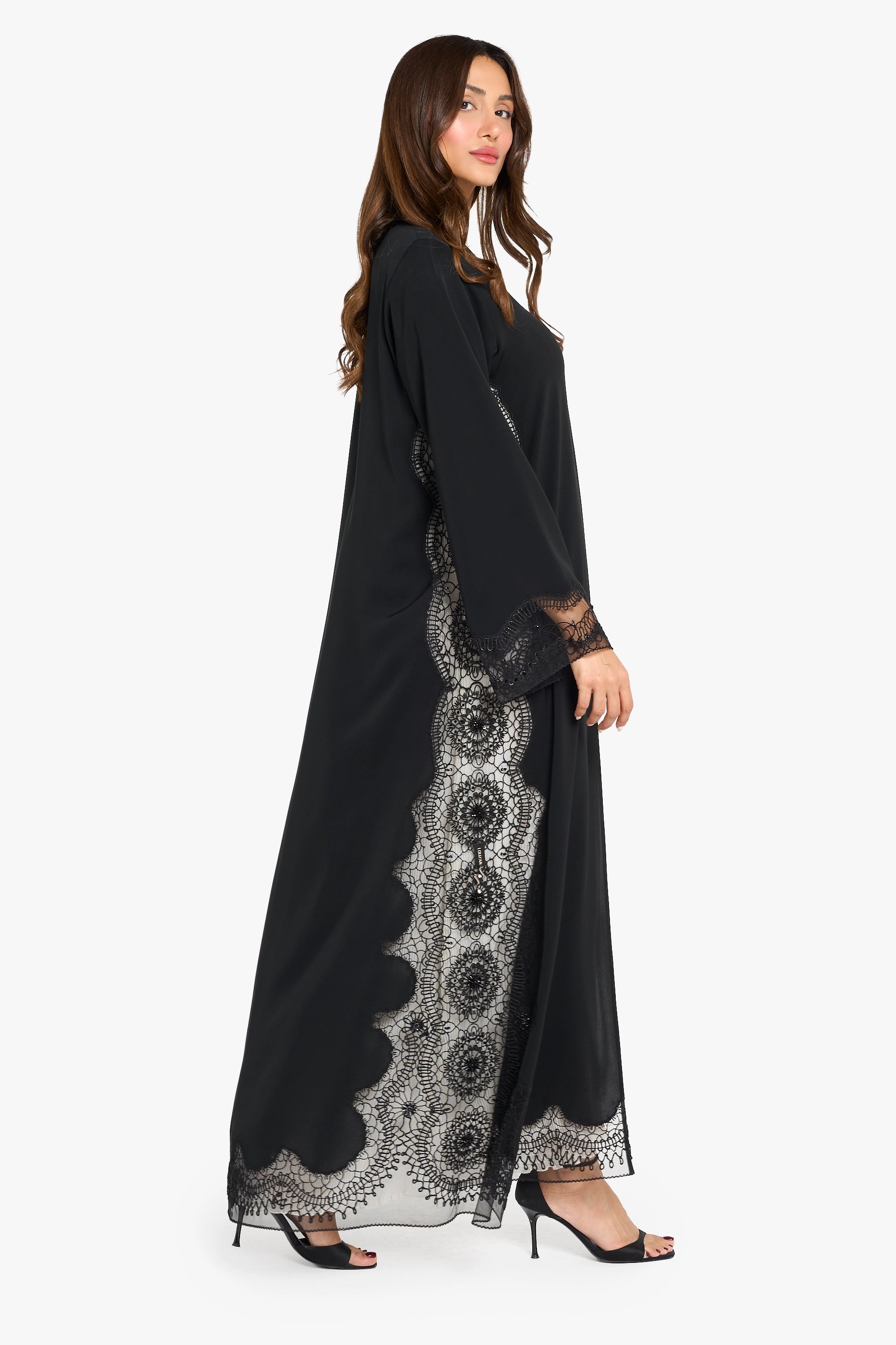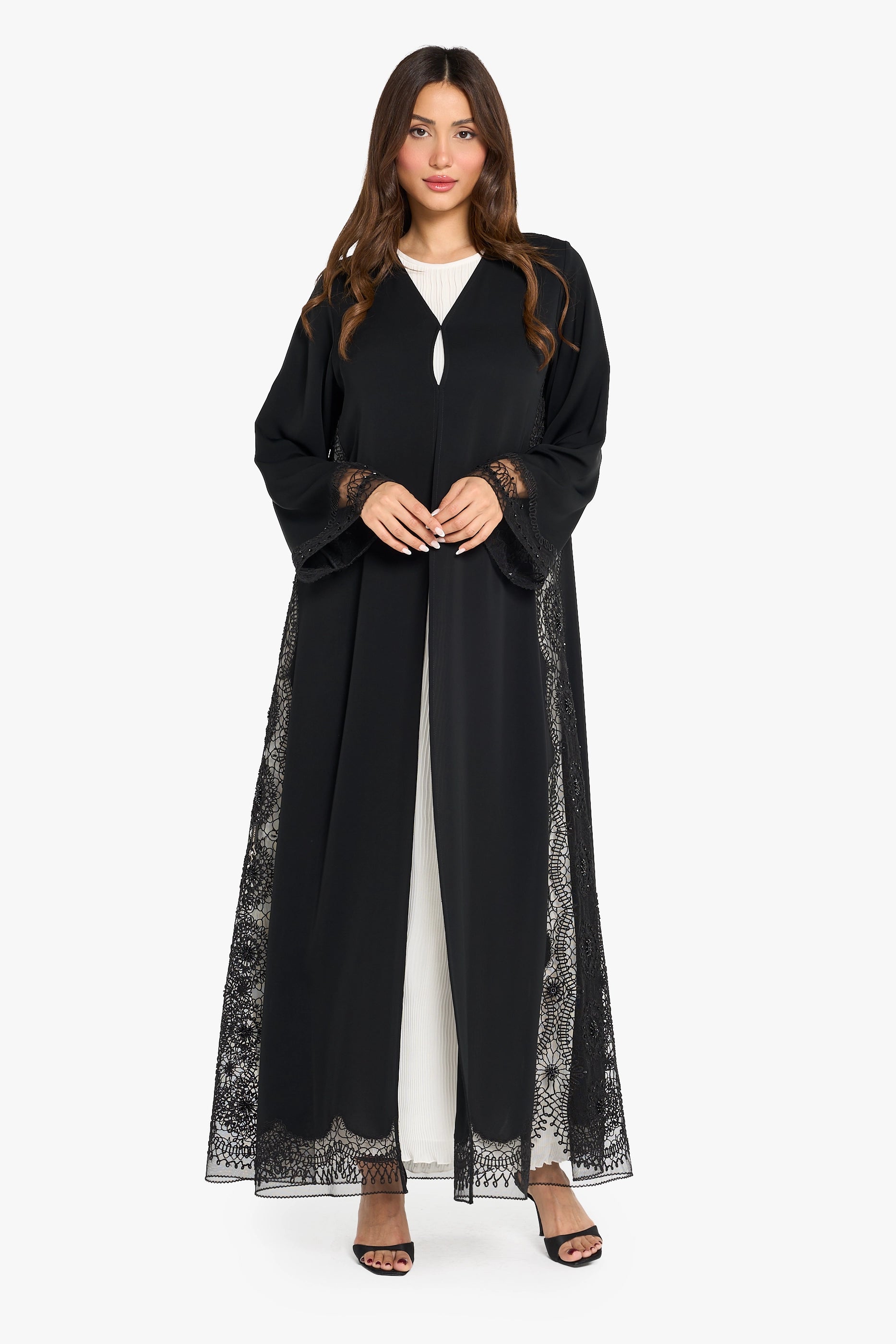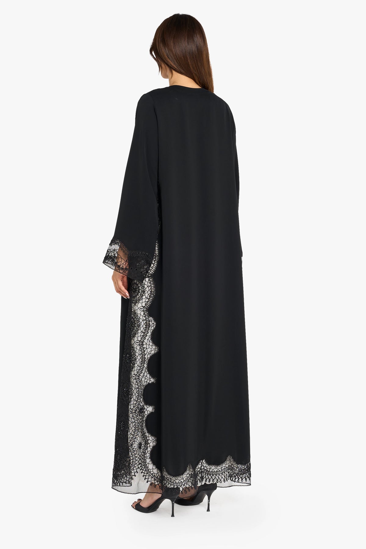 Black abaya with black color modern floral crochet dori computer embroidery, highlighting with crystal work