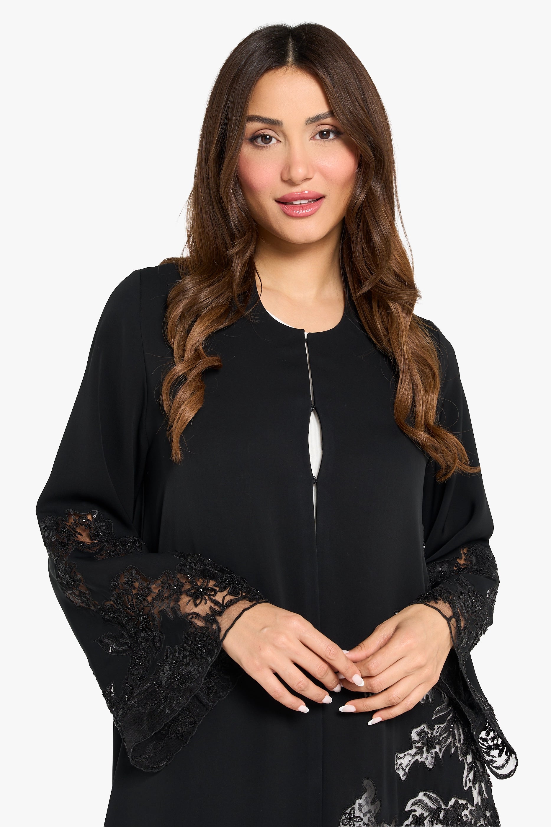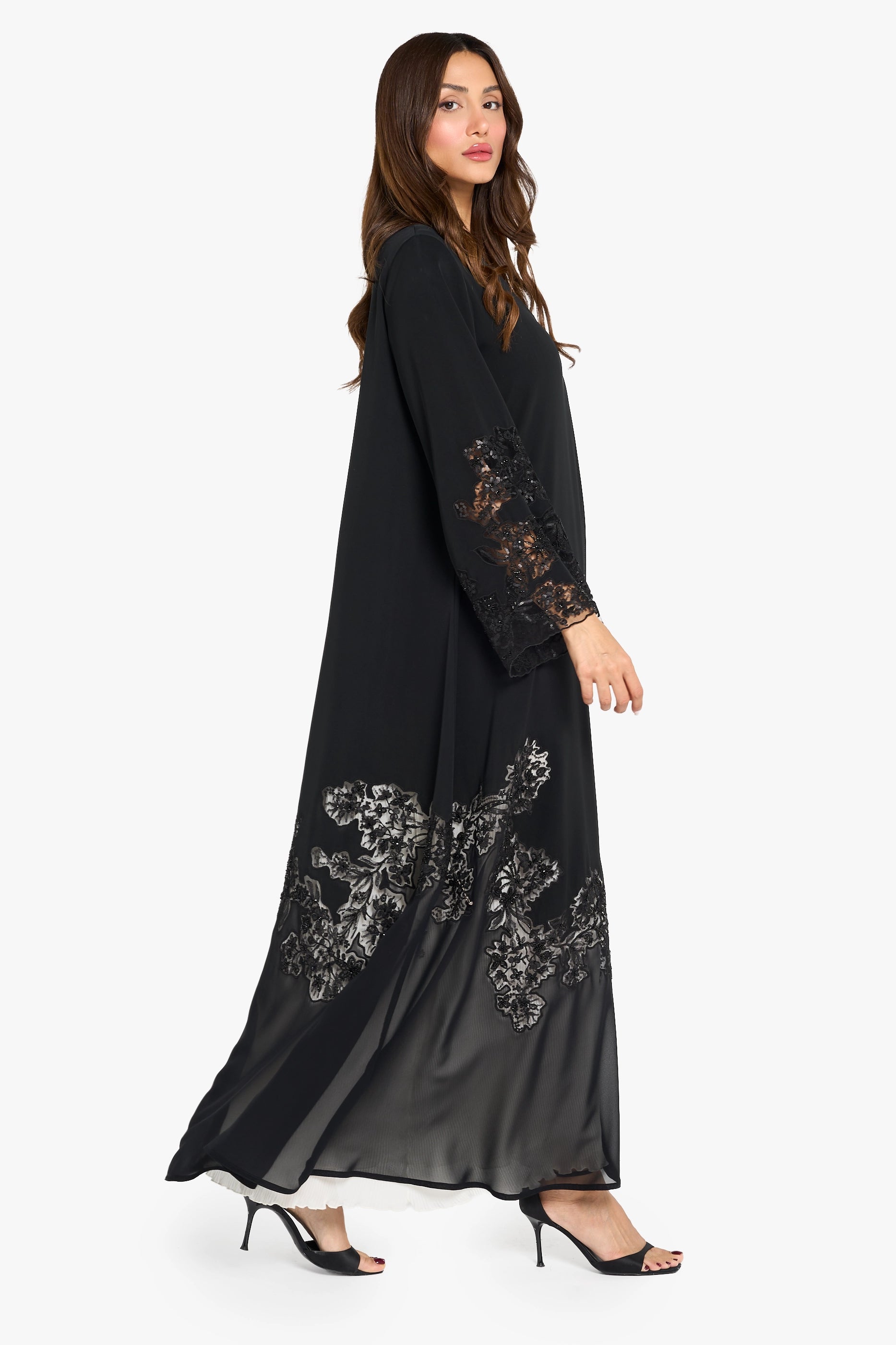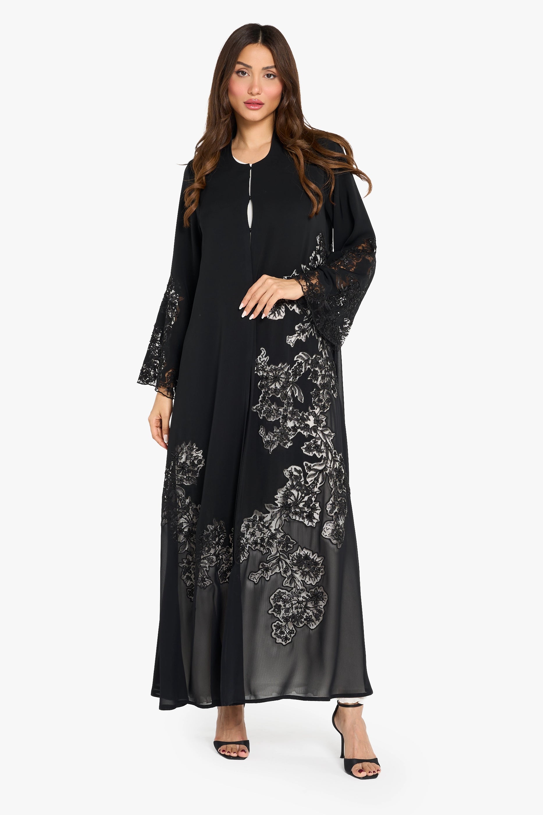 Louzan abaya crafted in soft nida and chiffon fabrics, it offers an elegant flow with a light, graceful finish. Featuring a floral embroidery design, the detailing is beautifully executed with fine thread, shimmering sequins, and delicate beadwork. The asymmetrical placement of the embroidery adds a modern edge, creating a striking balance between classic femininity and contemporary style. A perfect choice for those who appreciate luxe, chic, and modern elegance.