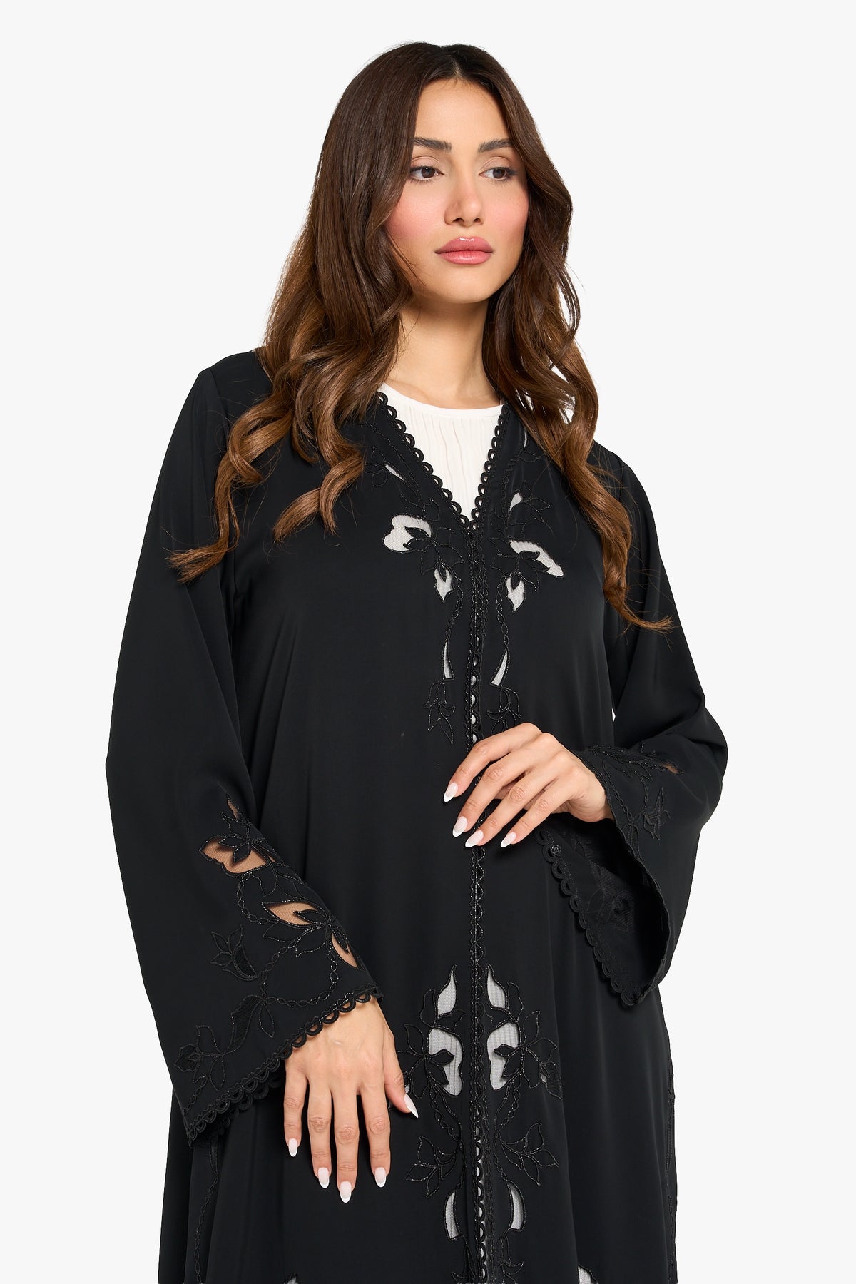 Louzan abaya crafted from colored nida fabric, the Louzan Abaya features an intricate laser-cut floral design, beautifully enhanced with delicate dori embroidery. This combination of precision craftsmanship and elegant detailing creates a chic and modern statement piece, perfect for sophisticated occasions.