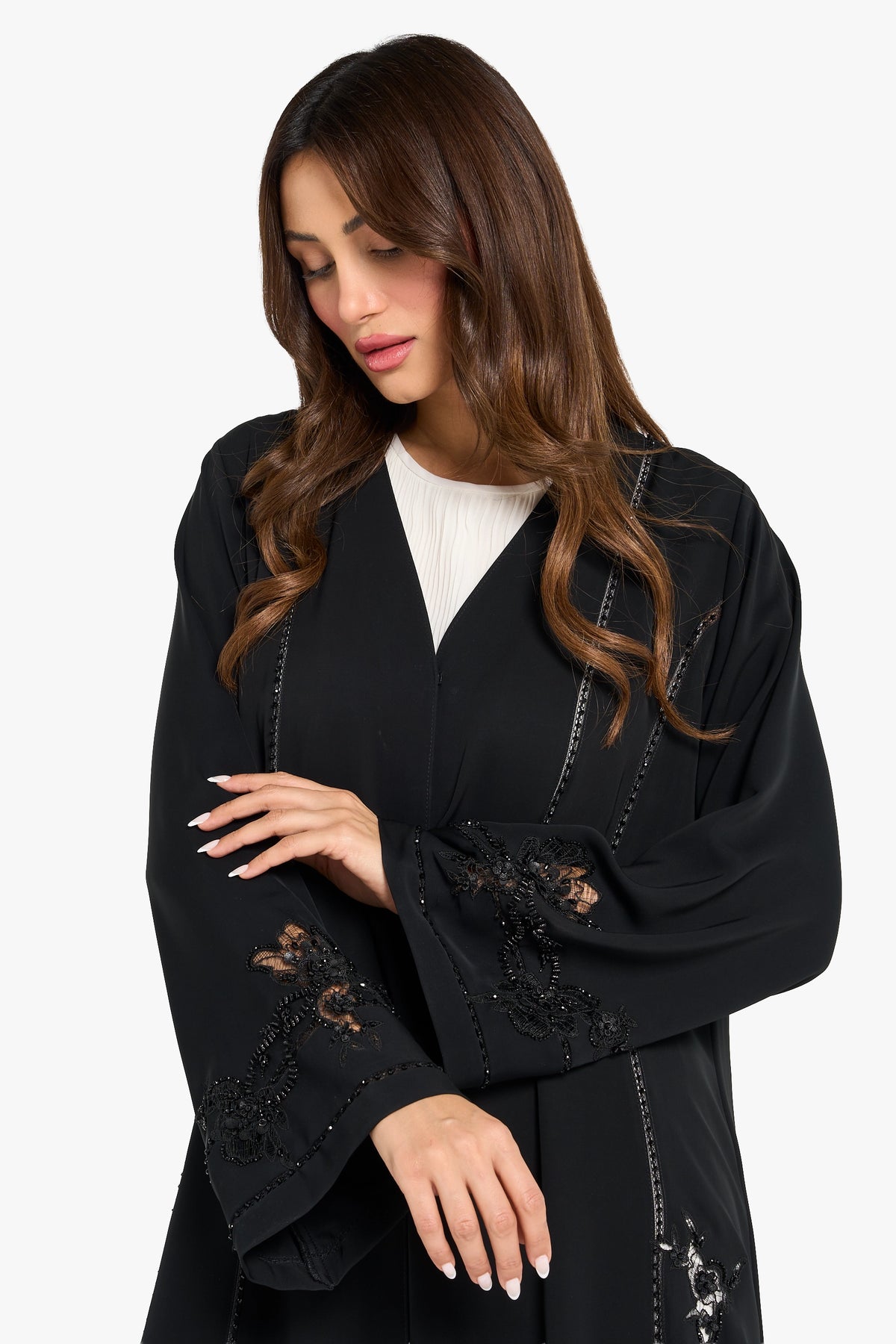 Louzan abaya crafted from premium nida fabric and delicate lace,it is beautifully embellished with shimmering crystals and beads. The intricate detailing adds a touch of luxe elegance while maintaining a chic, modern silhouette. Perfect for sophisticated occasions, this abaya blends timeless refinement with contemporary style.