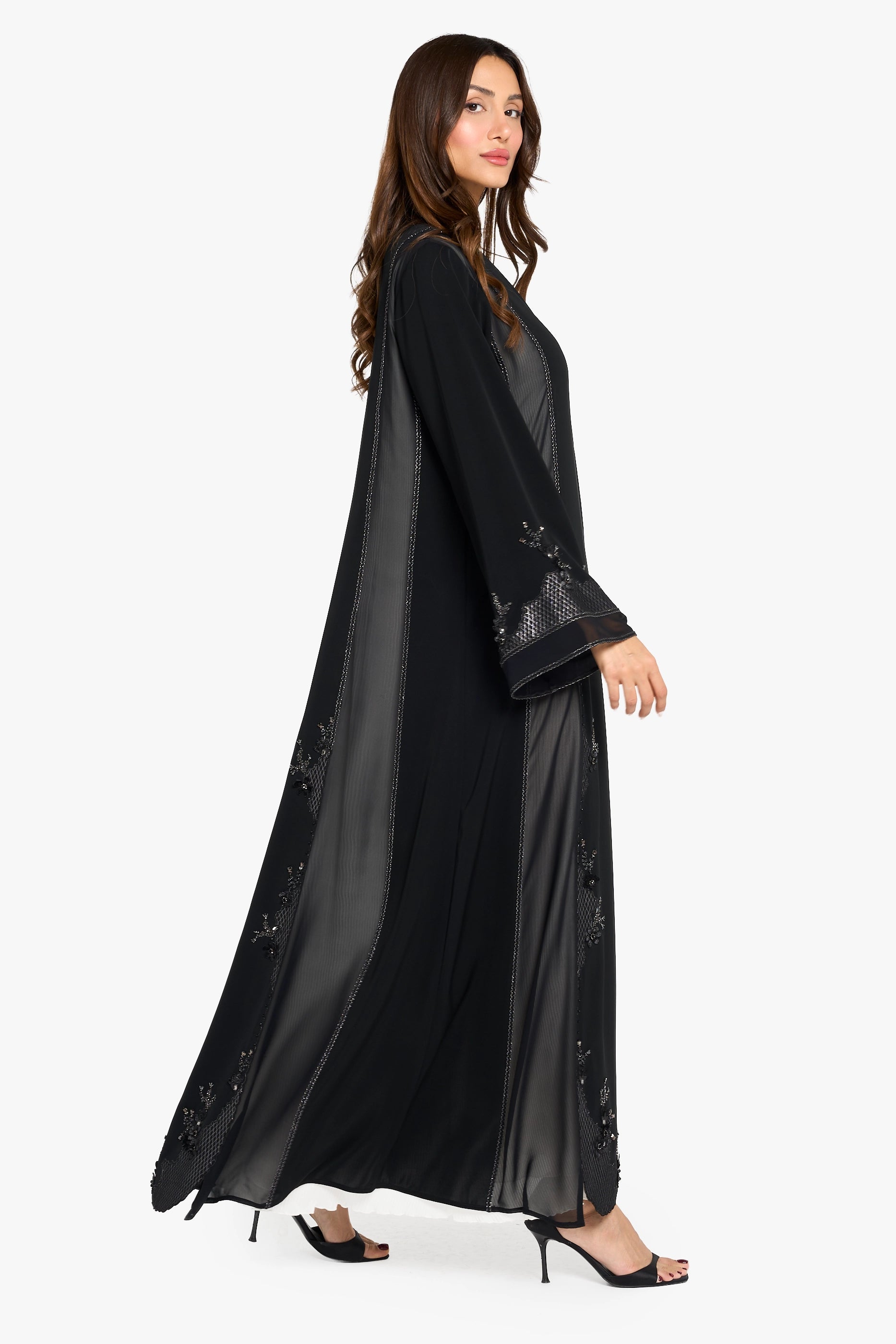 Louzan abaya crafted from premium nida fabric with flowing chiffon panels, it is adorned with intricate dori embroidery and elegantly embellished with crystals and beads. The combination of soft layers, detailed craftsmanship, and subtle shimmer creates a luxurious, chic, and modern silhouette, perfect for special occasions or sophisticated everyday wear.