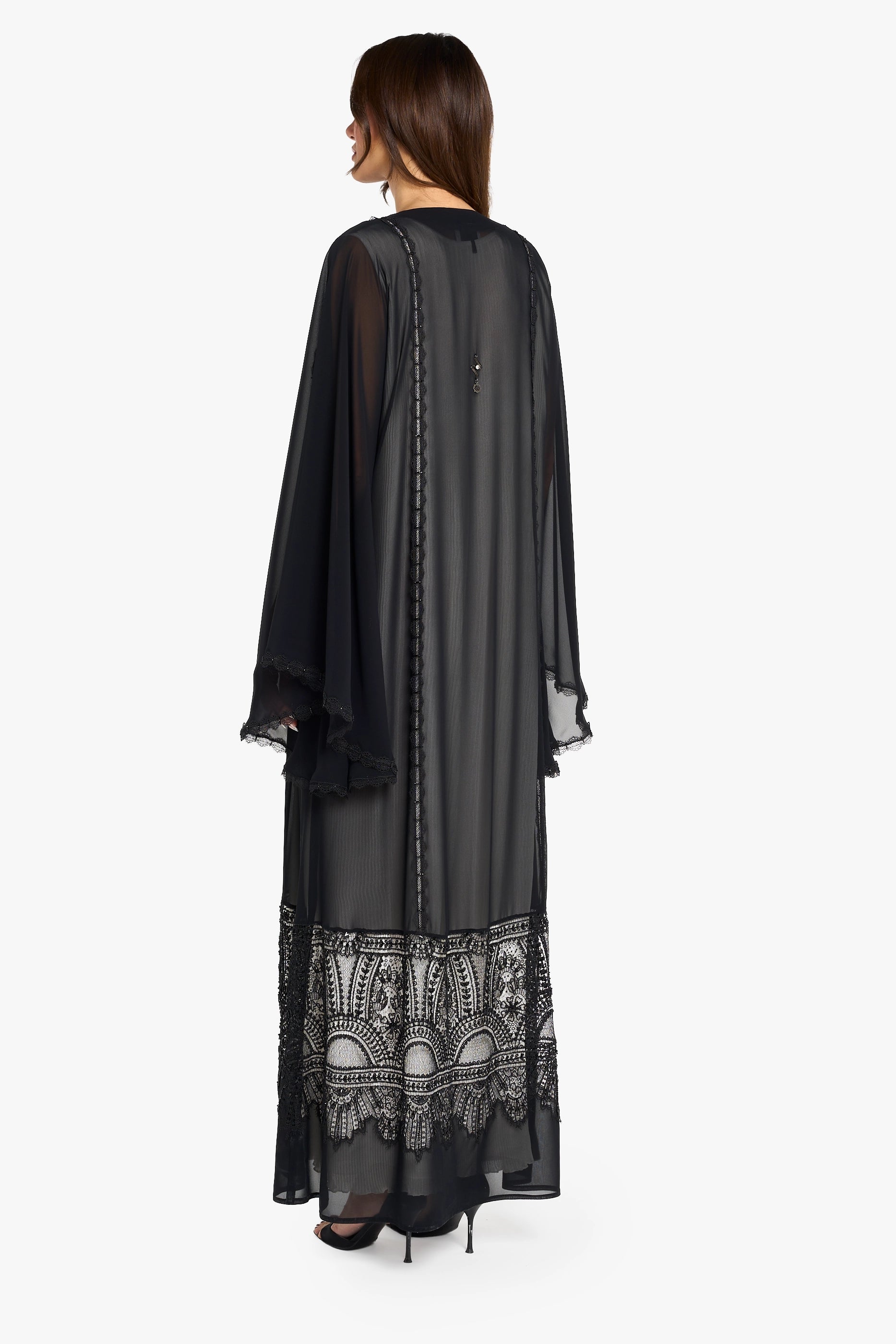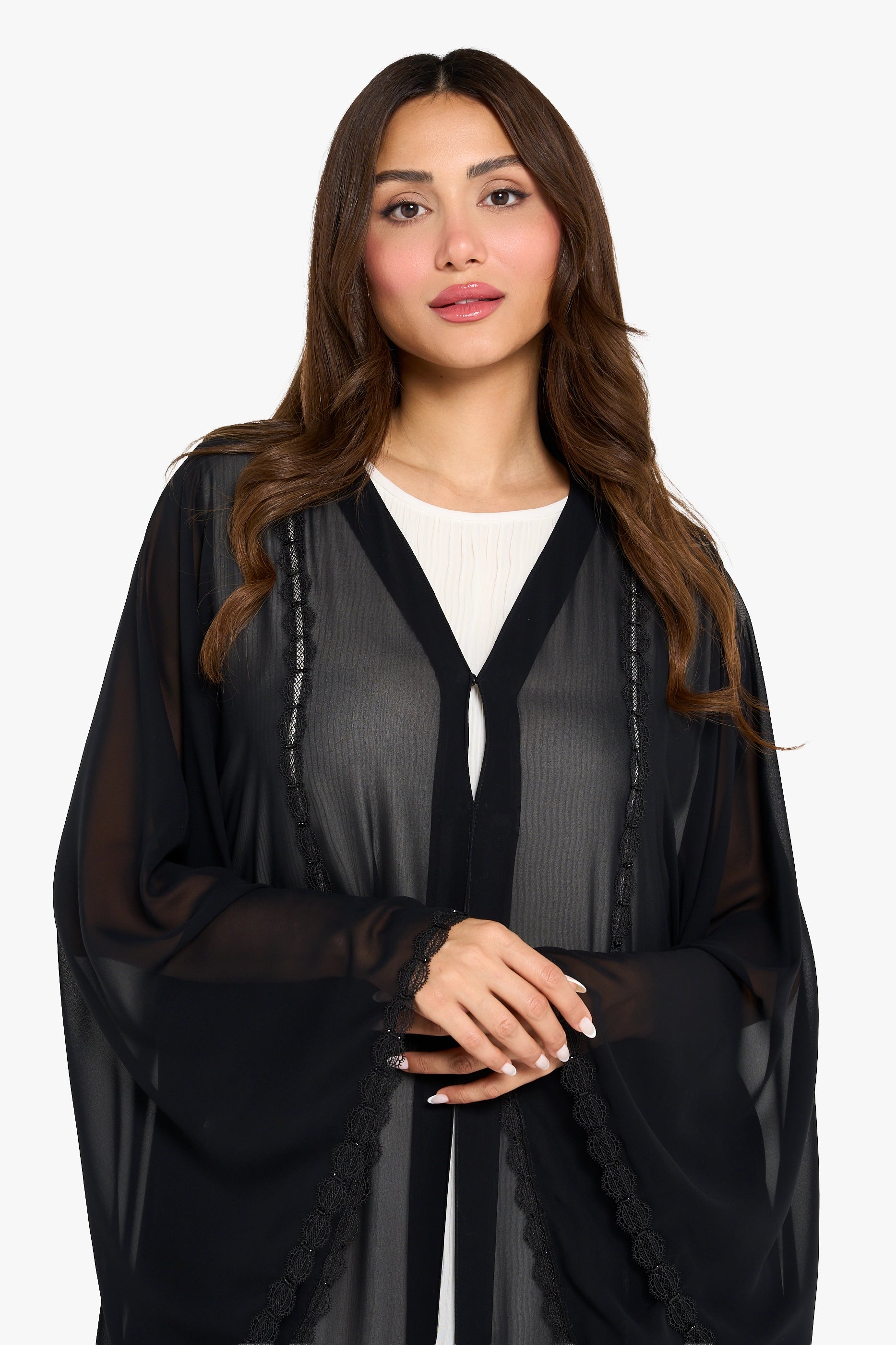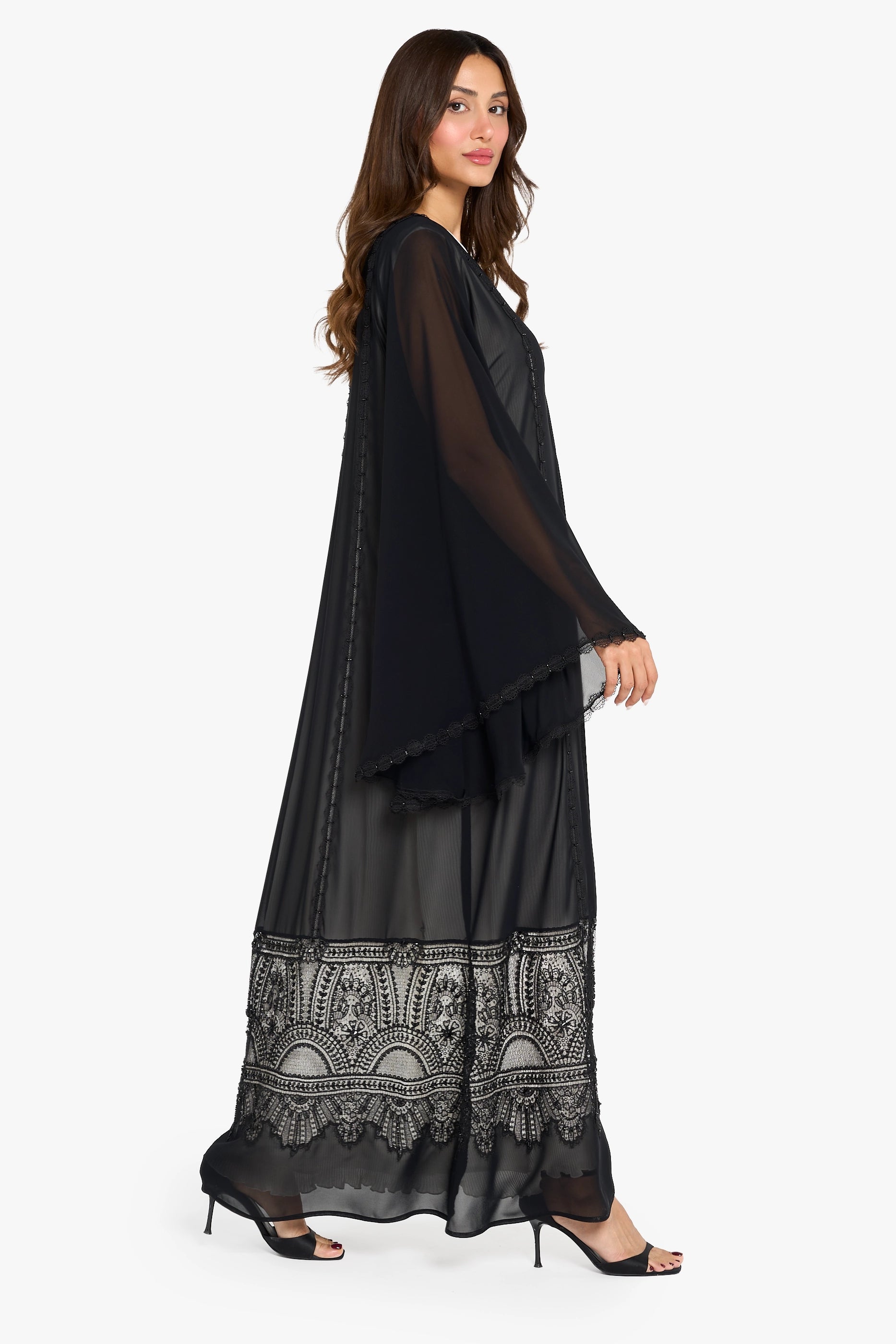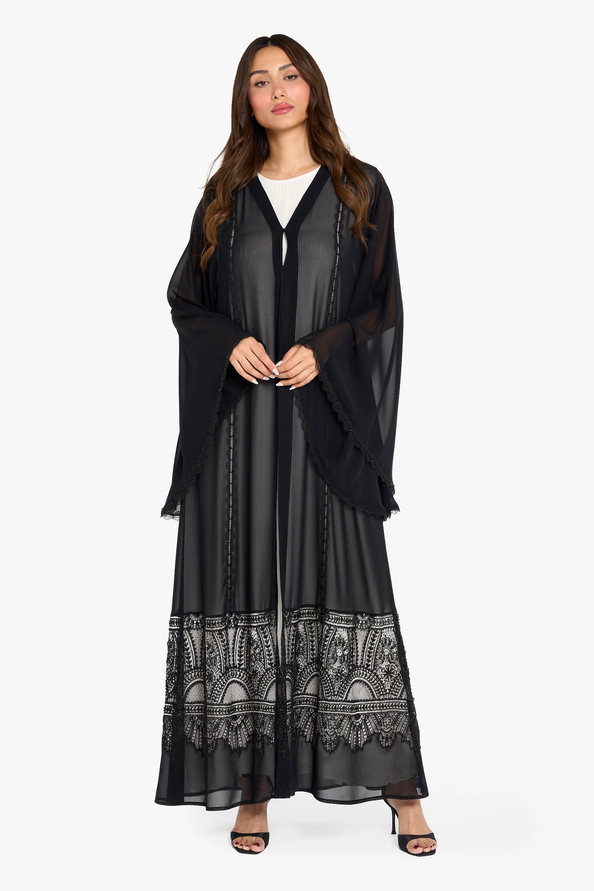 Louzan Wedding Abaya crafted from flowing chiffon, it is adorned with delicate dantel lace detailing, creating an elegant and ethereal silhouette. The combination of soft fabric and intricate lace exudes luxe sophistication while maintaining a chic, modern aesthetic.