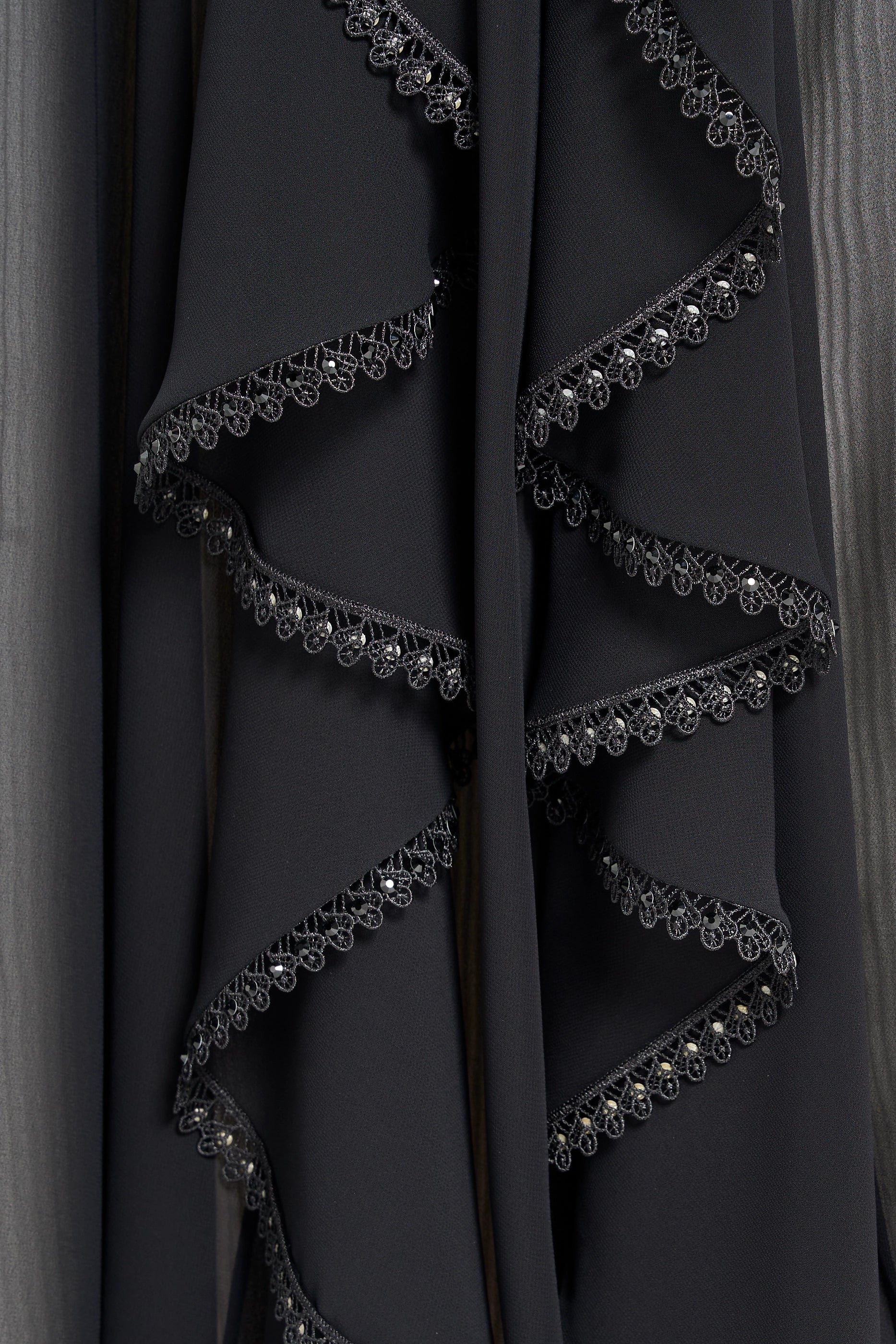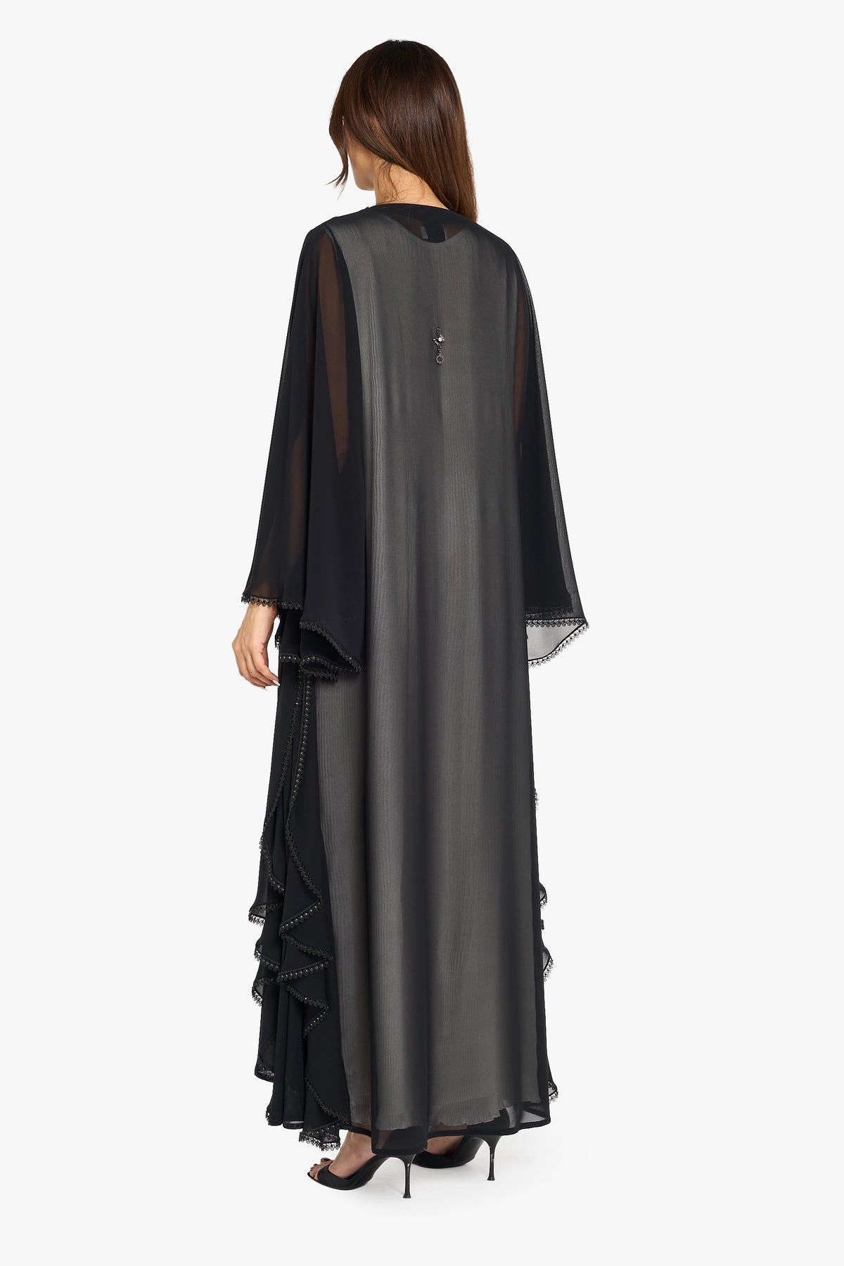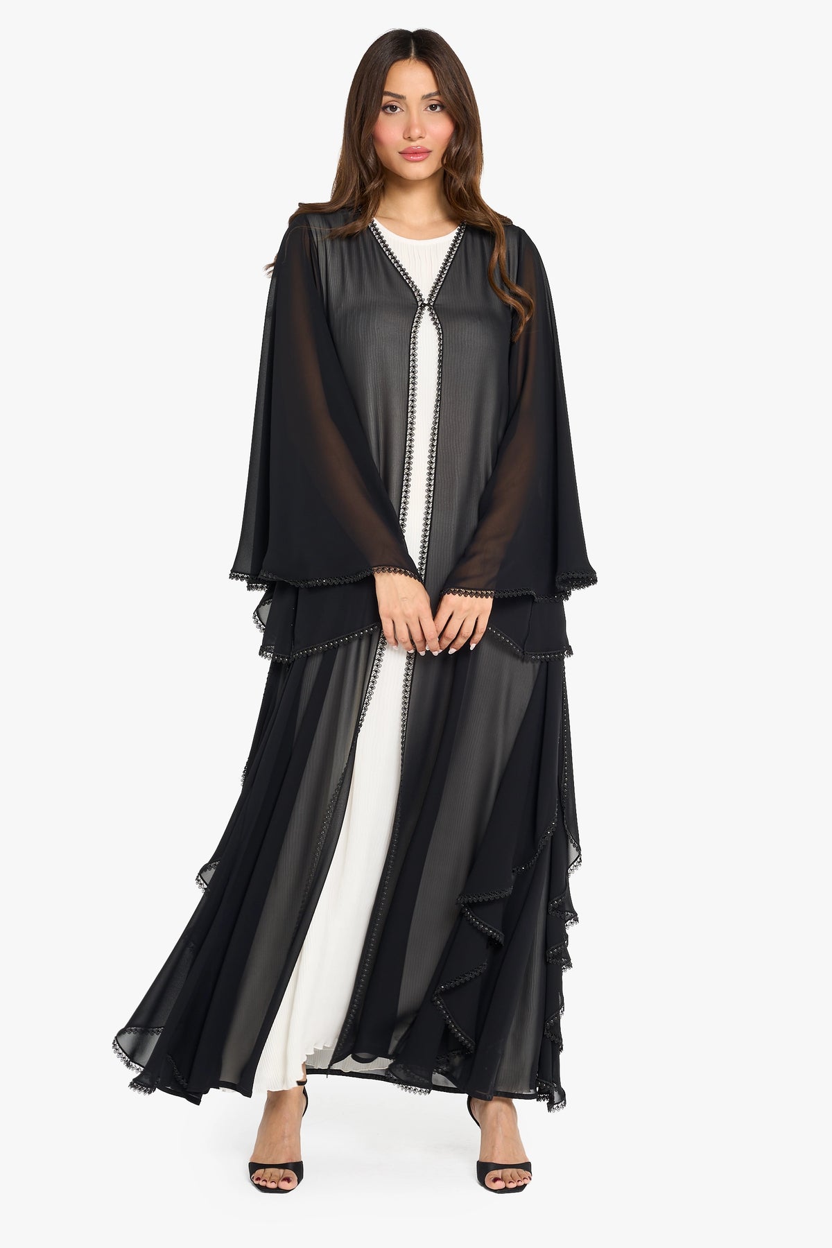 Louzan Wedding abaya crafted from elegant chiffon fabric,it is designed to make a refined bridal statement. Featuring layered sleeve detailing and a bias-cut design at the sides, it creates graceful movement and a flattering silhouette. The edges are delicately highlighted with lace and further embellished with shimmering crystals, adding a touch of refined sparkle. Chic and modern, this abaya is perfect for contemporary wedding celebrations.