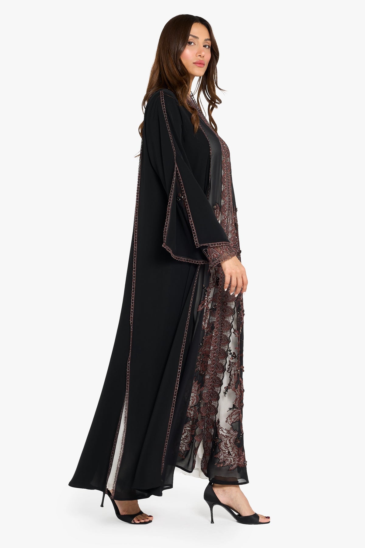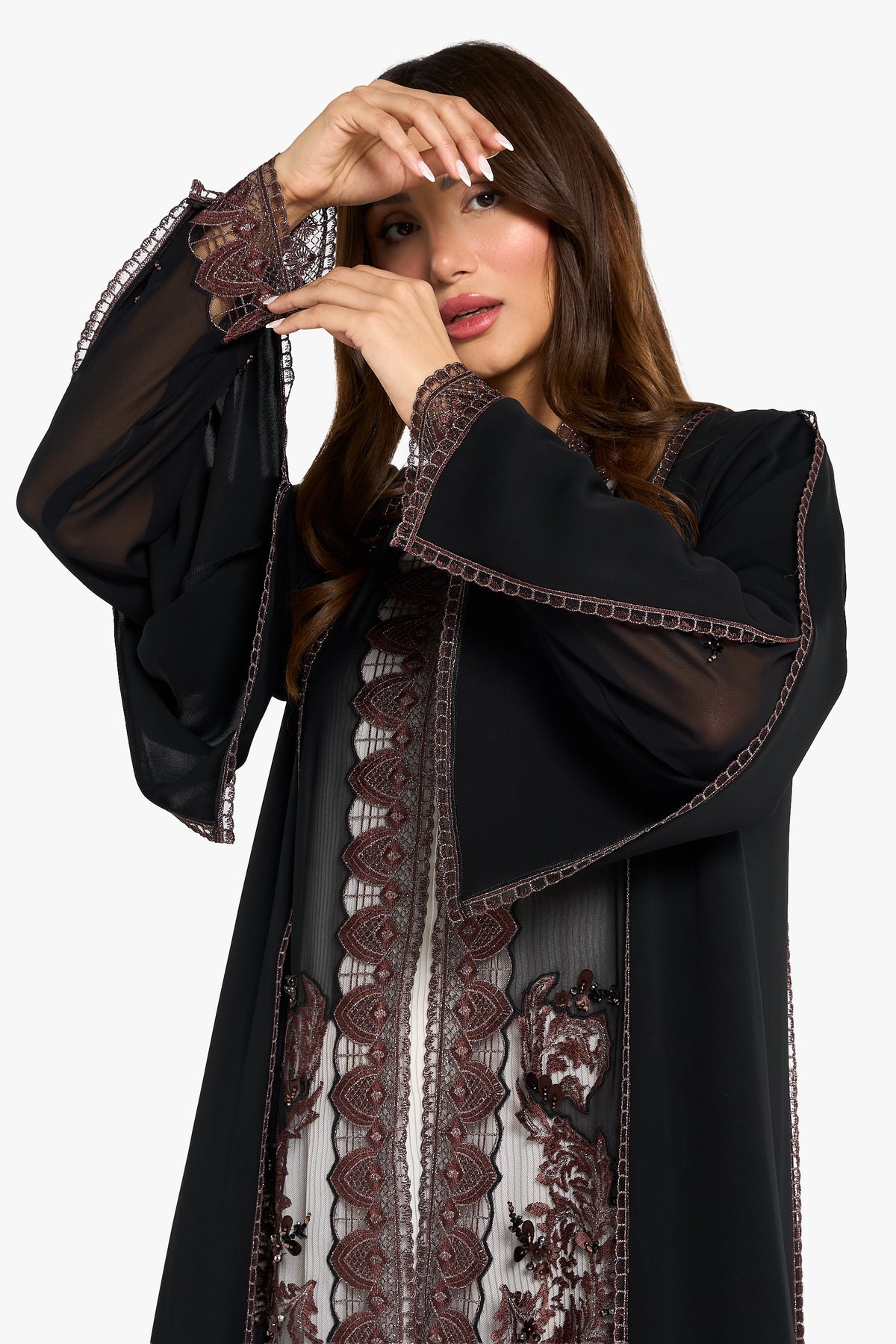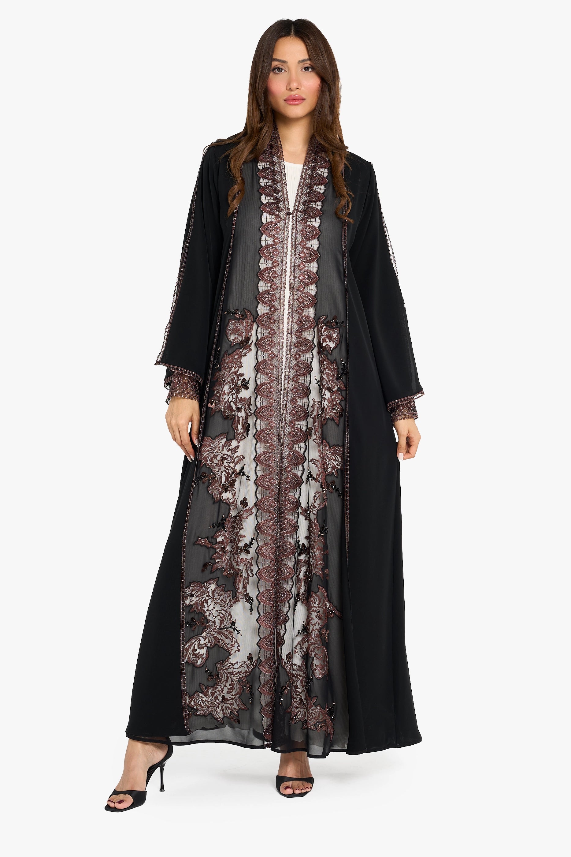 Louzan abaya crafted from a luxurious combination of nida and chiffon fabrics, it showcases layered elegance with meticulously embroidered geometric lace borders. The front features an abstract foliage design, beautifully embellished with 3D petals, crystals, and beads, adding depth and a touch of shimmer. A perfect blend of luxe sophistication, contemporary chic, and modern artistry, this abaya makes a striking statement for any special occasion.