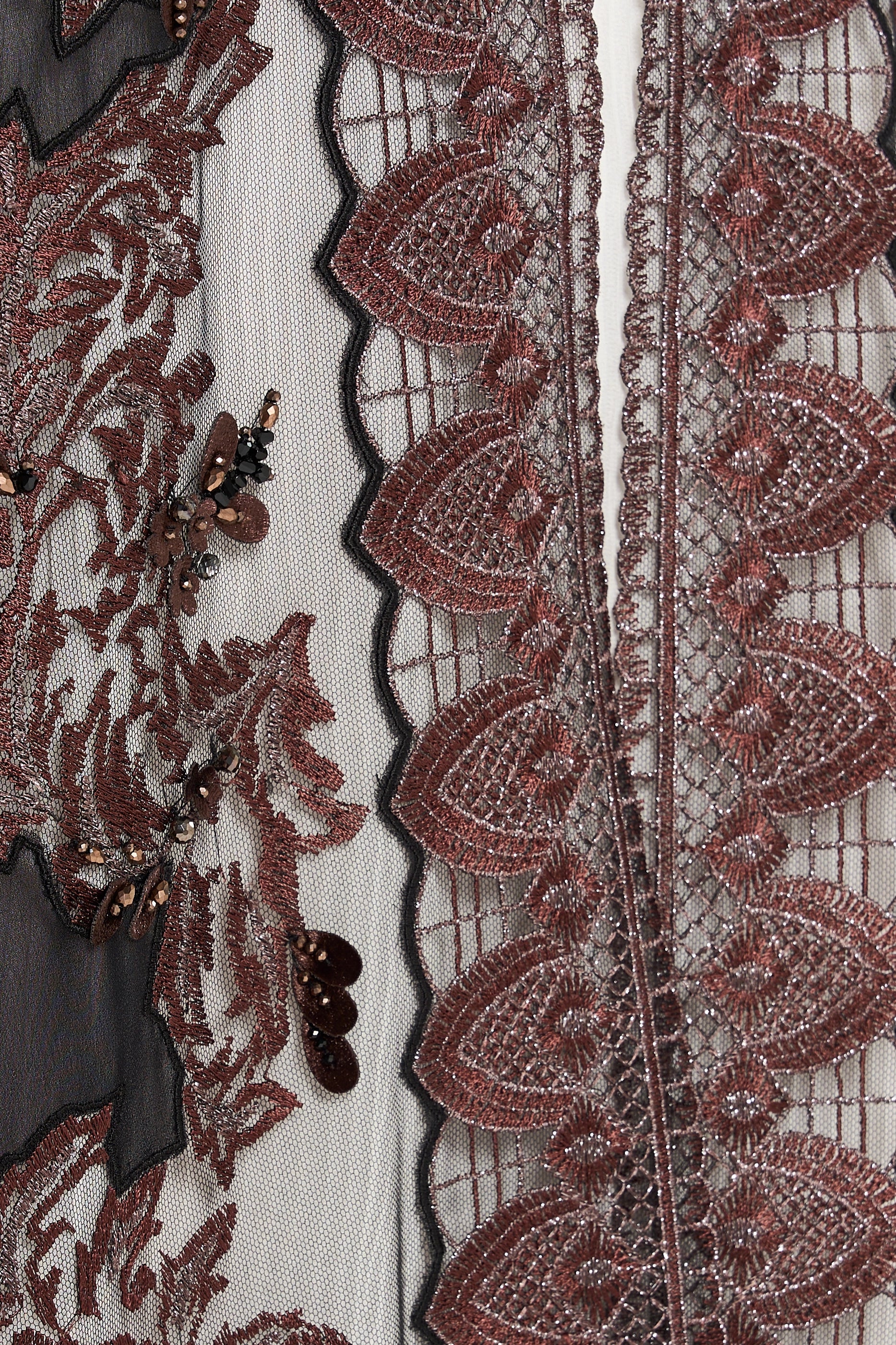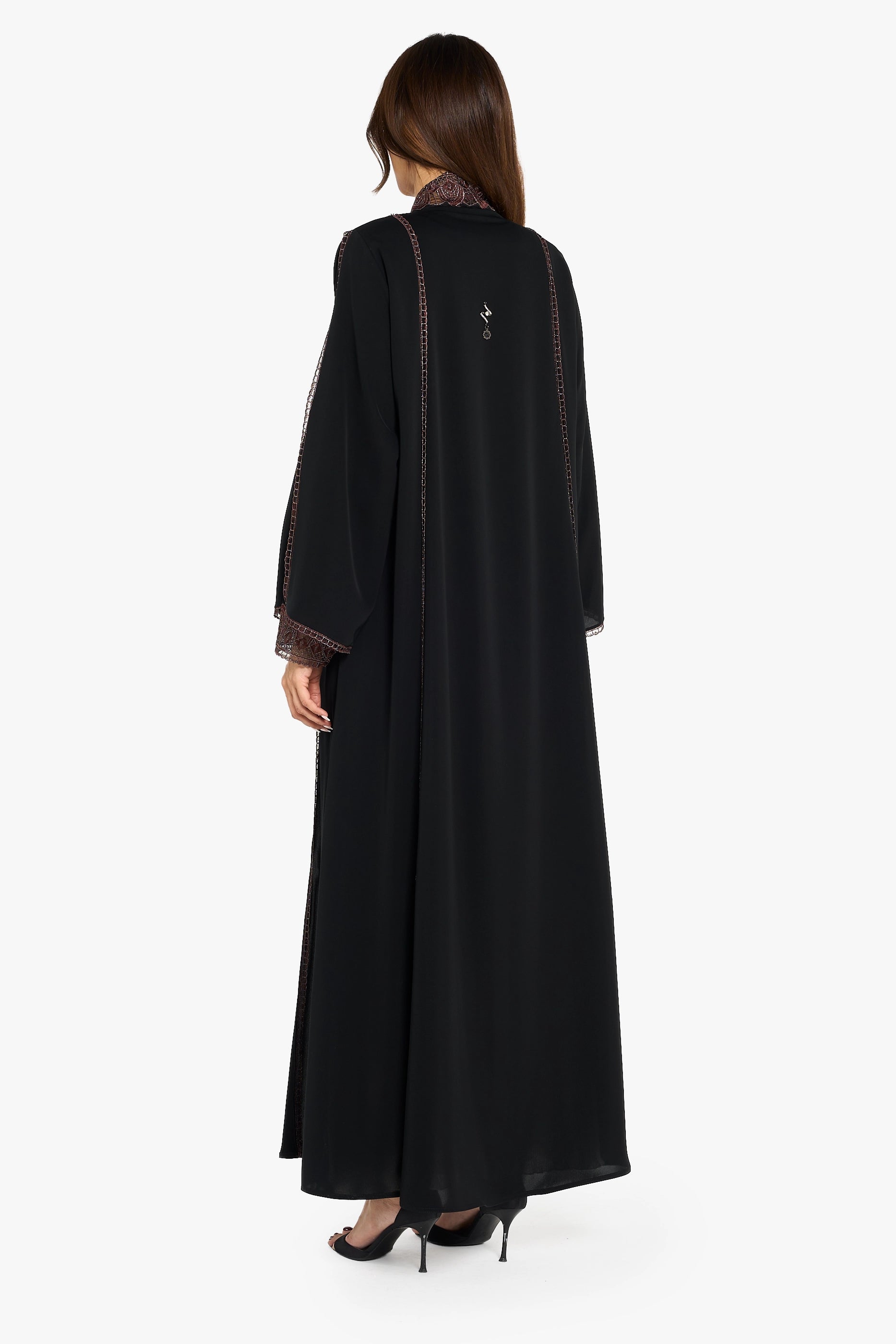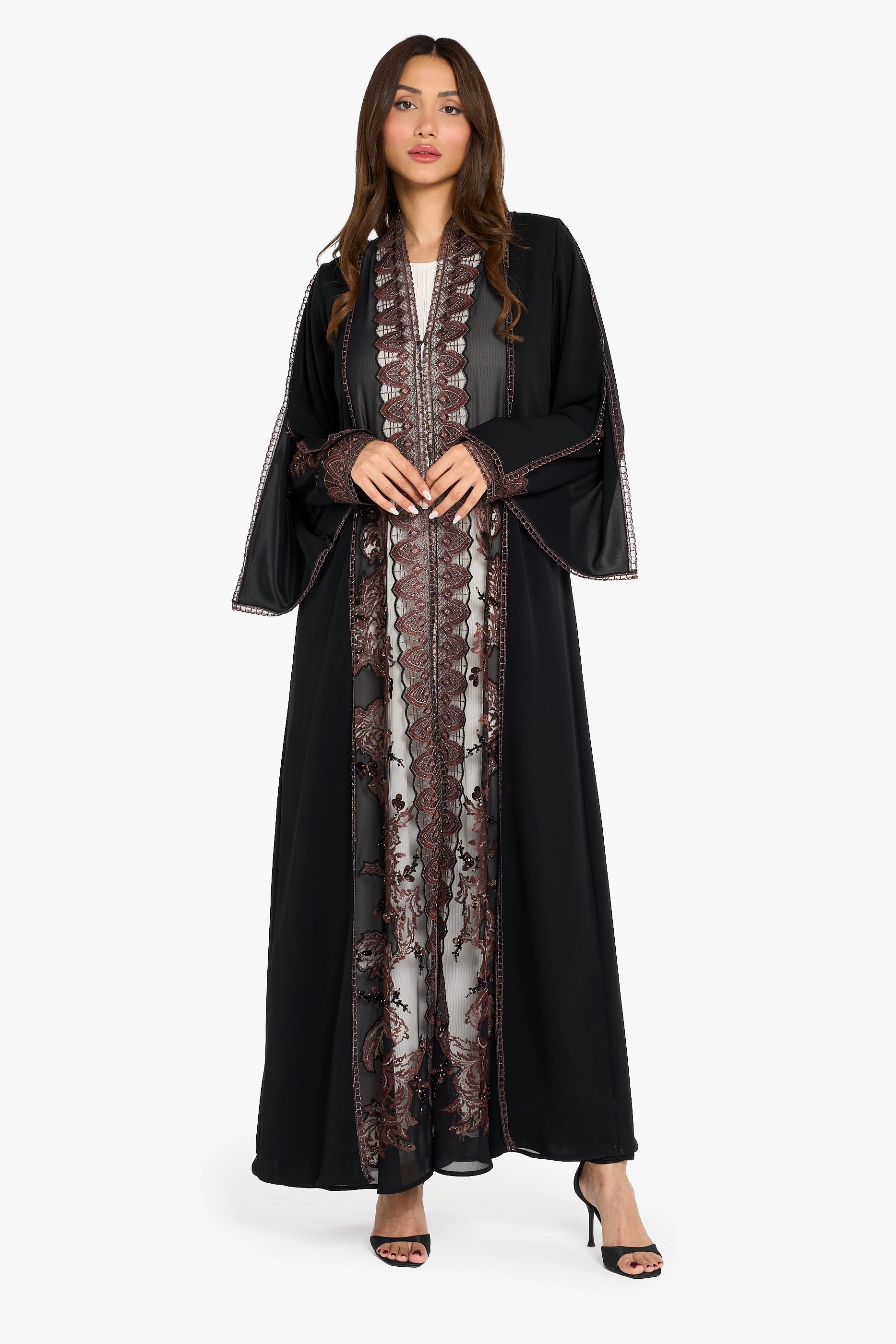 Louzan abaya crafted from a luxurious combination of nida and chiffon fabrics, it showcases layered elegance with meticulously embroidered geometric lace borders. The front features an abstract foliage design, beautifully embellished with 3D petals, crystals, and beads, adding depth and a touch of shimmer. A perfect blend of luxe sophistication, contemporary chic, and modern artistry, this abaya makes a striking statement for any special occasion.