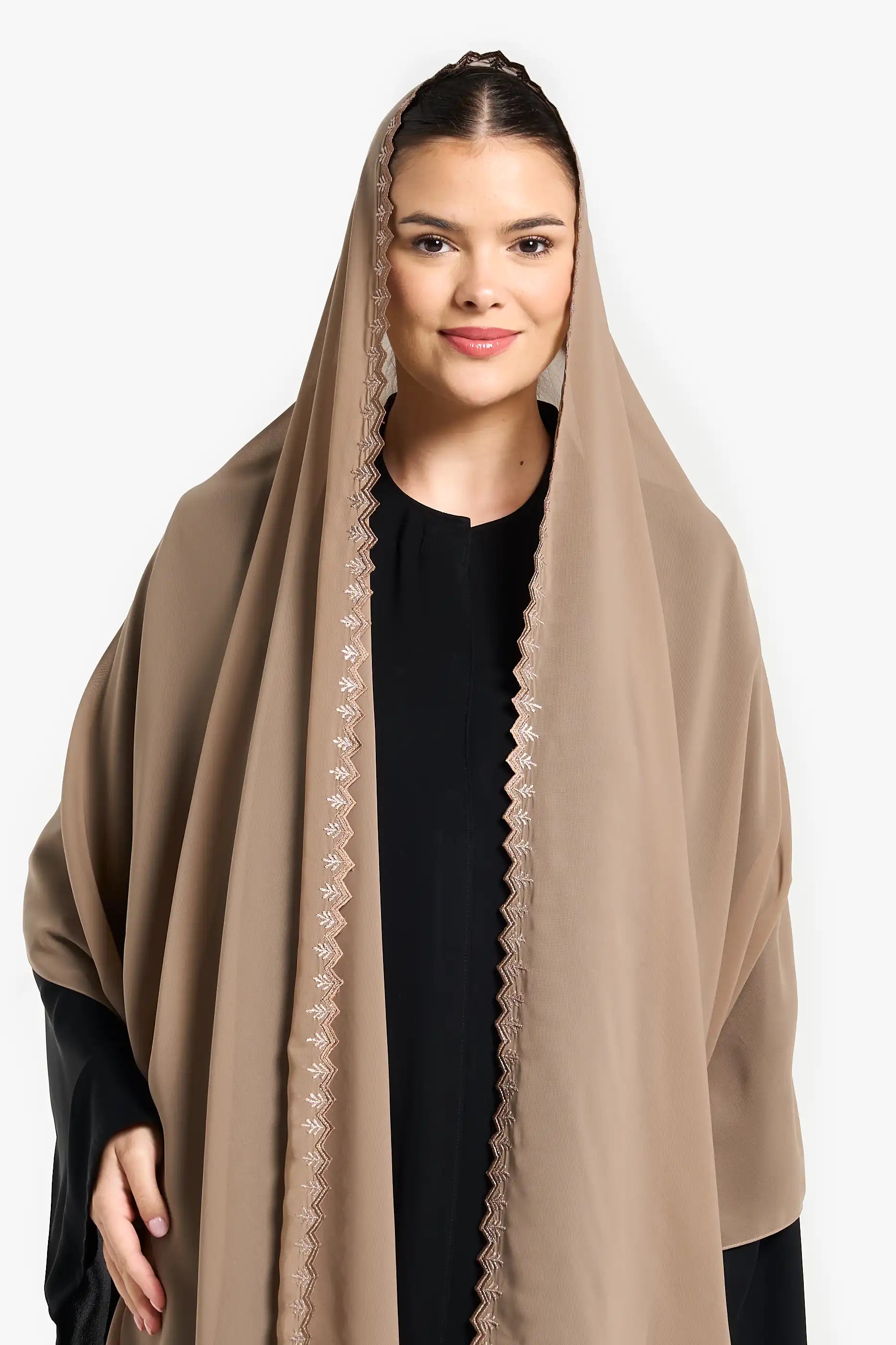 Elevate your look with the LOUZAN ABAYA. Featuring a unique DUJA LAIL hand-made design and a colorful SHEILA, this stunning abaya adds a personal touch to your outfit and creates a bold and elegant look. Hand-crafted for you, make a statement with this exclusive piece.