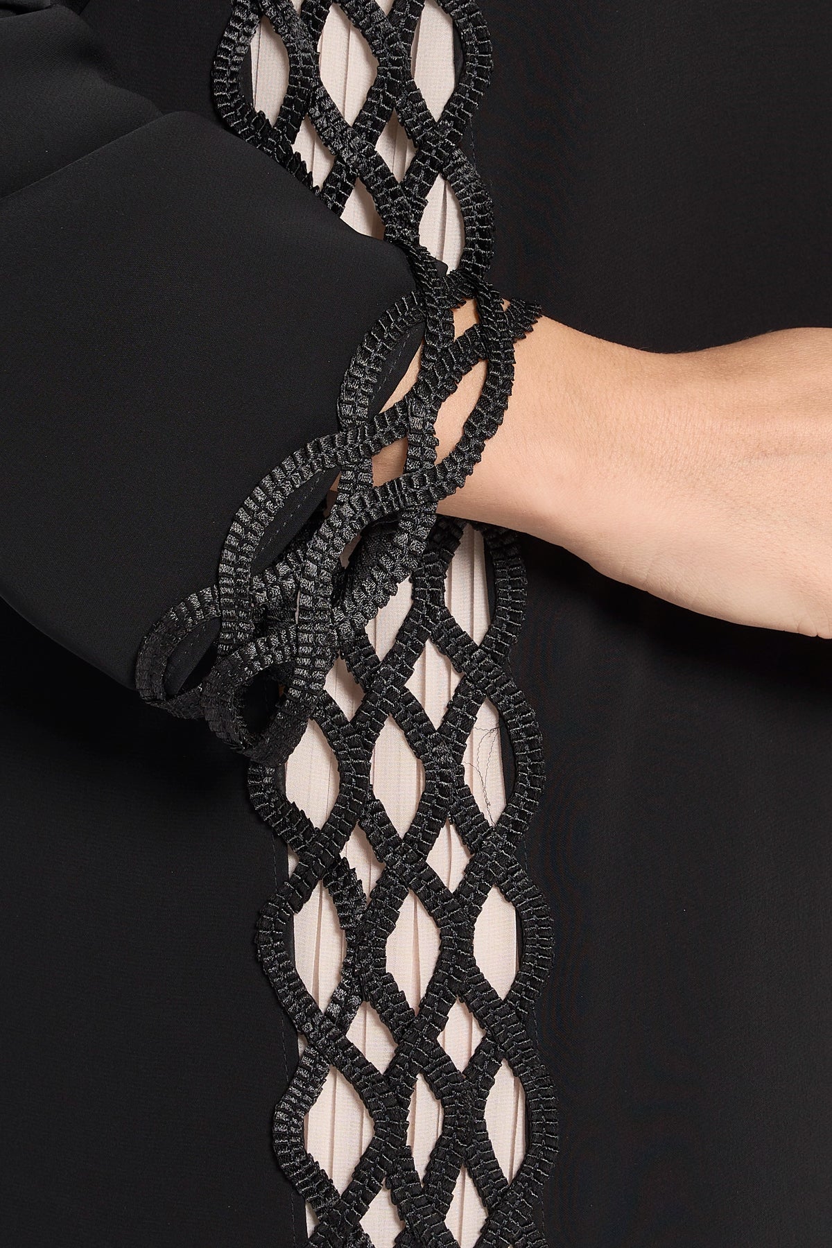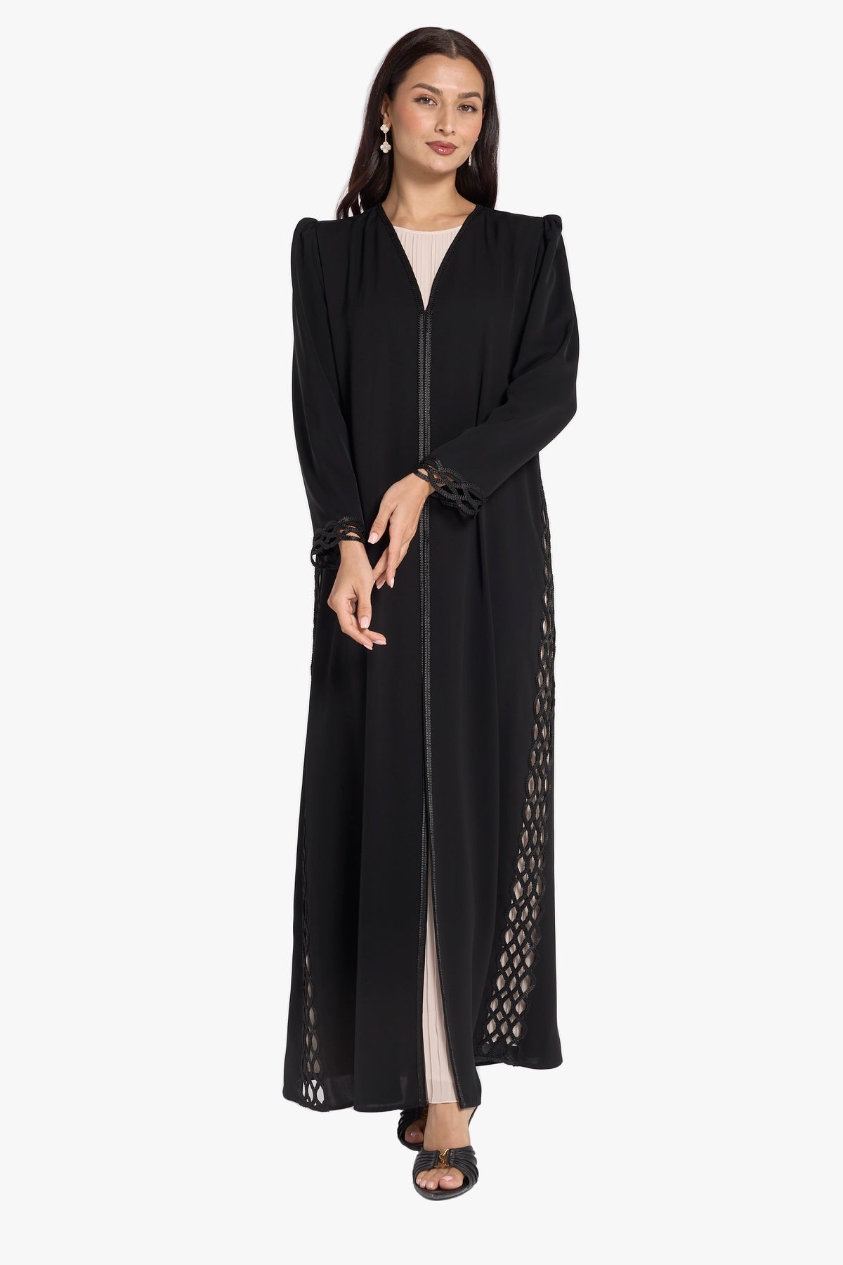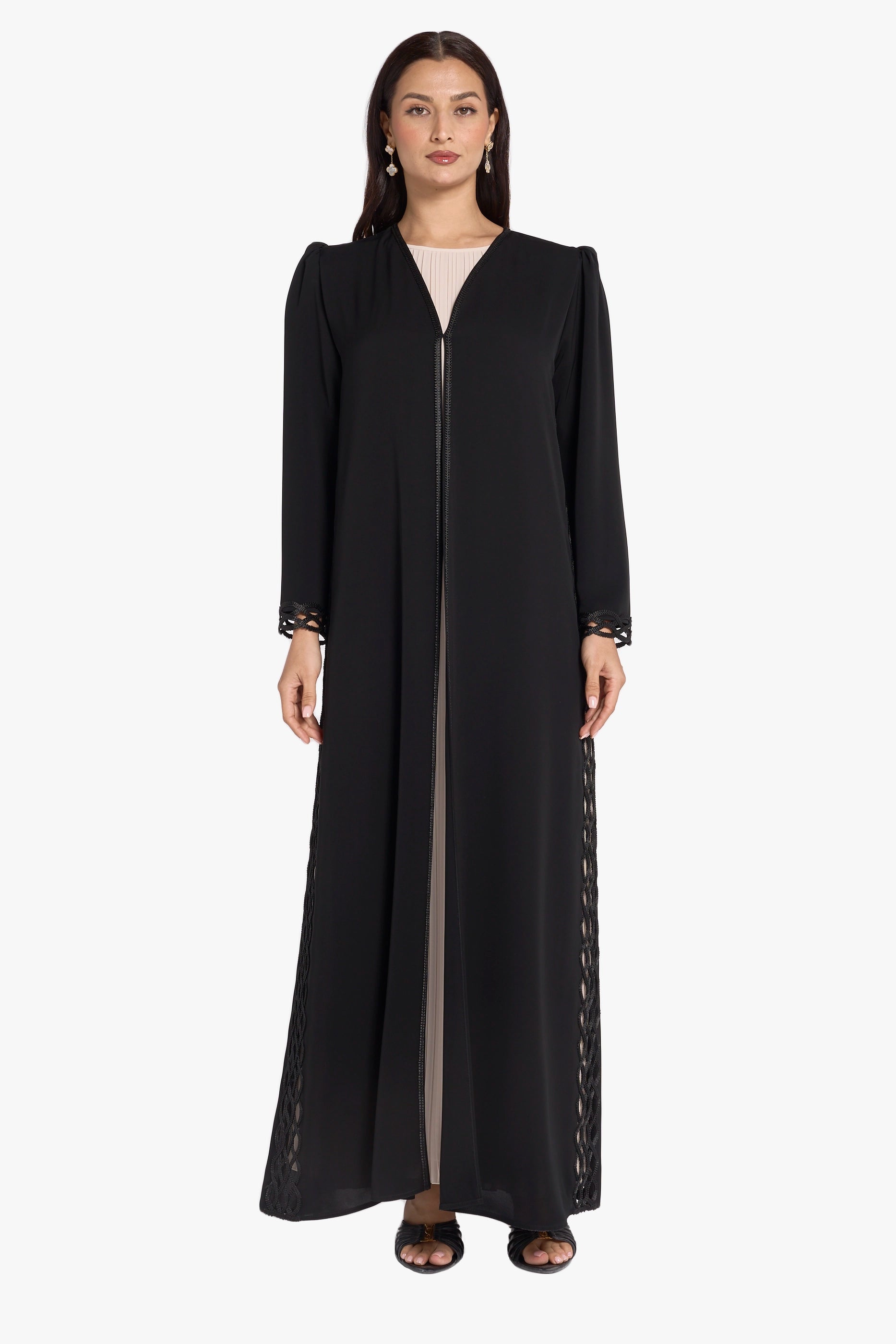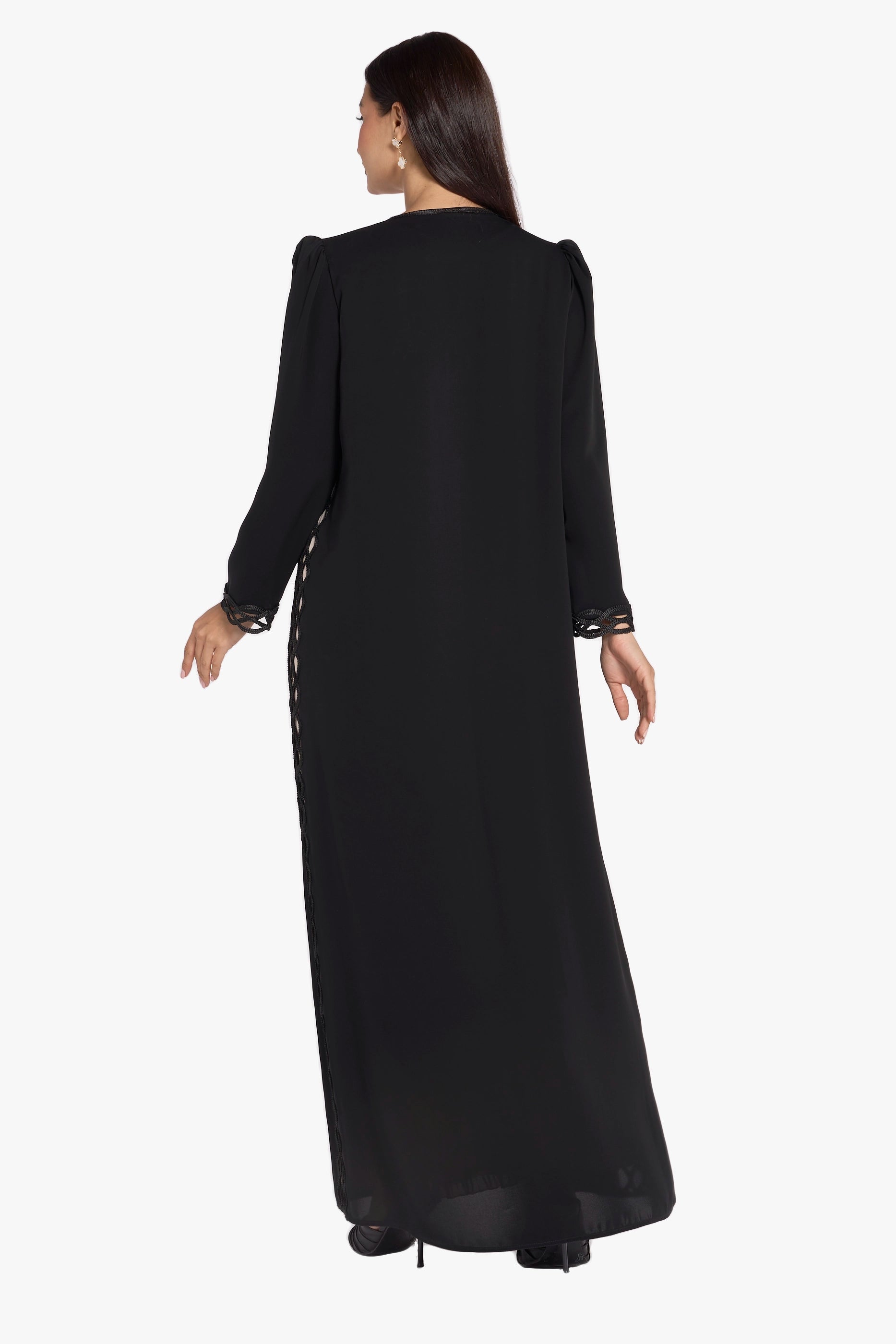 The abaya features elegant dentelle detailing along the sides, adding a graceful and refined accent to its design. Crafted with attention to detail, this abaya combines sophistication and modesty, making it an ideal choice for those seeking timeless elegance in their everyday wear.