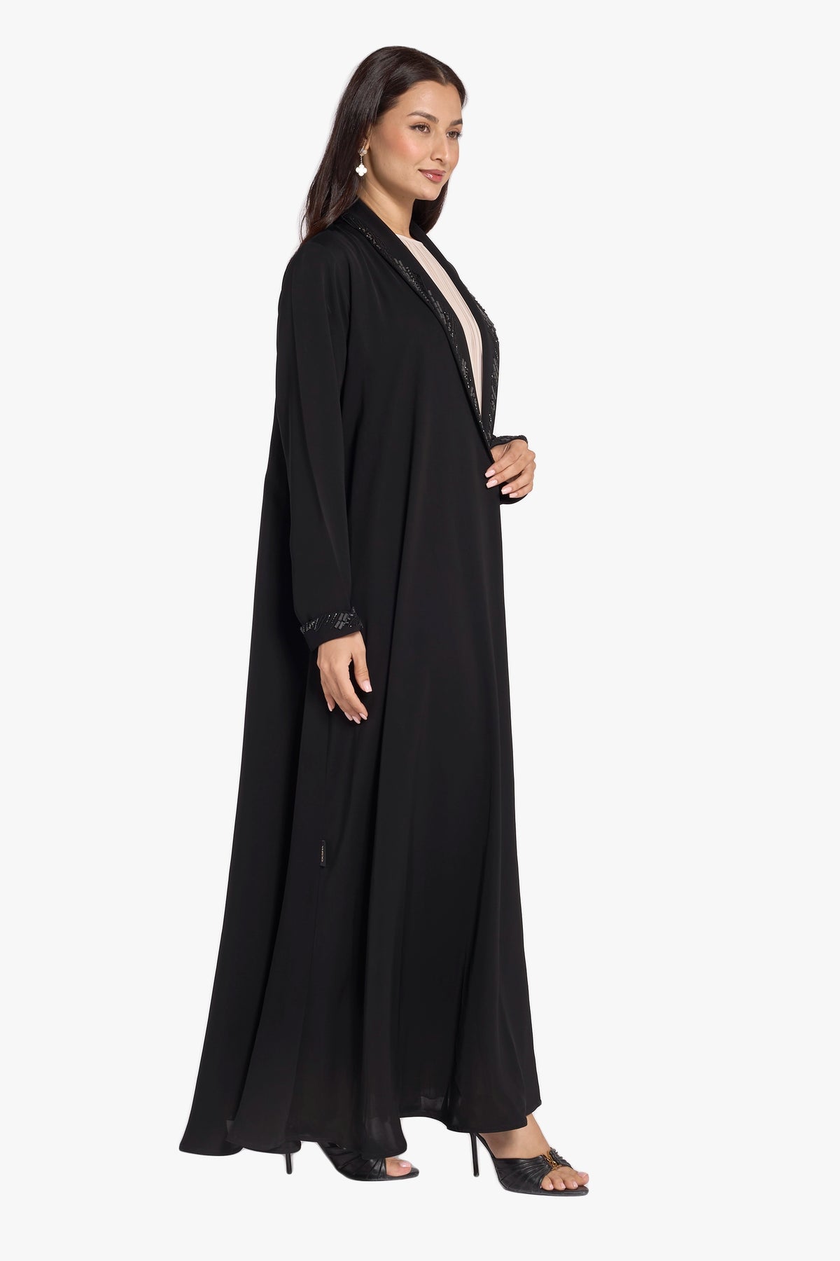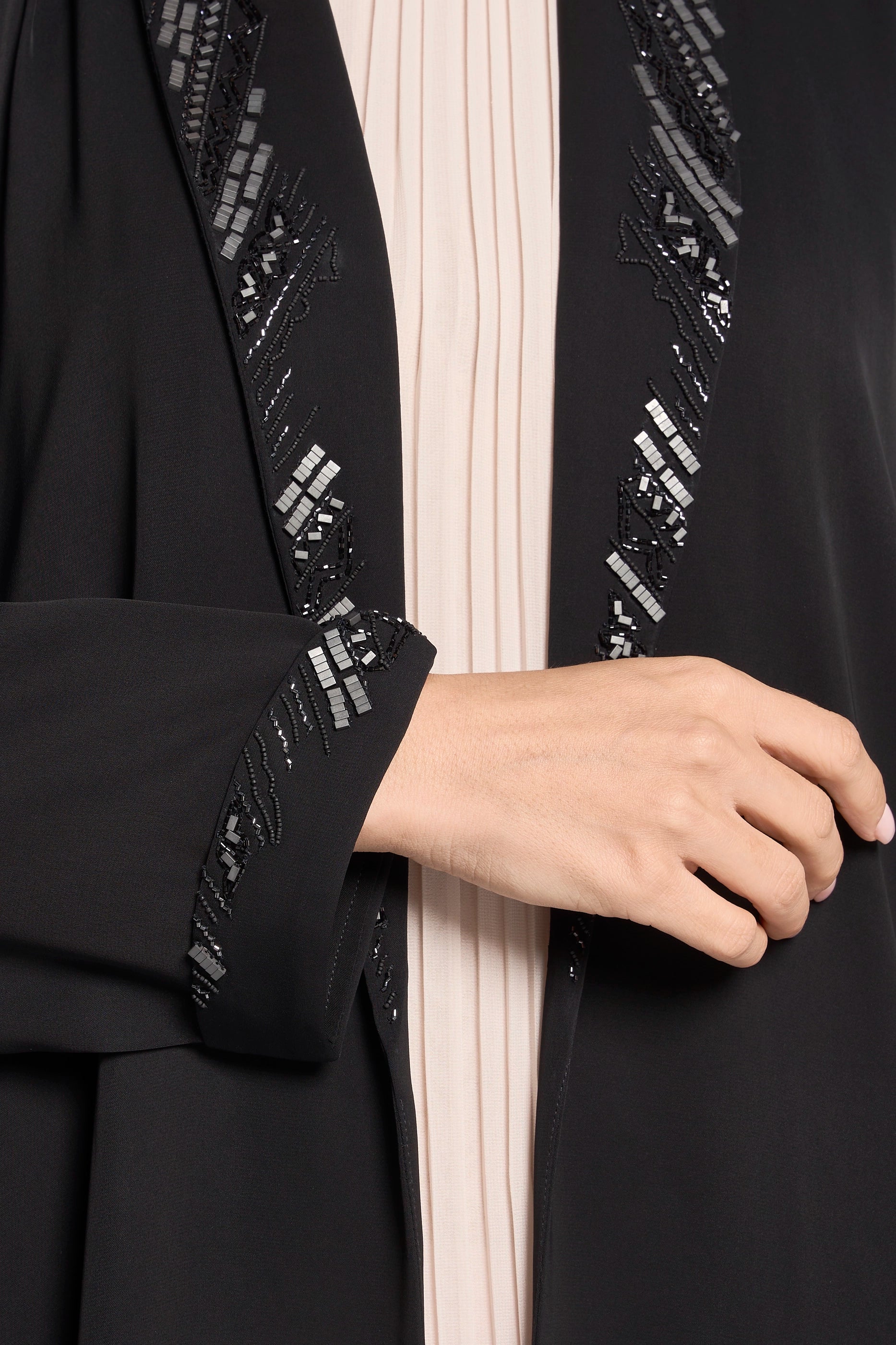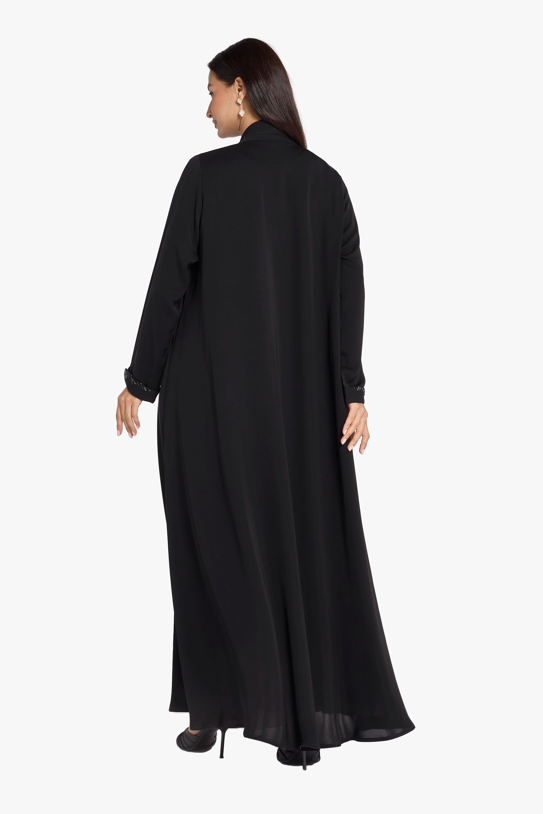 The Ousha abaya showcases elegant handwork detailing, highlighted beautifully around the front collar. This refined craftsmanship, combined with its high-quality printed fabric, adds a sophisticated and unique touch to the abaya, making it perfect for those who appreciate subtle artistry in their modest wardrobe.