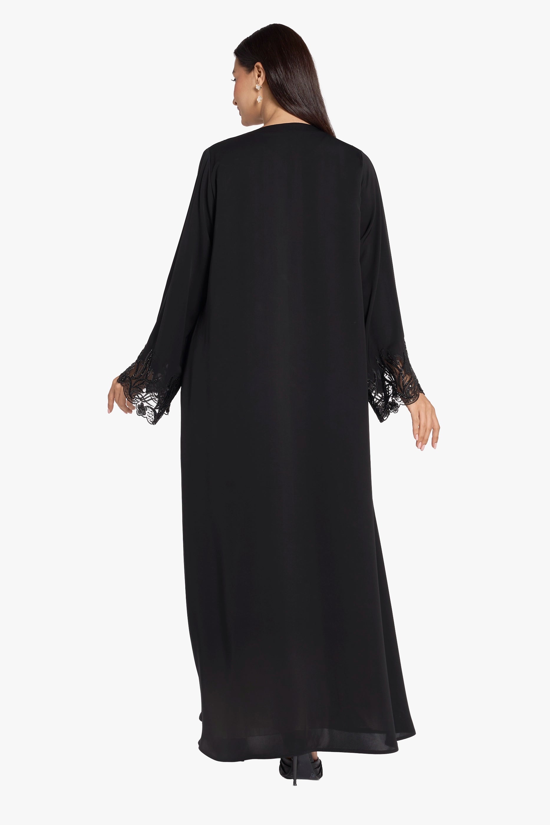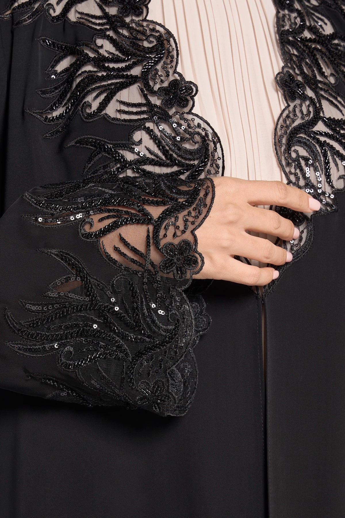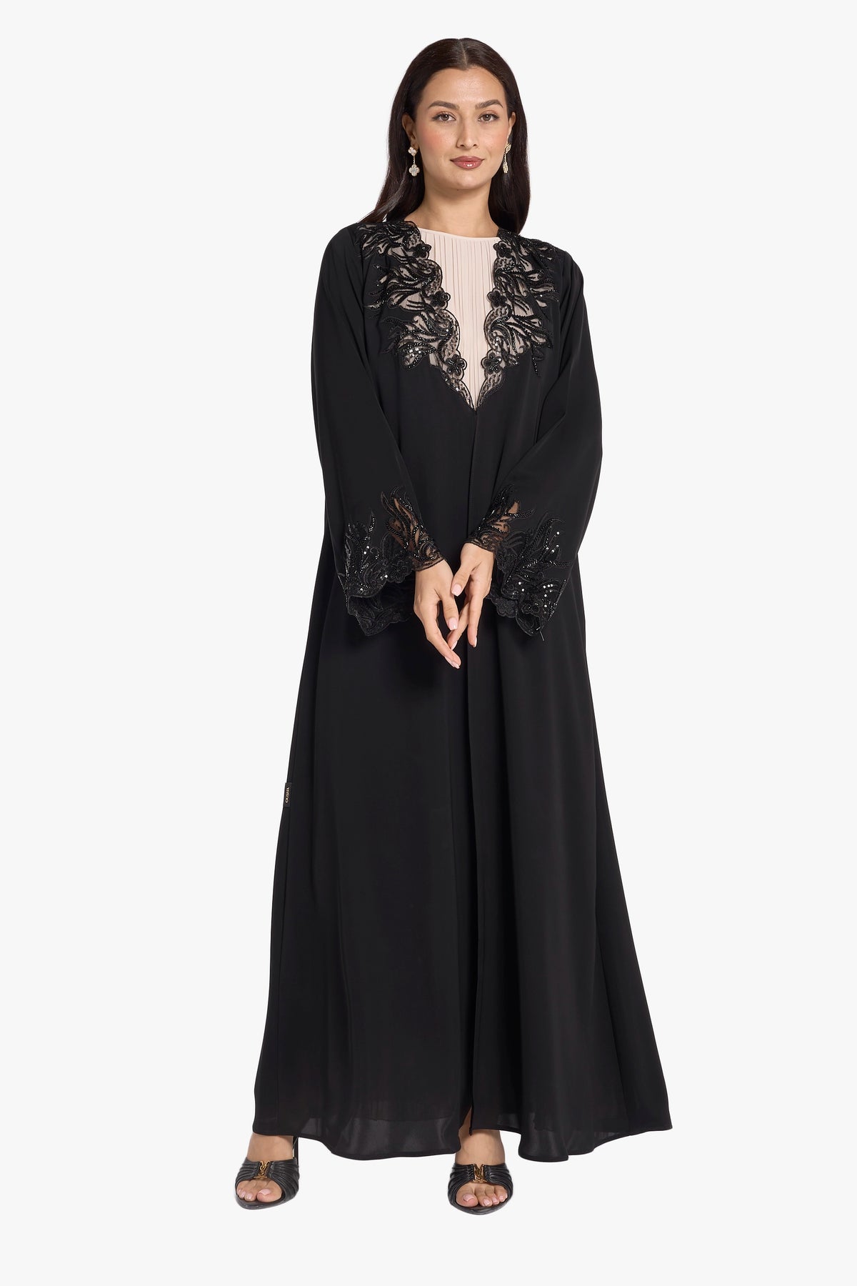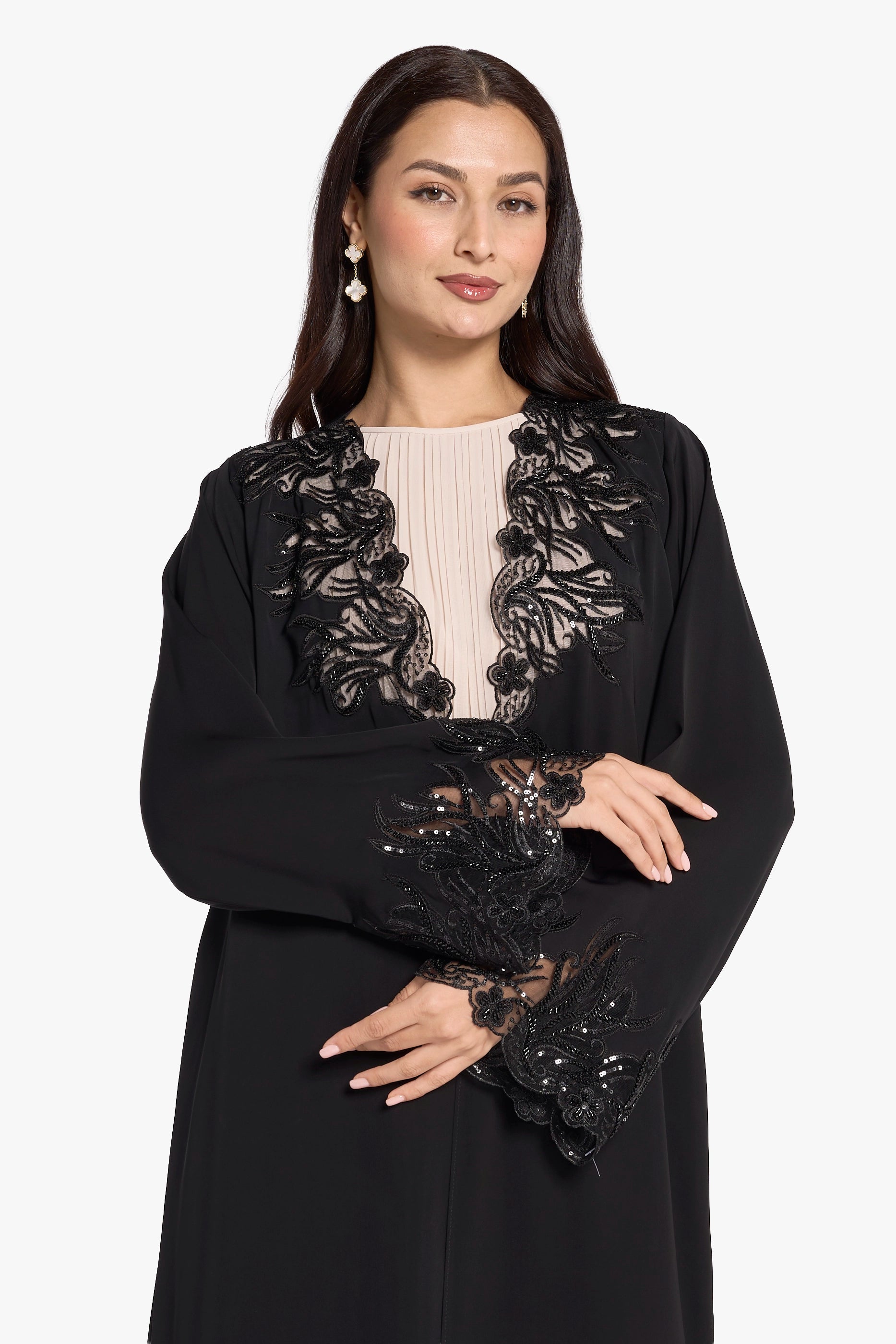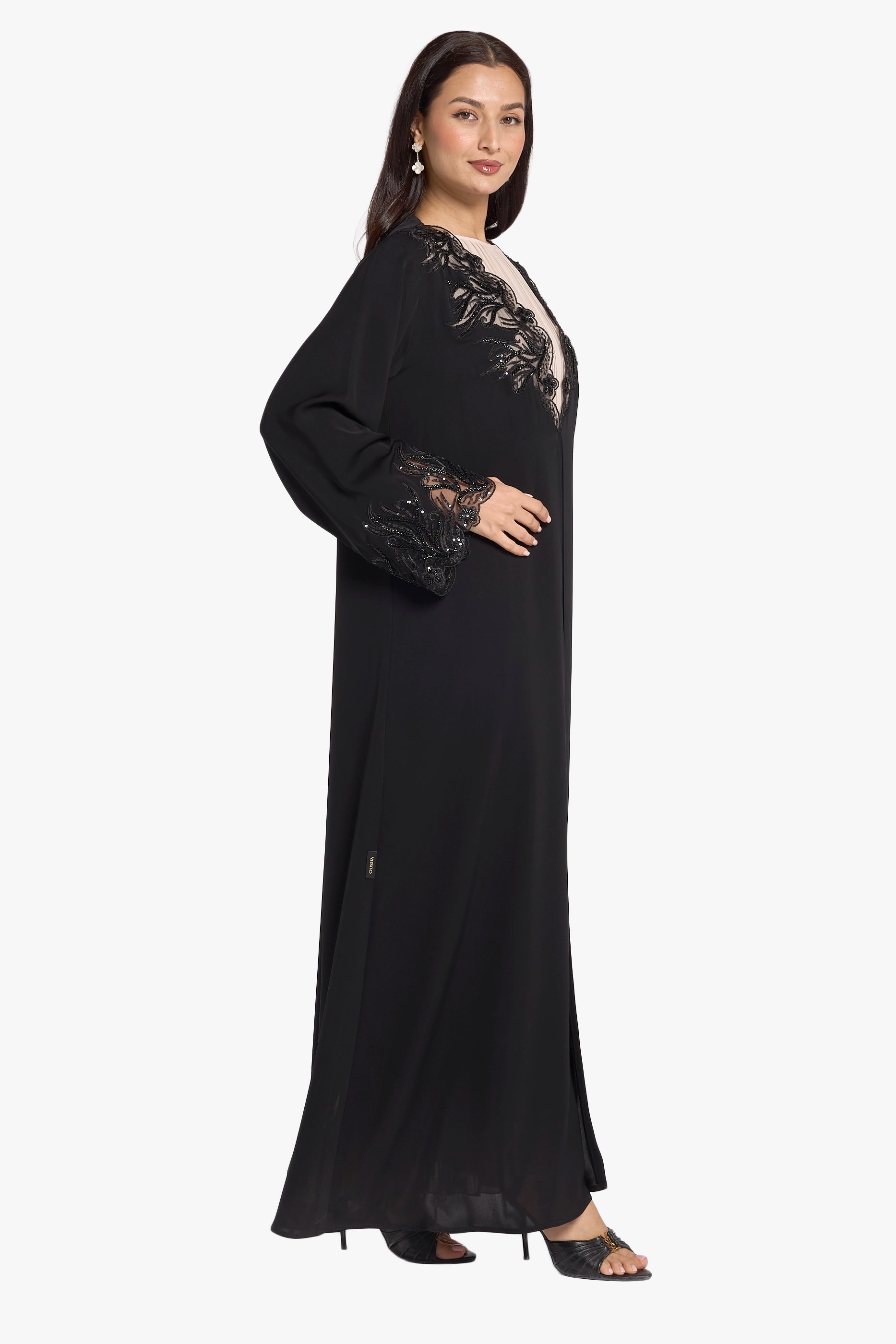 The Ousha Abaya  showcases elegant embroidery and exquisite handwork at the neckline, highlighting detailed craftsmanship. This sophisticated design element adds a refined and graceful touch, perfect for those seeking a timeless and modest style with subtle artistry.