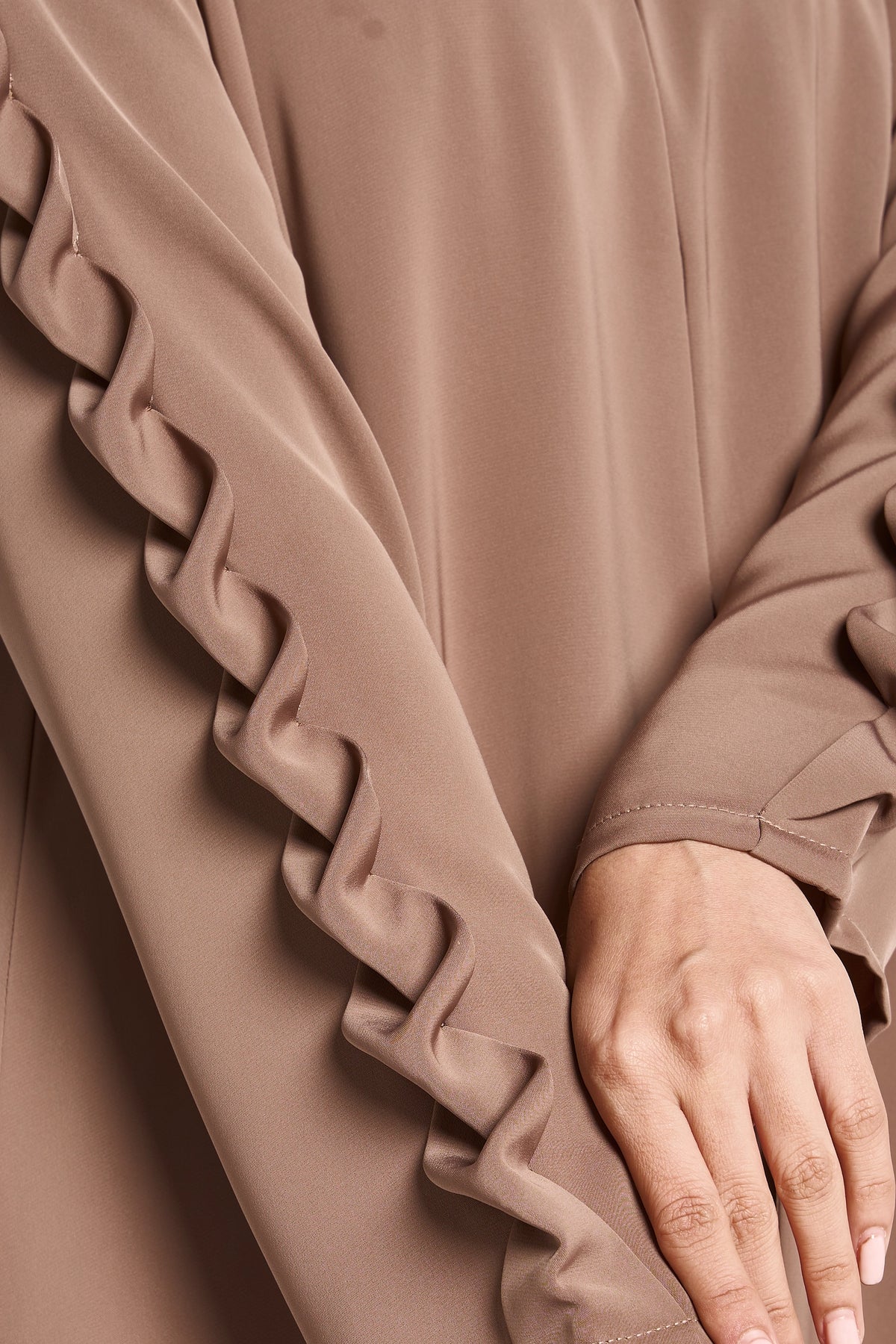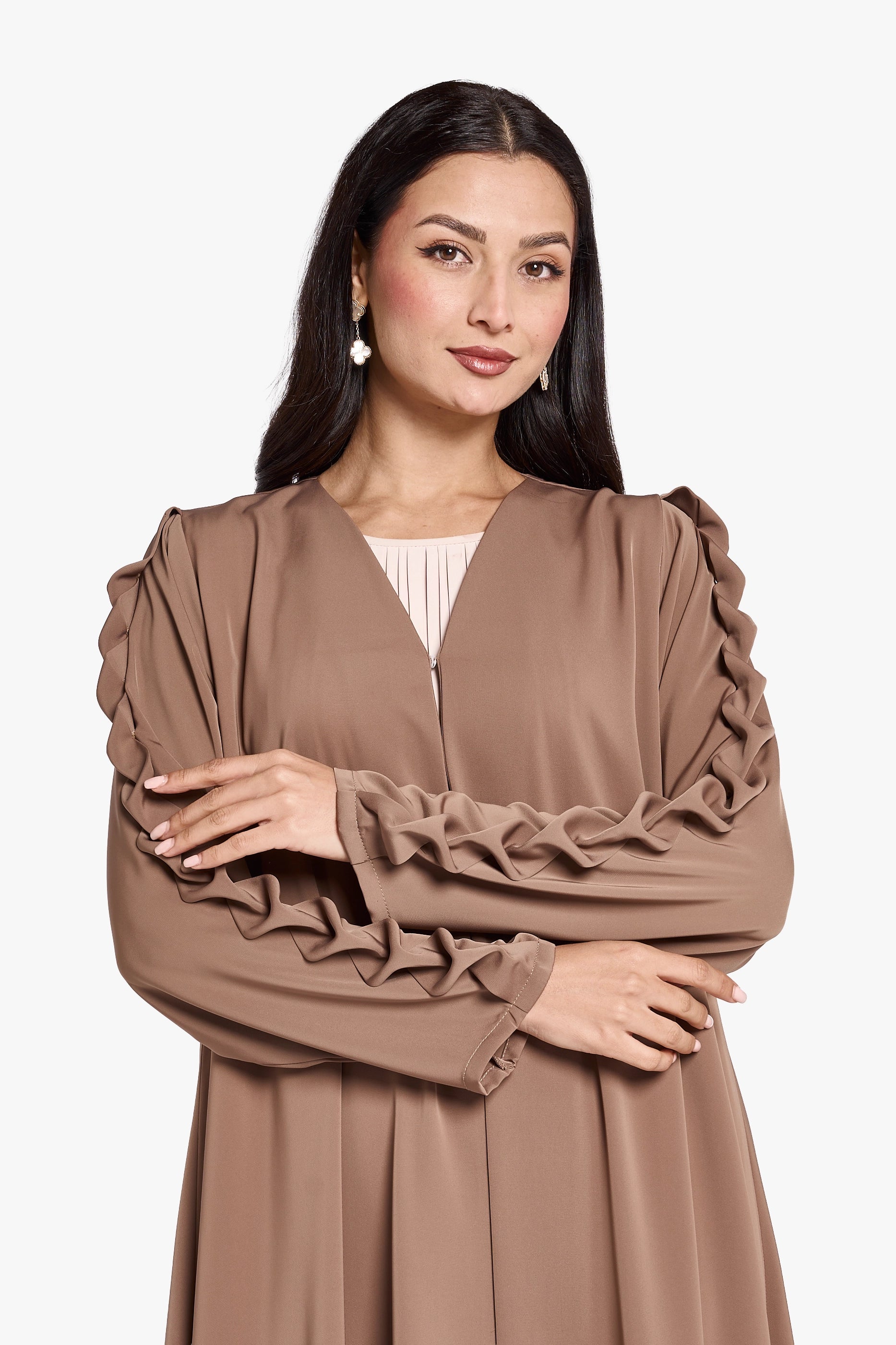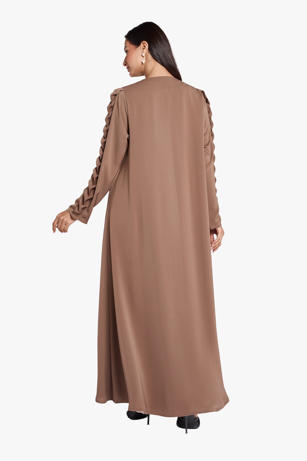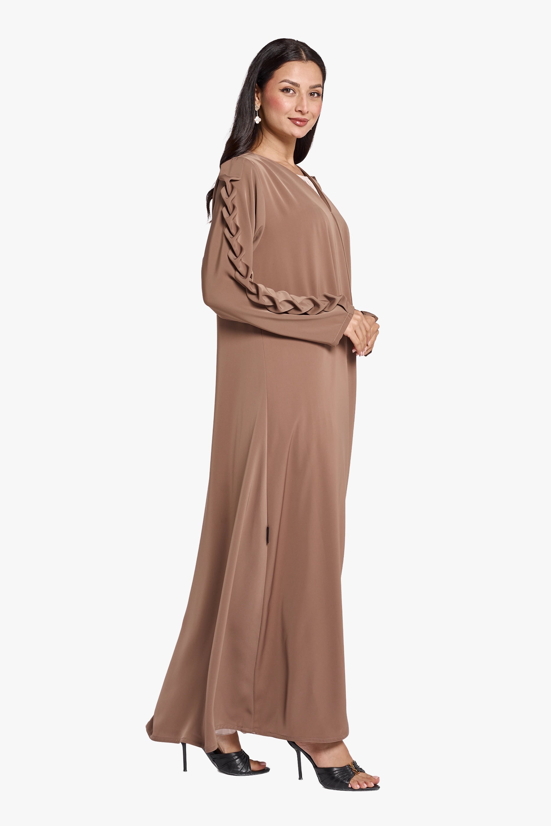 The OUSHA ABAYA features a refined design with a symmetrical cut that enhances its graceful silhouette. Crafted with attention to detail, this elegant abaya provides a balanced and harmonious look, making it perfect for those seeking both comfort and sophistication in their traditional wear. Its clean lines and structured shape emphasize poise and style.