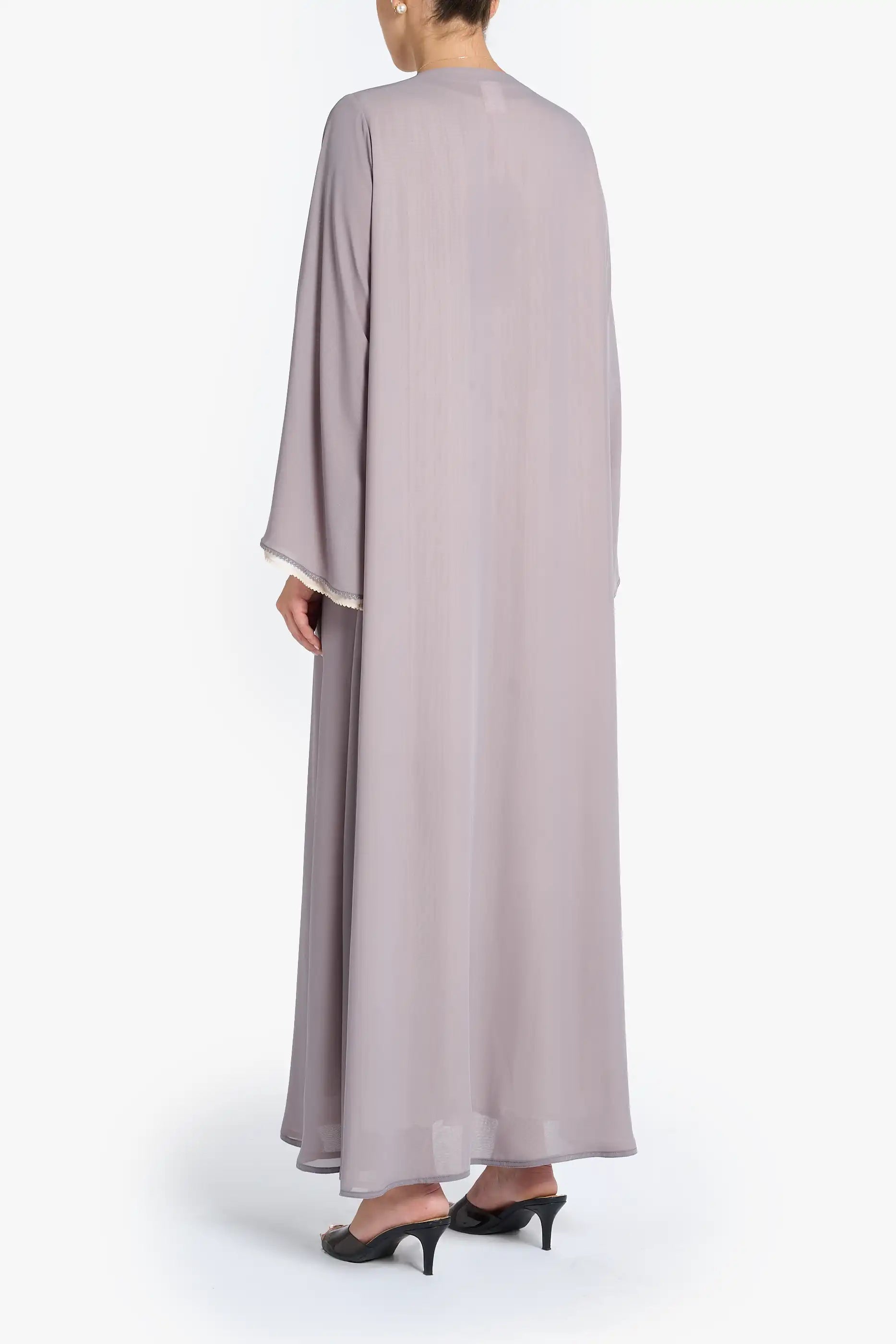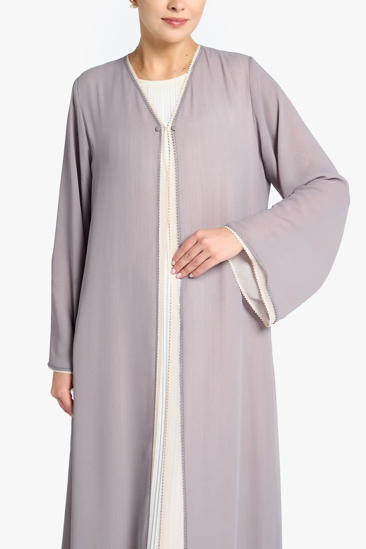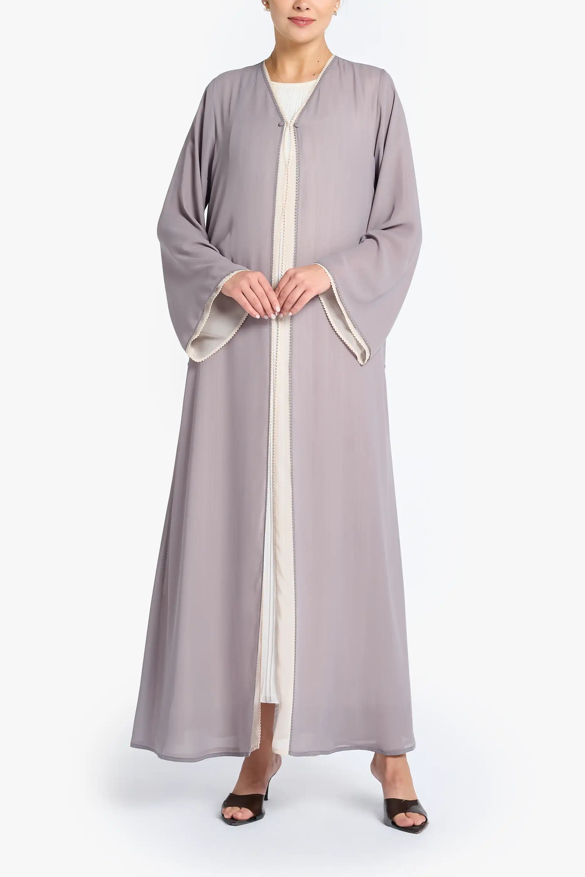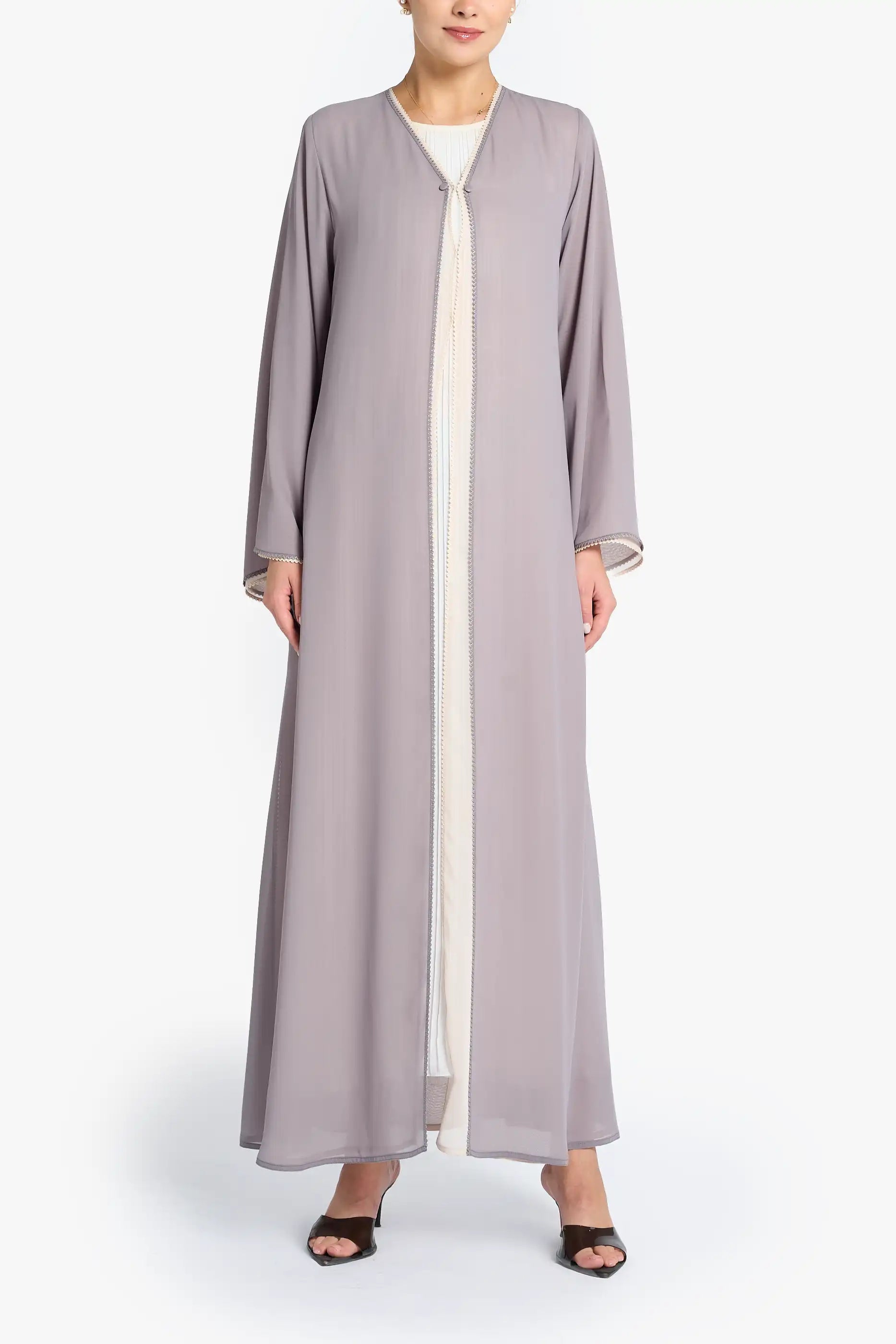 Summer louzan abaya crafted in chiffon with contrast color layering, thread embroidered edging, highlithed with button detailing.