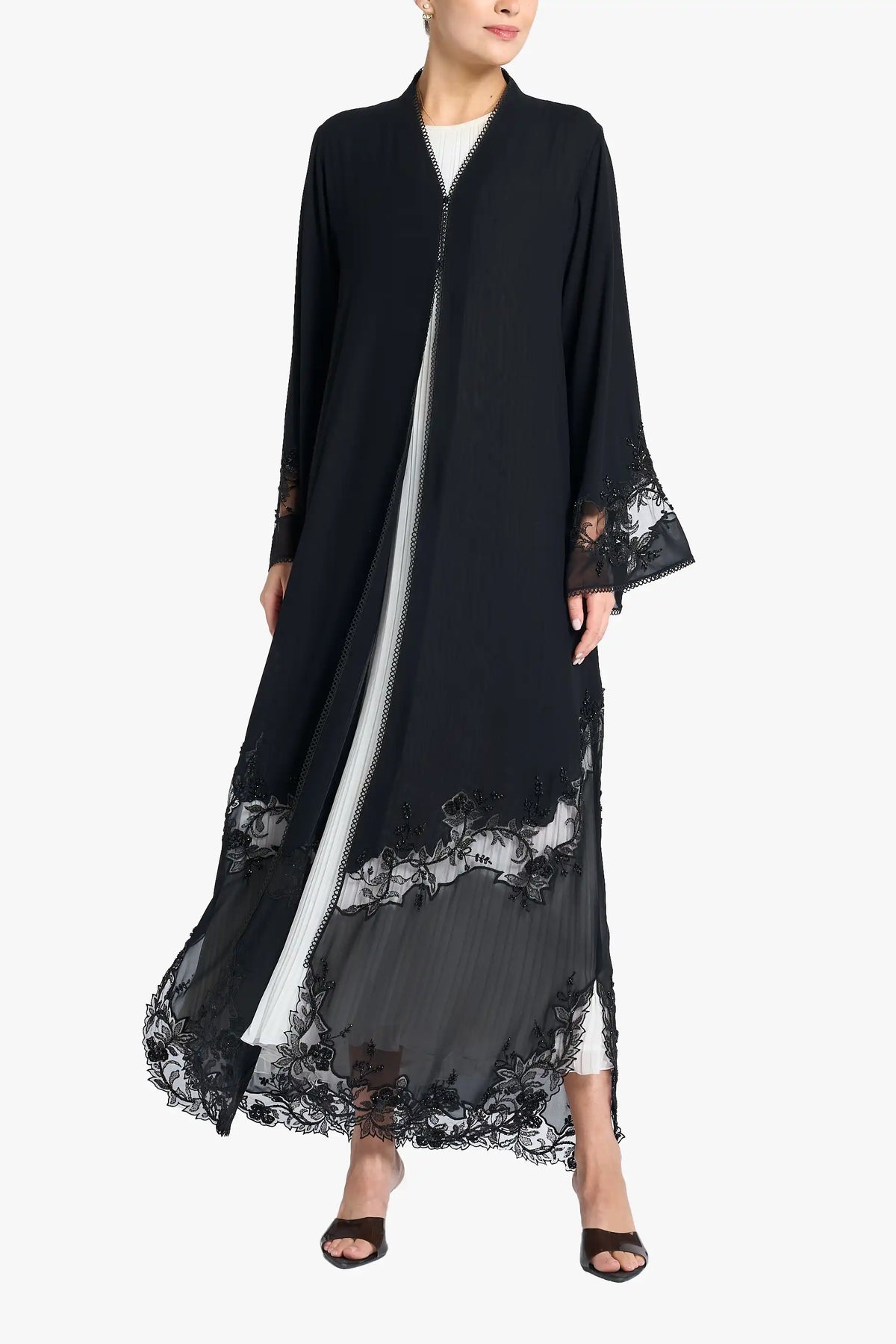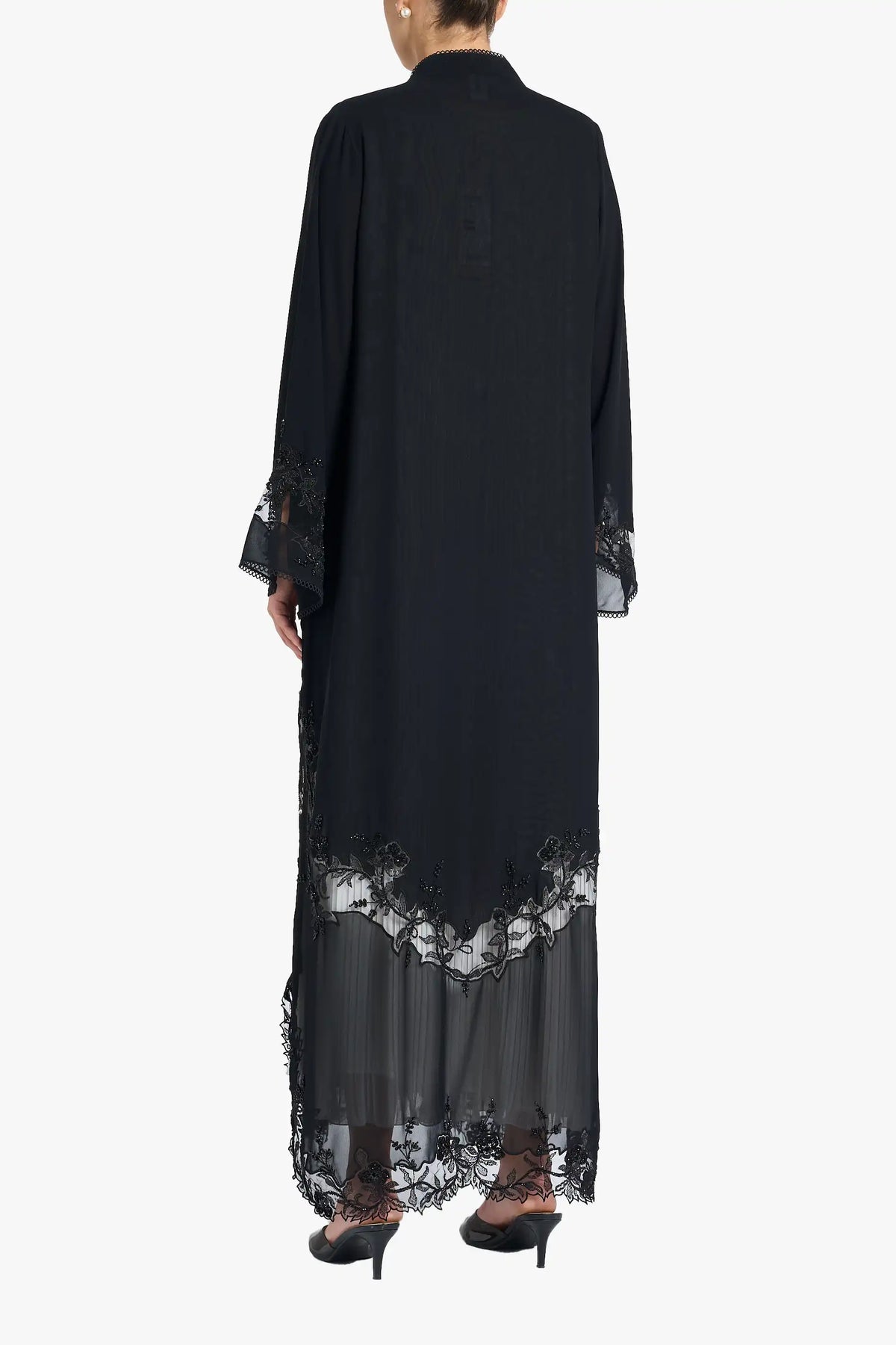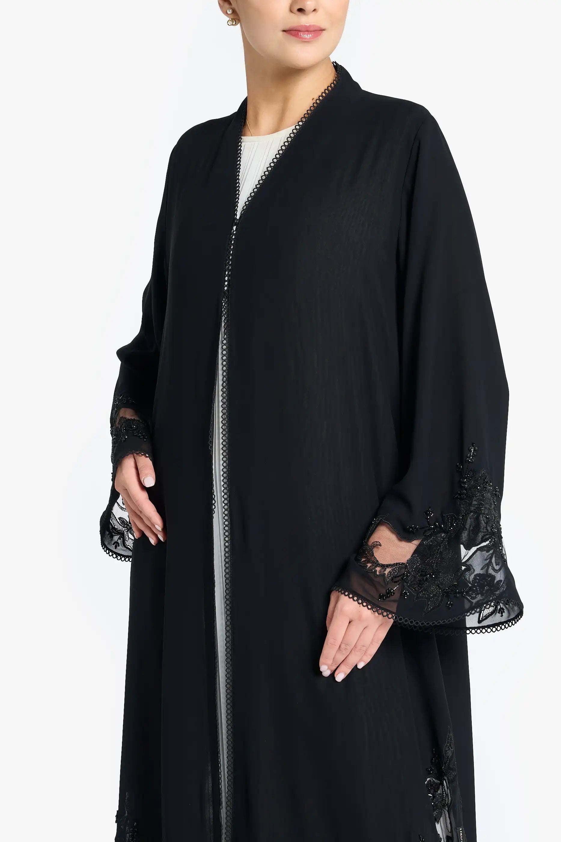 Louzan abaya crafted in double layered chiffon fabric with dori embroidery design, embellished with crystals and beads.