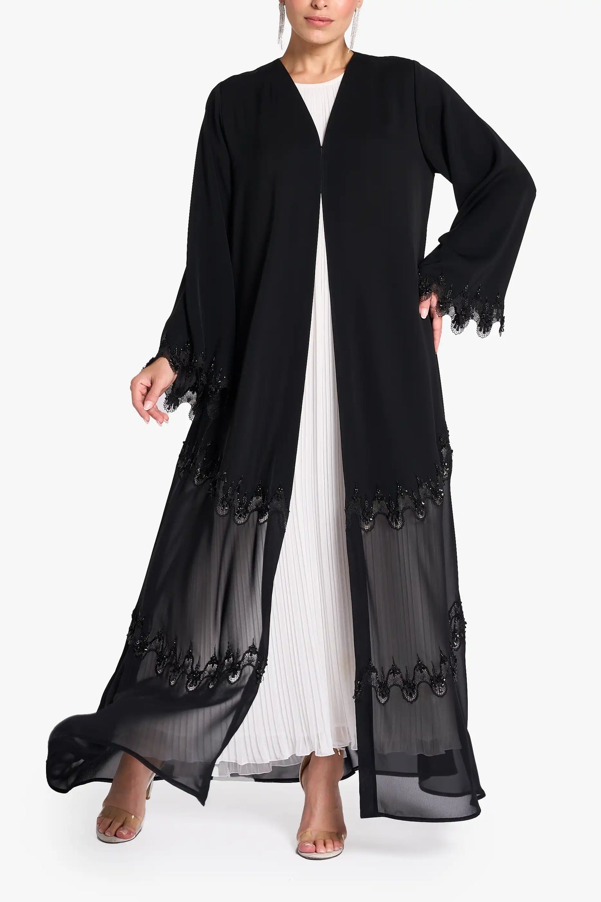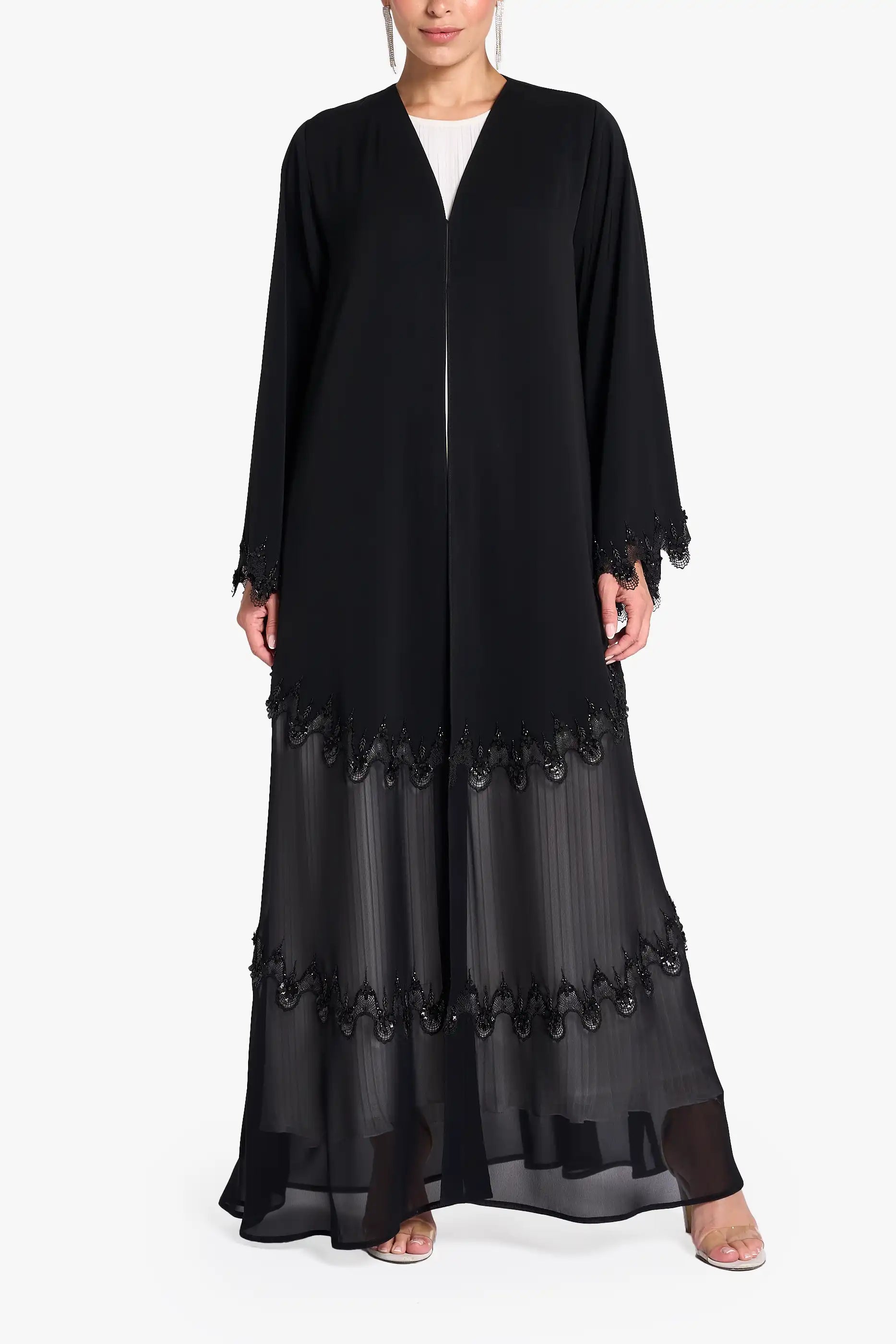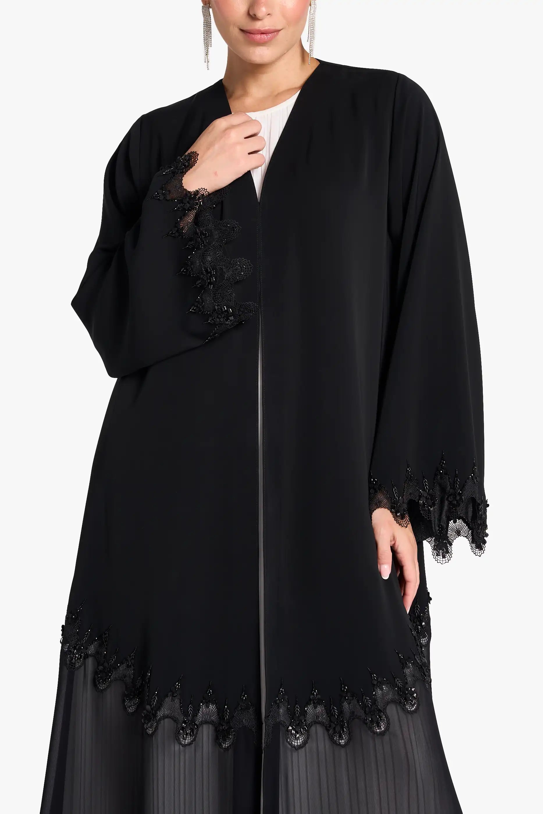 Loucan abaya crafted in nida and chiffon paneling with lace detailing, embellished with crystals and beads.