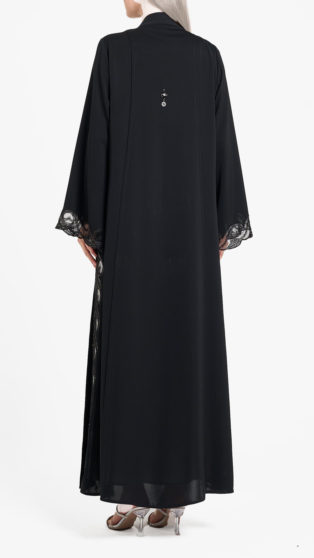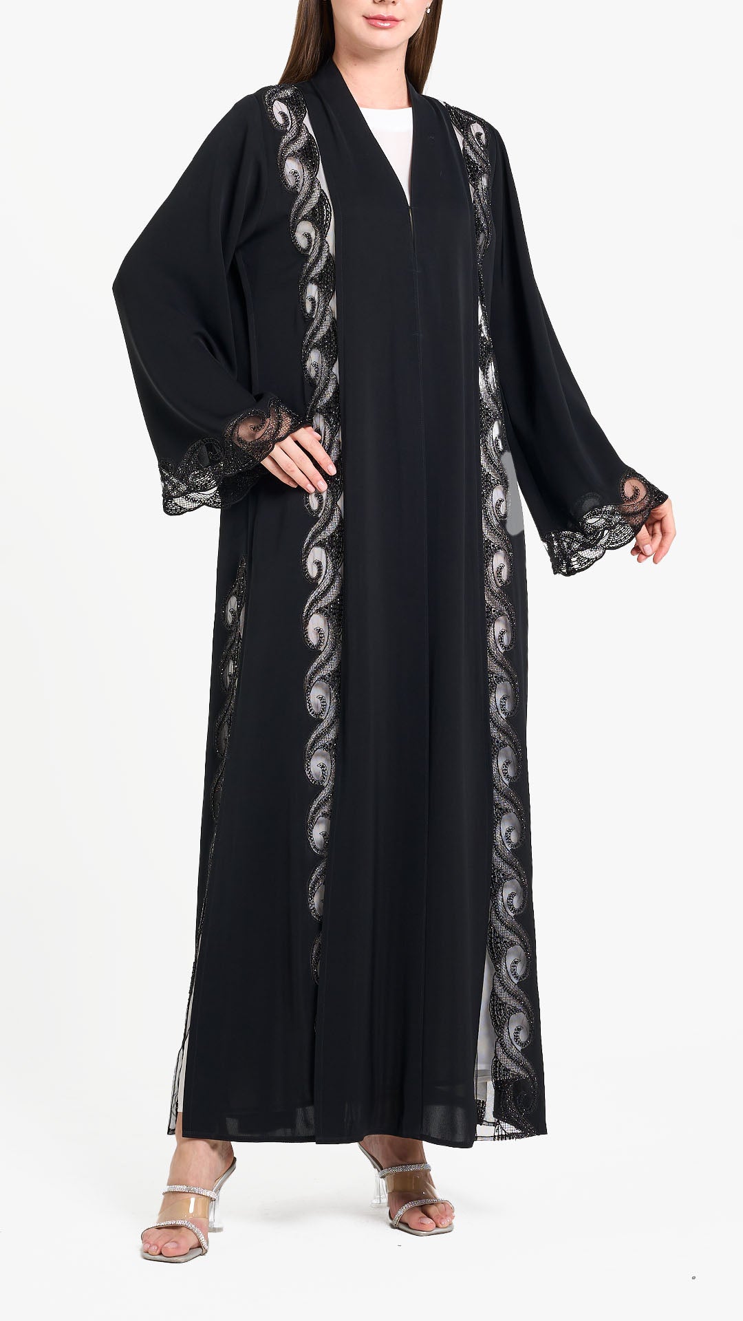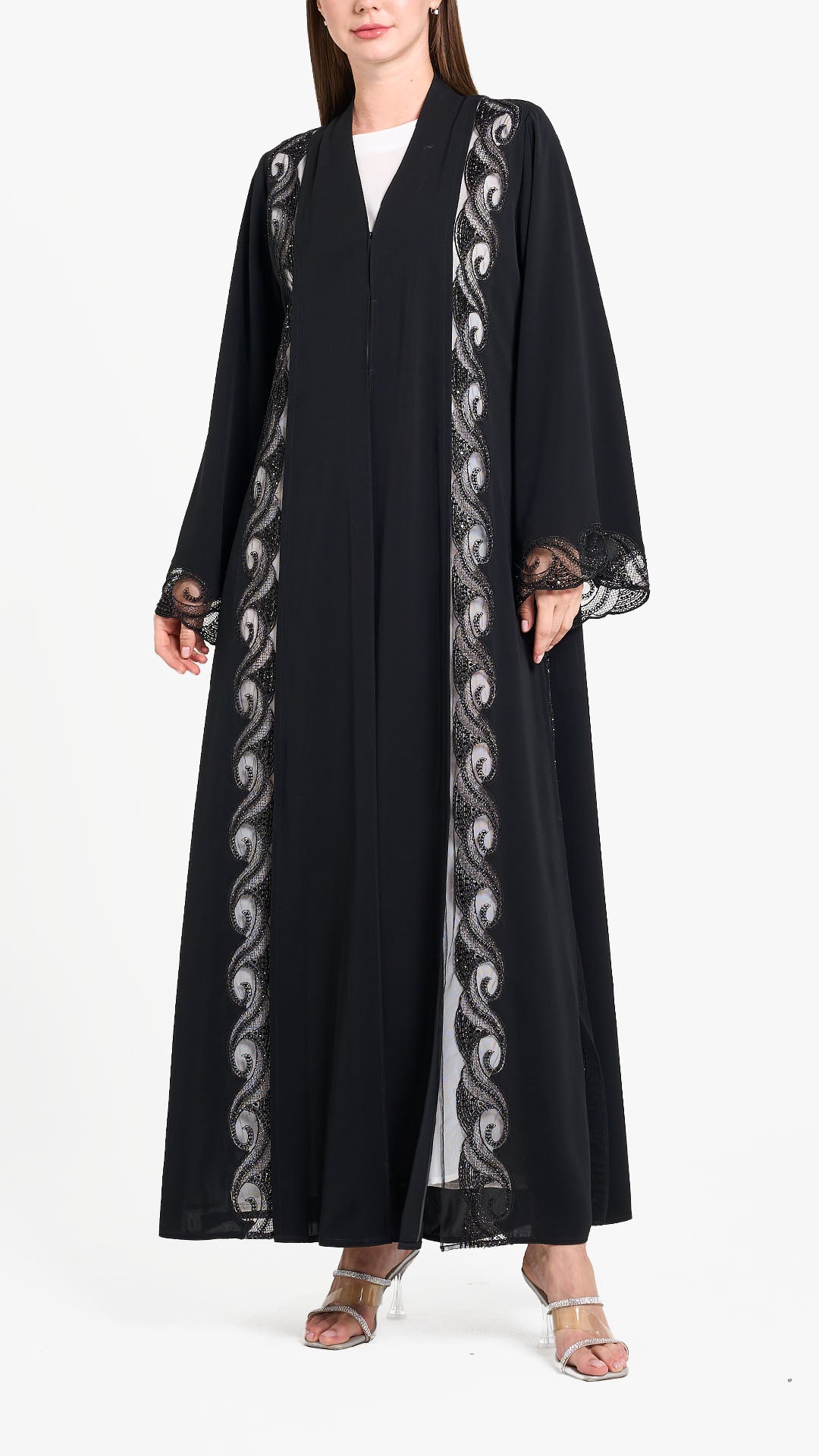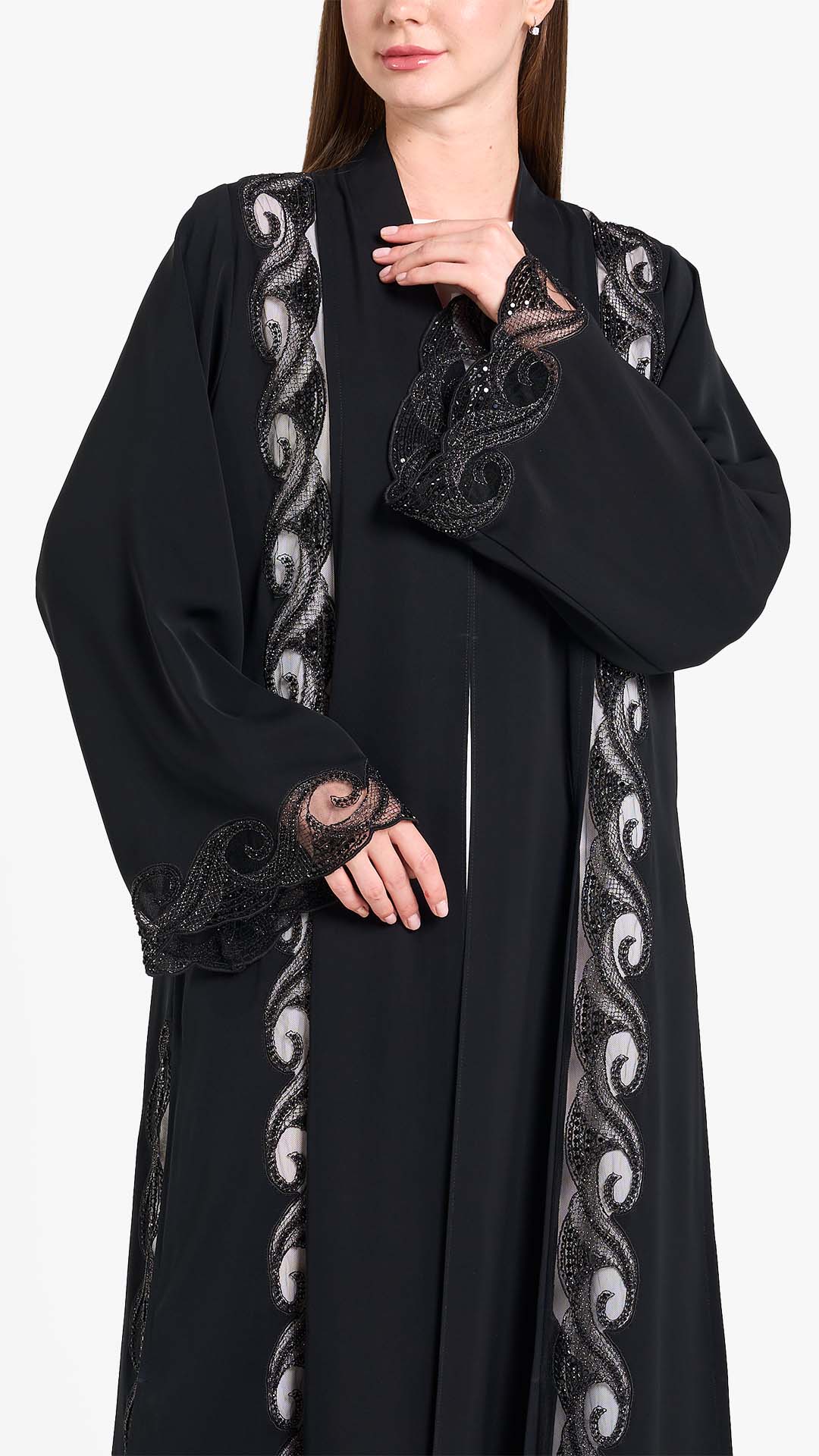 Louzan abaya crafted in nida and fabric with embroidered panel, embellished with beads and crystals.