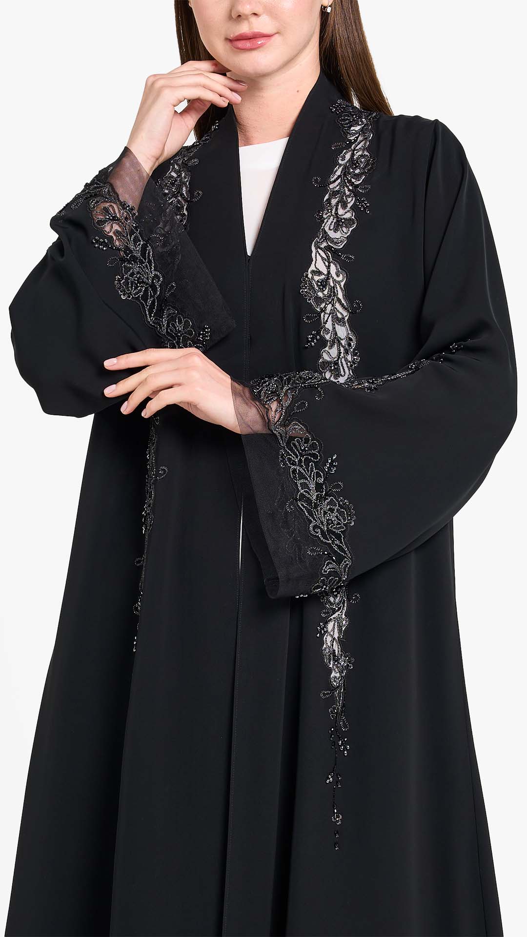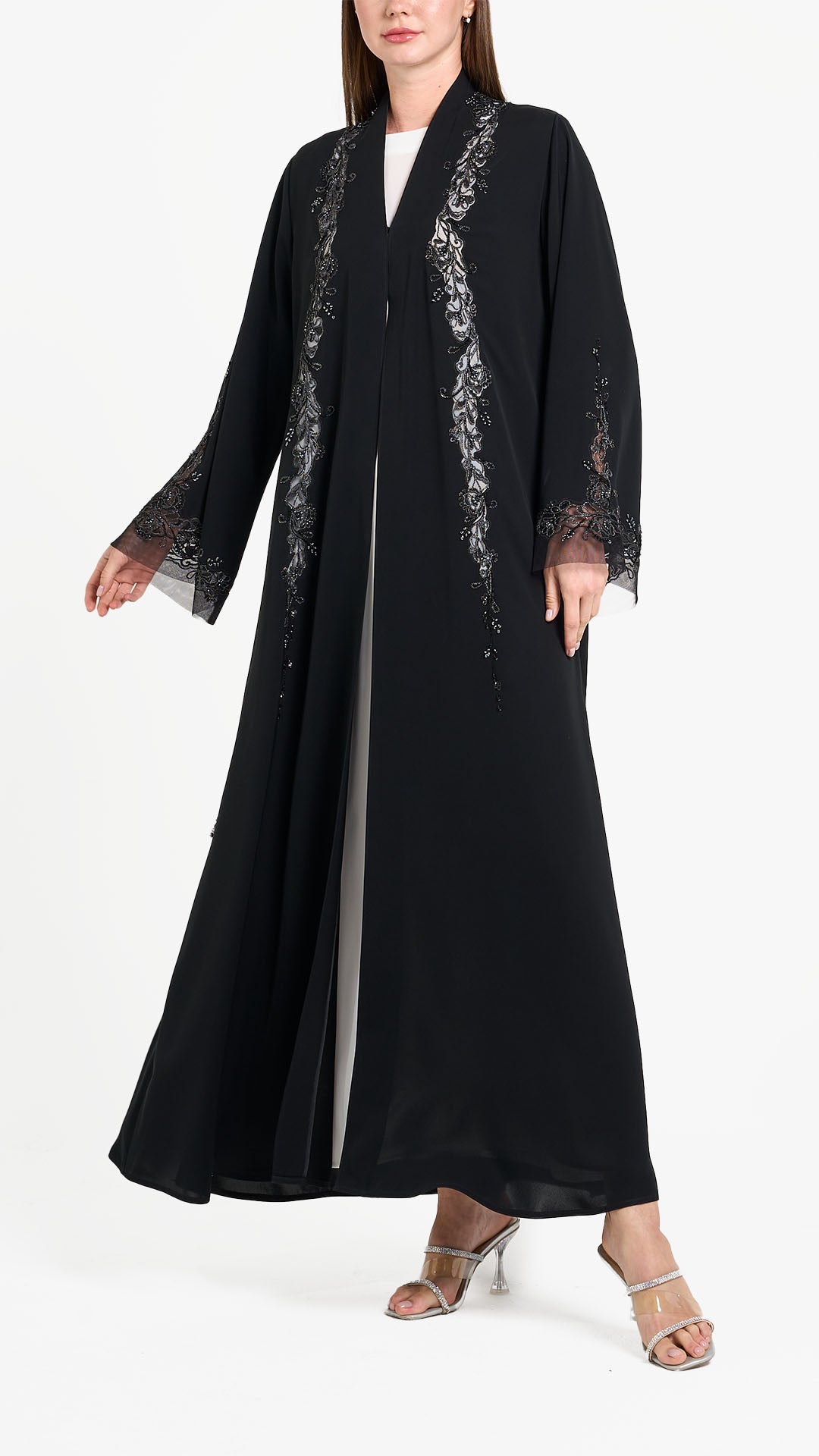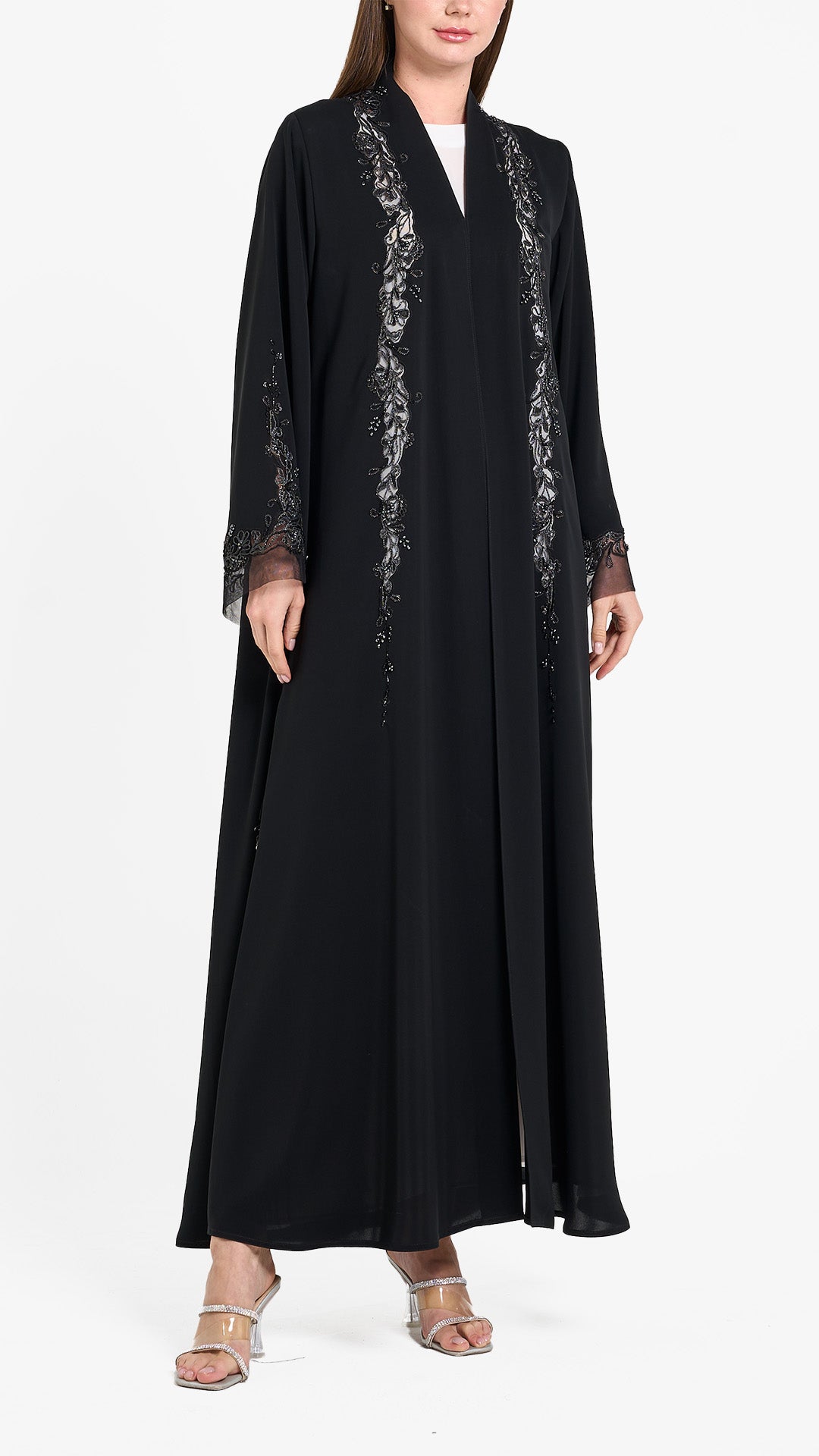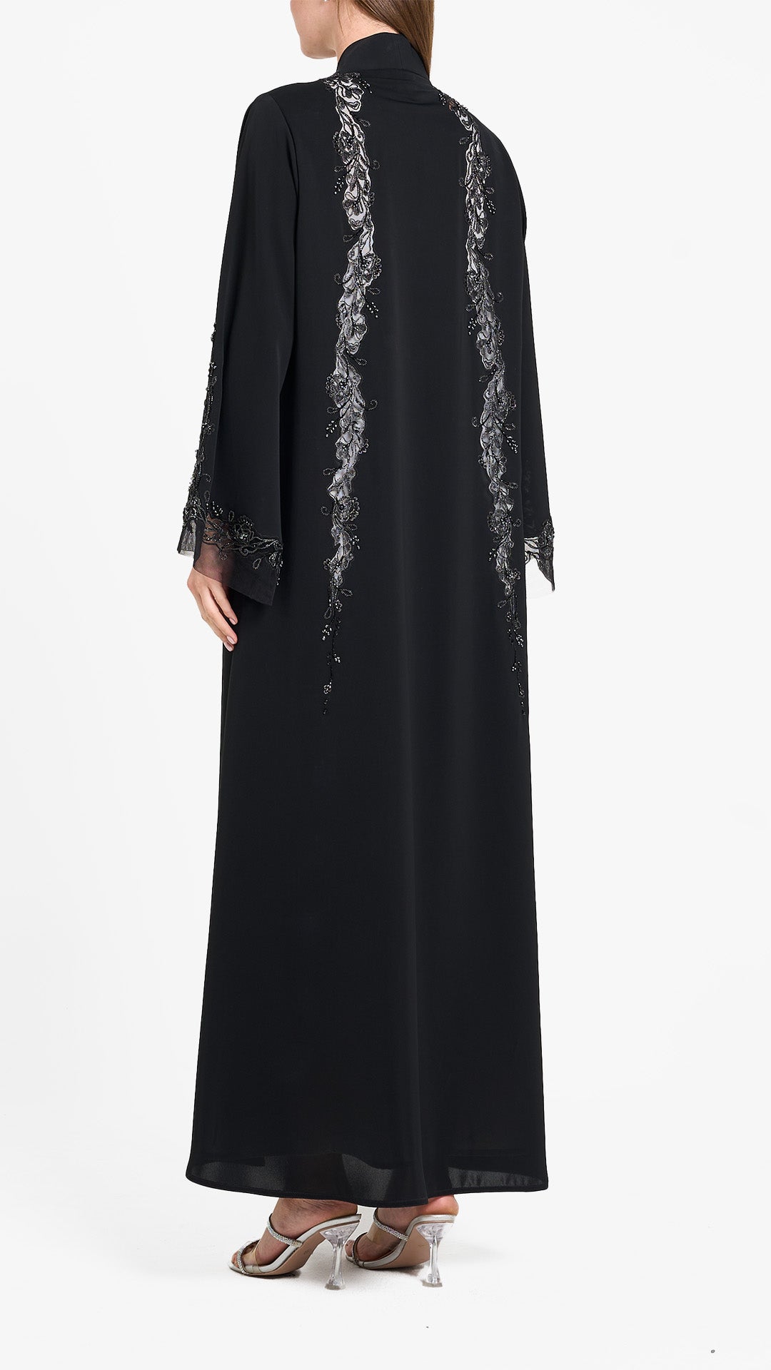 Louzan abaya crafted in nida and Toor fabric with layered design with embroidered panel, embellished with beads and crystals.